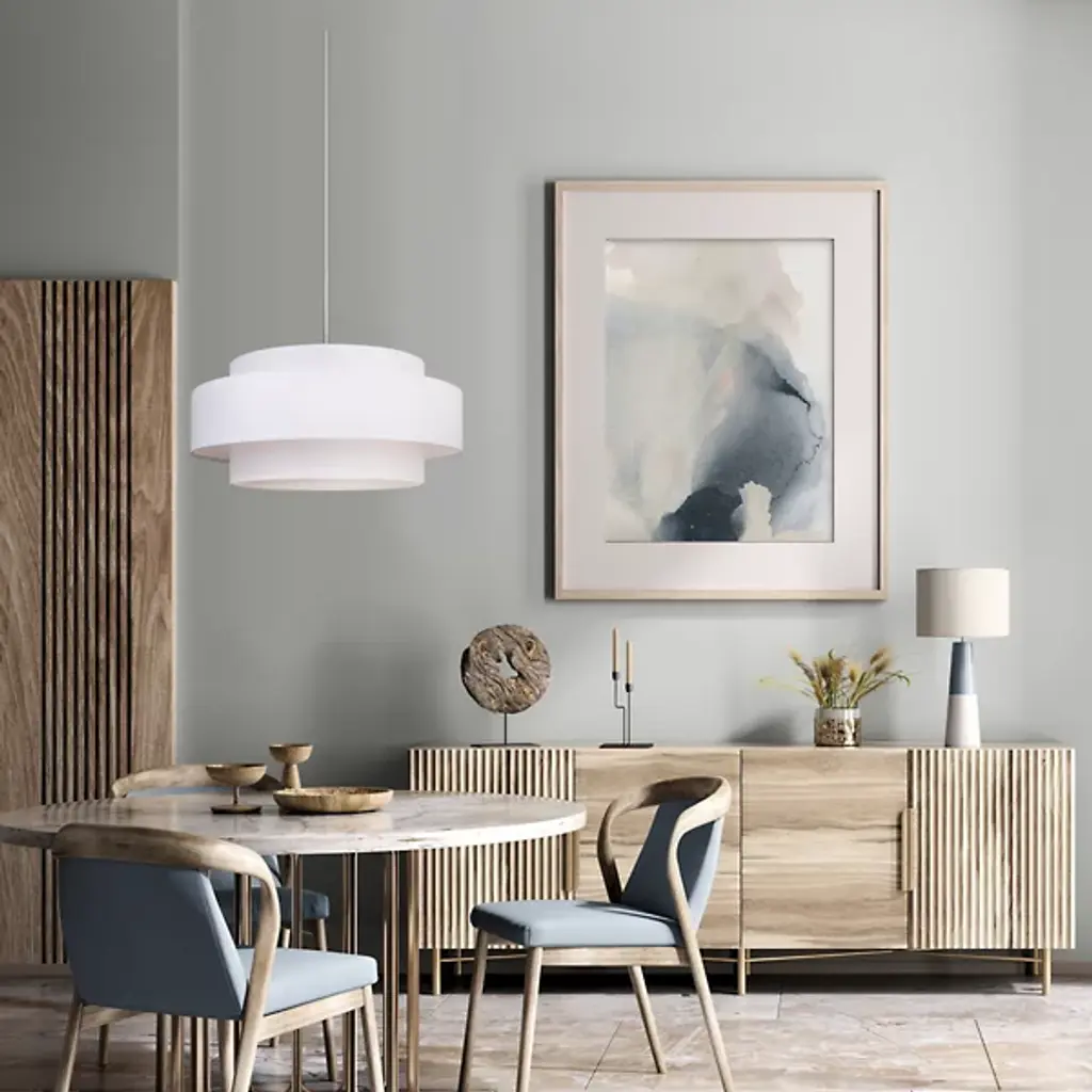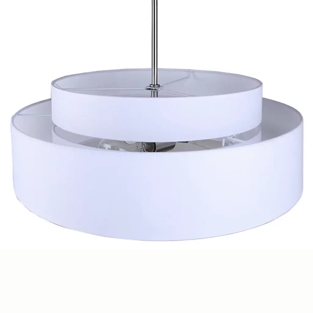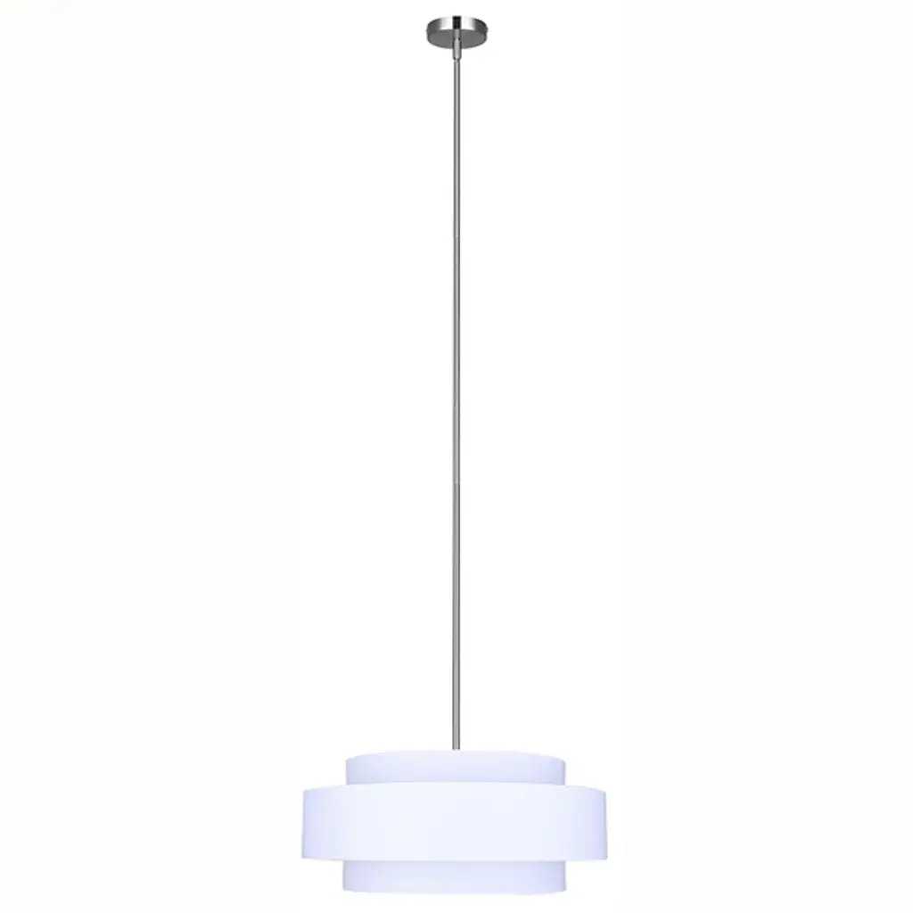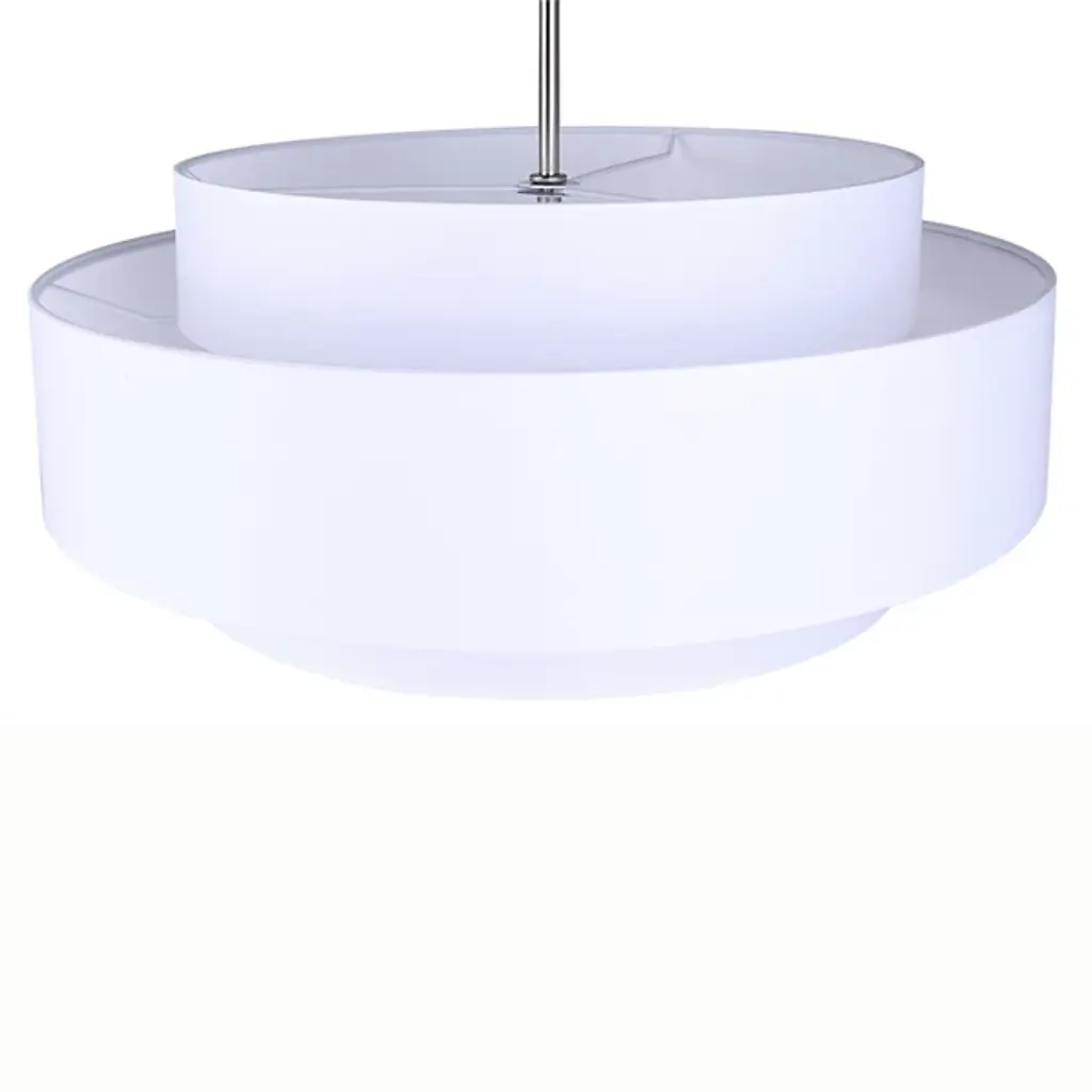 The Landra Double Pendant from Canarm presents a tiered drum shade design that creates visual intrigue through its layered composition. The shade's distinct levels create depth that typical single-layer pendants lack, adding architectural interest to dining areas and living rooms. Light filters evenly through the fabric drum, creating a gentle glow that eliminates harsh shadows in the room below. A single slender rod visually anchors the substantial shade, providing a sense of balance between the supporting structure and the primary design element. This fixture delivers a fresh interpretation of traditional drum pendant lighting through its multi-layered approach, bringing a new dimension to a familiar form.