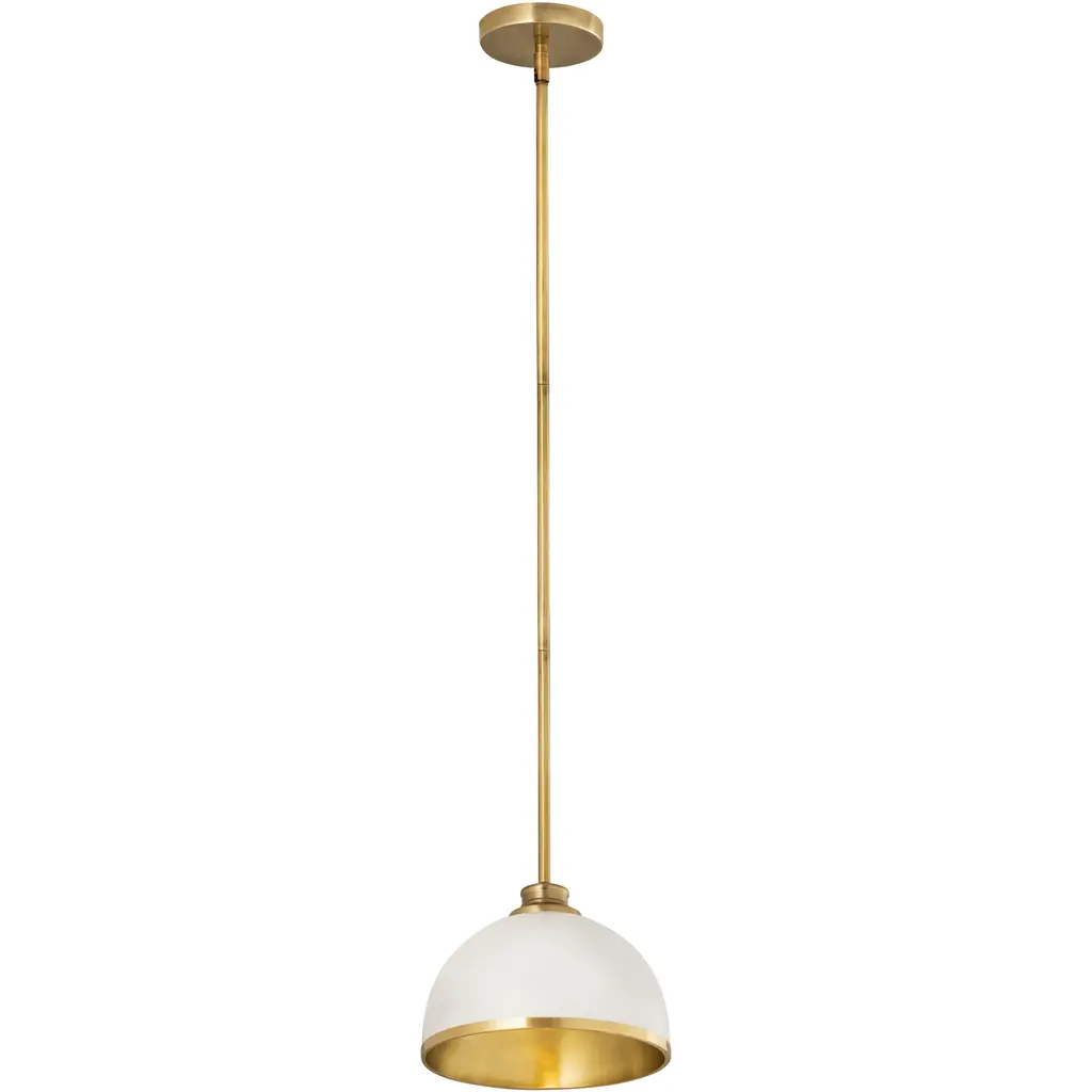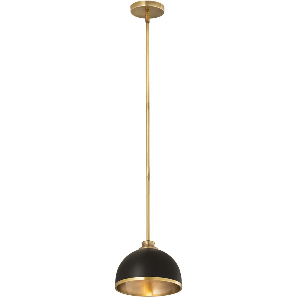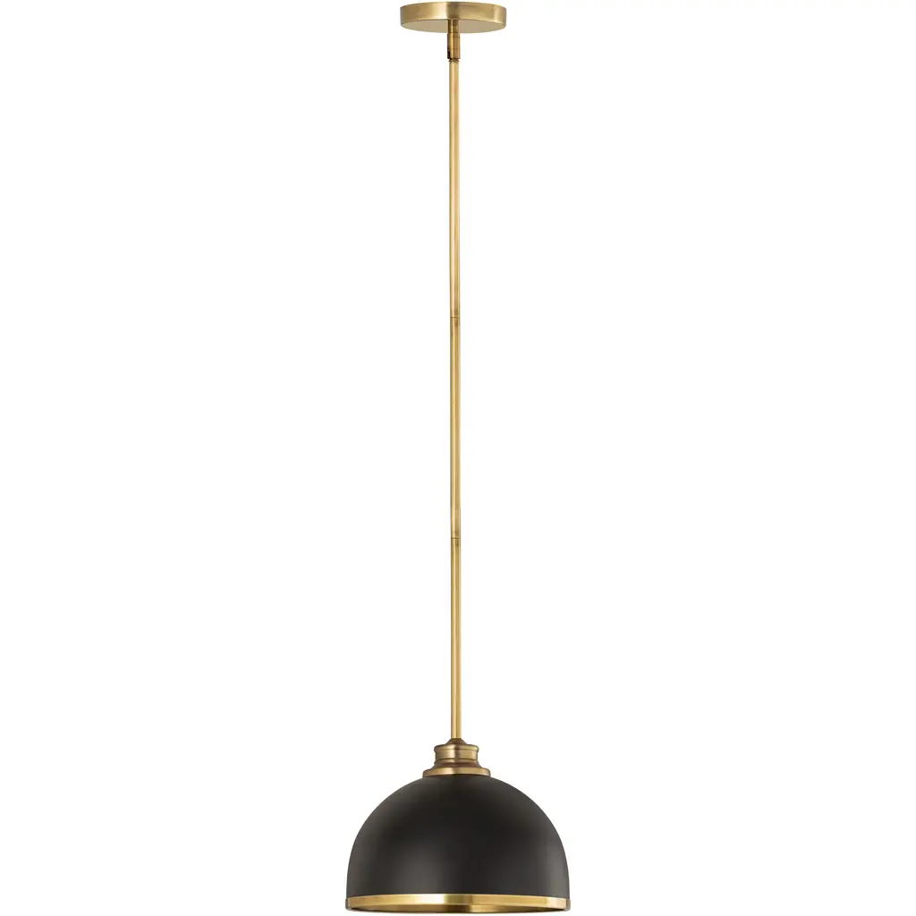 Easy elegance follows this domed metal one-light pendant with a crisp industrial influence and minimalist silhouette. A domed shade fashioned of matte black finish stainless steel is trimmed in warm rubbed brass finish metal with a rubbed brass finish down rod and canopy. This contemporary pendant is adaptable to a variety of decor schemes including farmhouse, modern industrial, and urban modern.