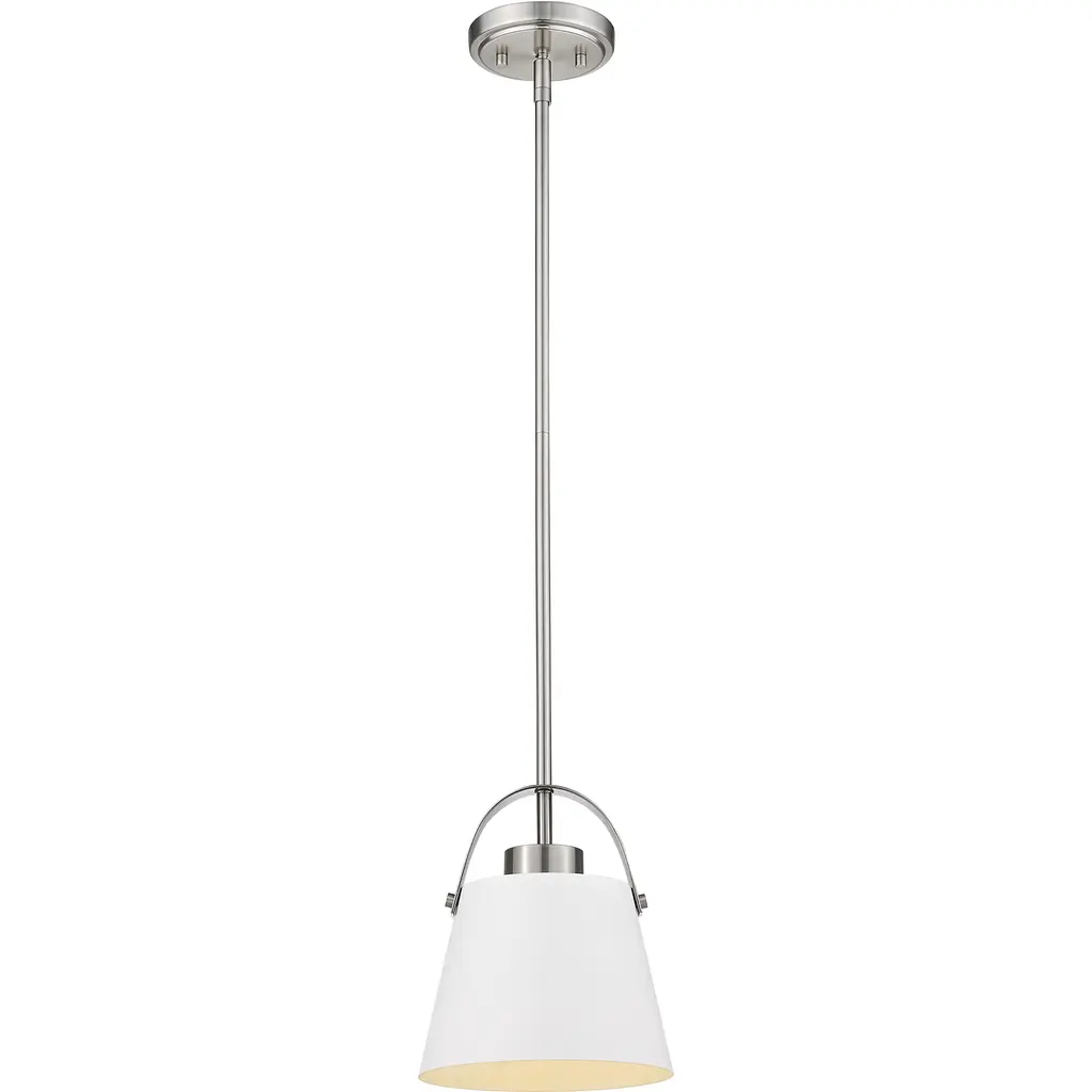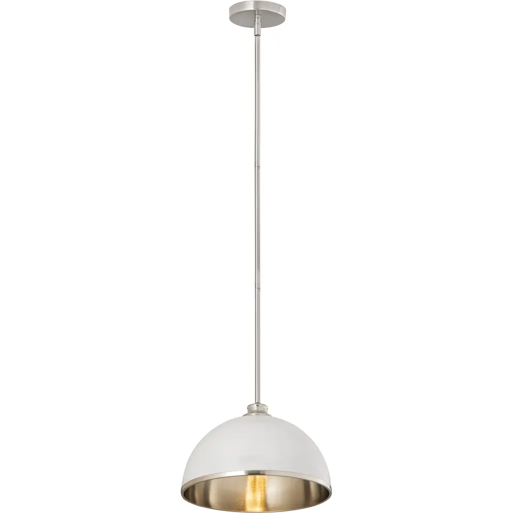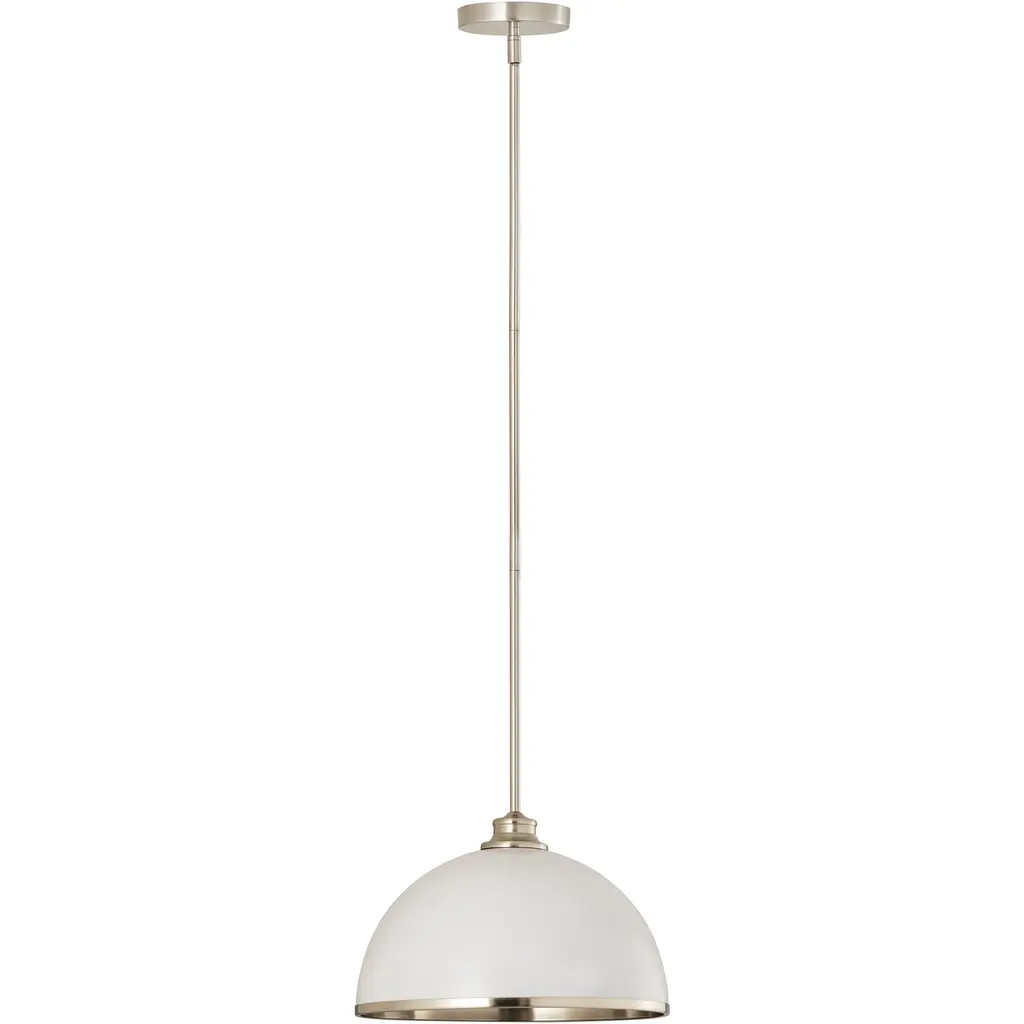 Chic, modern vibes add a stunning look to a custom kitchen, living space, or bedroom with this domed metal one-light pendant. A domed shade crafted of matte white finish stainless steel is trimmed in brushed nickel finish metal with a brushed nickel finish down rod and canopy. This updated pendant is suitable for a variety of decor schemes including farmhouse, modern industrial, and urban modern.