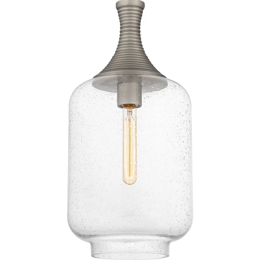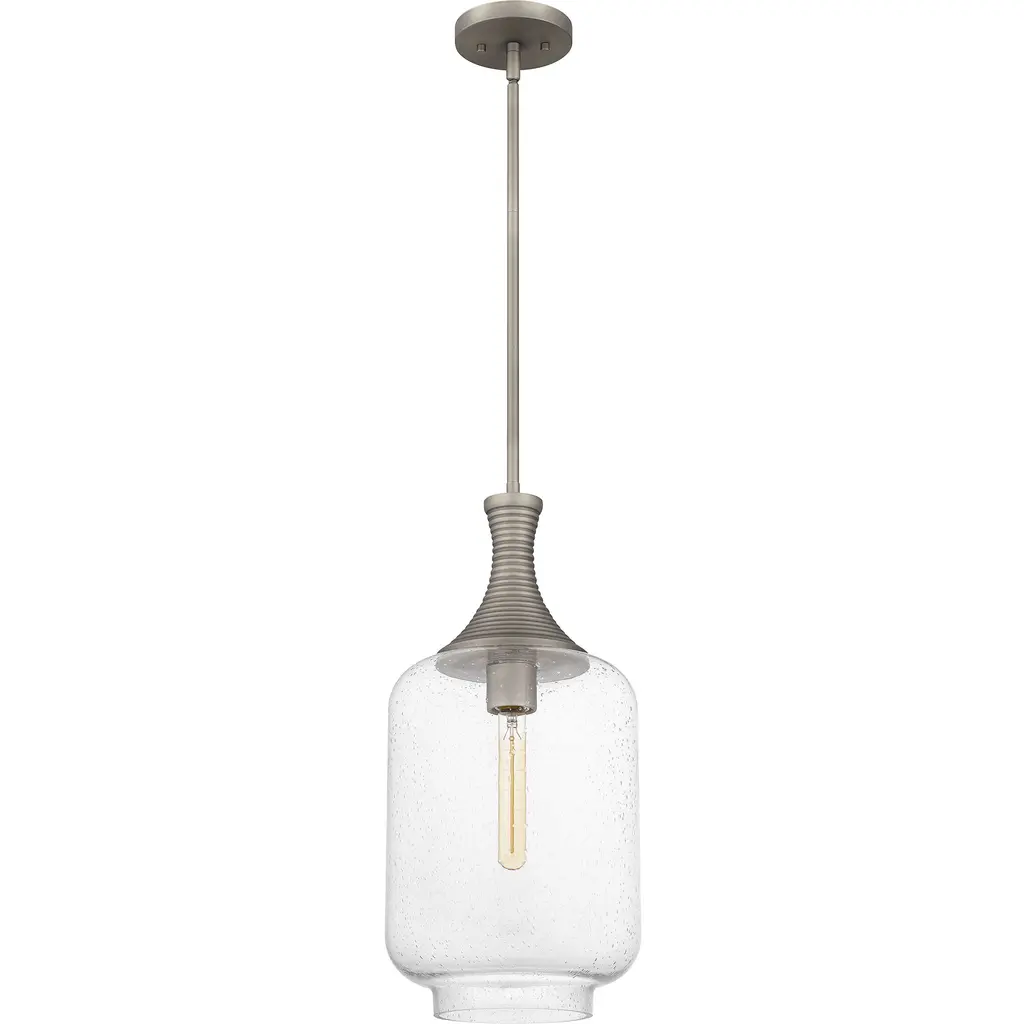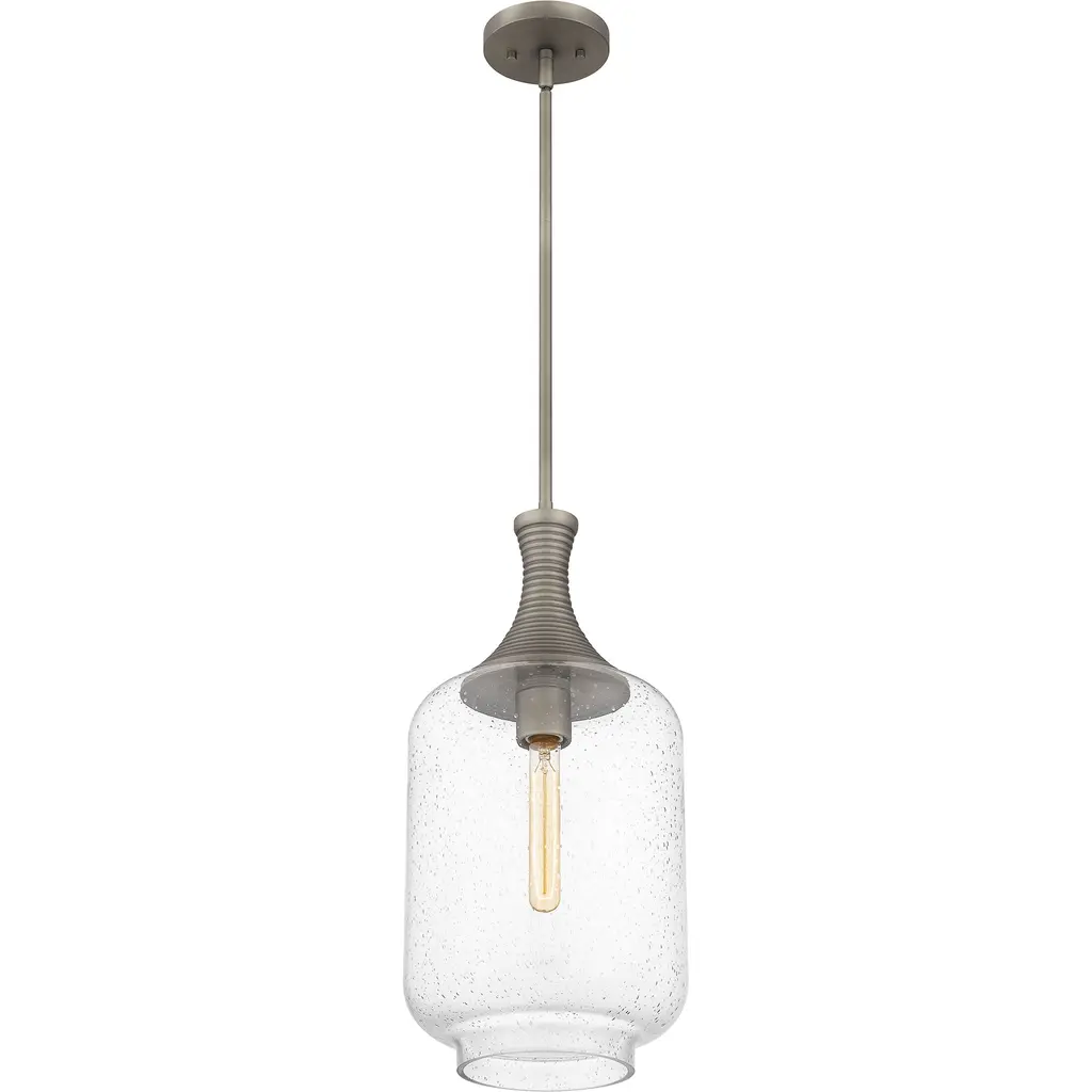 Clear seedy glass adds major visual intrigue in the Langley pendant. The cylindrical shade opens at the bottom for streamlined illumination and easy access, while the ribbed antique nickel finish adds an artful flair to the top of the shade. Hang Langley alone or in a grouping over a kitchen island, bar area, or table.