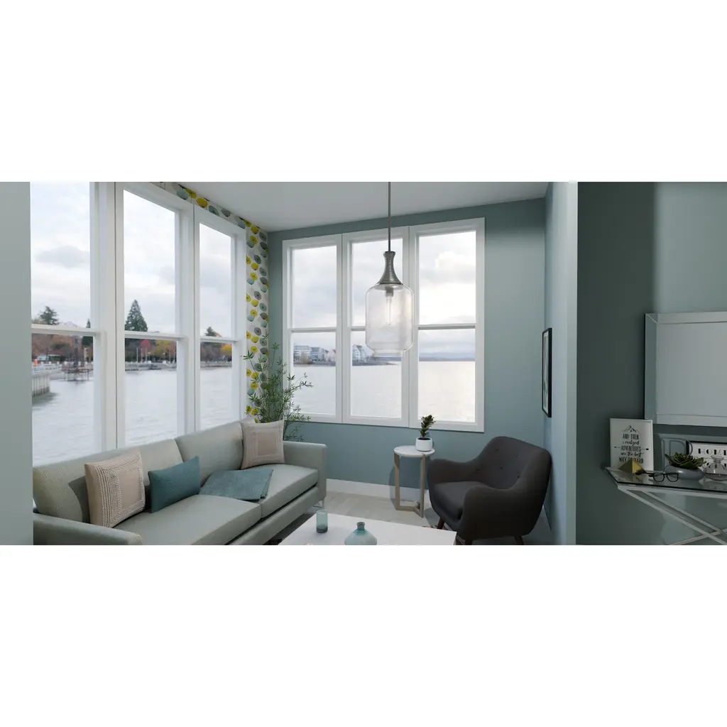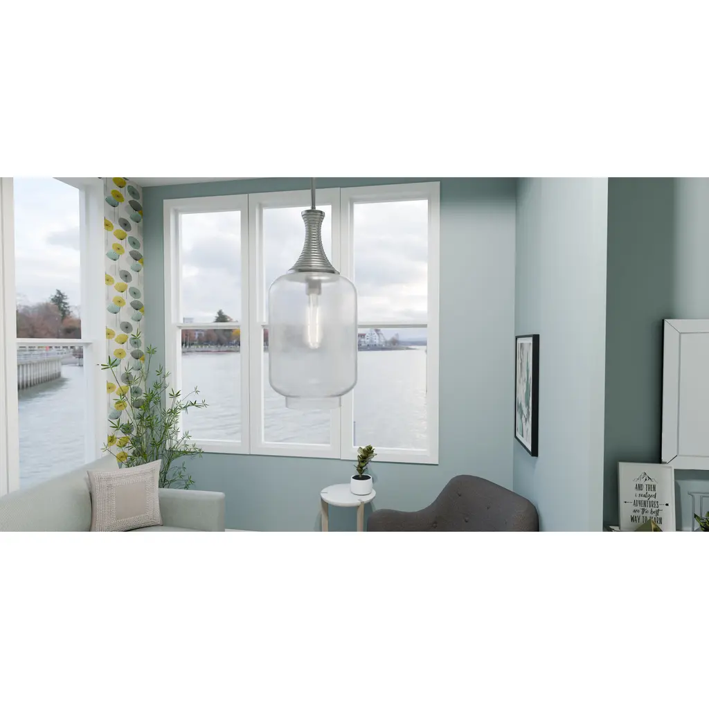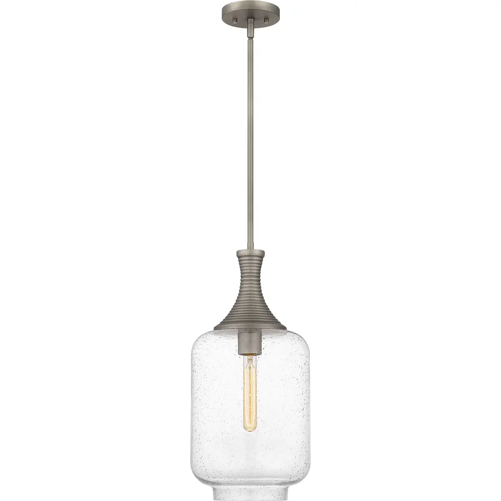 Clear seedy glass adds major visual intrigue in the Langley pendant. The cylindrical shade opens at the bottom for streamlined illumination and easy access, while the ribbed antique nickel finish adds an artful flair to the top of the shade. Hang Langley alone or in a grouping over a kitchen island, bar area, or table.