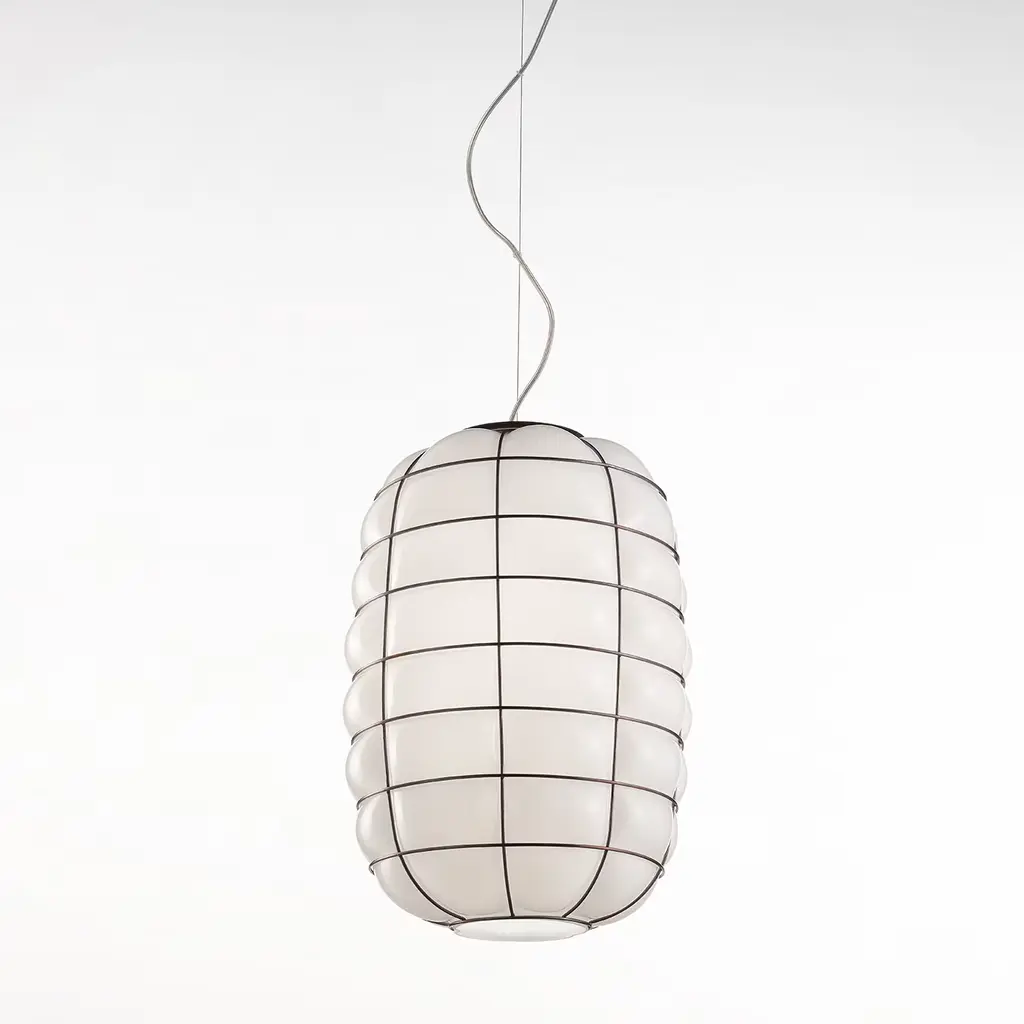 This elegant ceiling lamp is in the shape of a lantern, reminiscent of the centuries-old tradition of these iconic objects crafted in Venice. This modern interpretation features a bronzed steel cage into which white Murano glass is mouth-blown to create a delicate object that seems to be made of air. This sophisticated and minimalist piece will suit any decor, particularly a contemporary one. The lightbulb is E27 150W max, also available UL E26 with 60W max. Due to handcrafting, slight changes in metal's finish may occur.