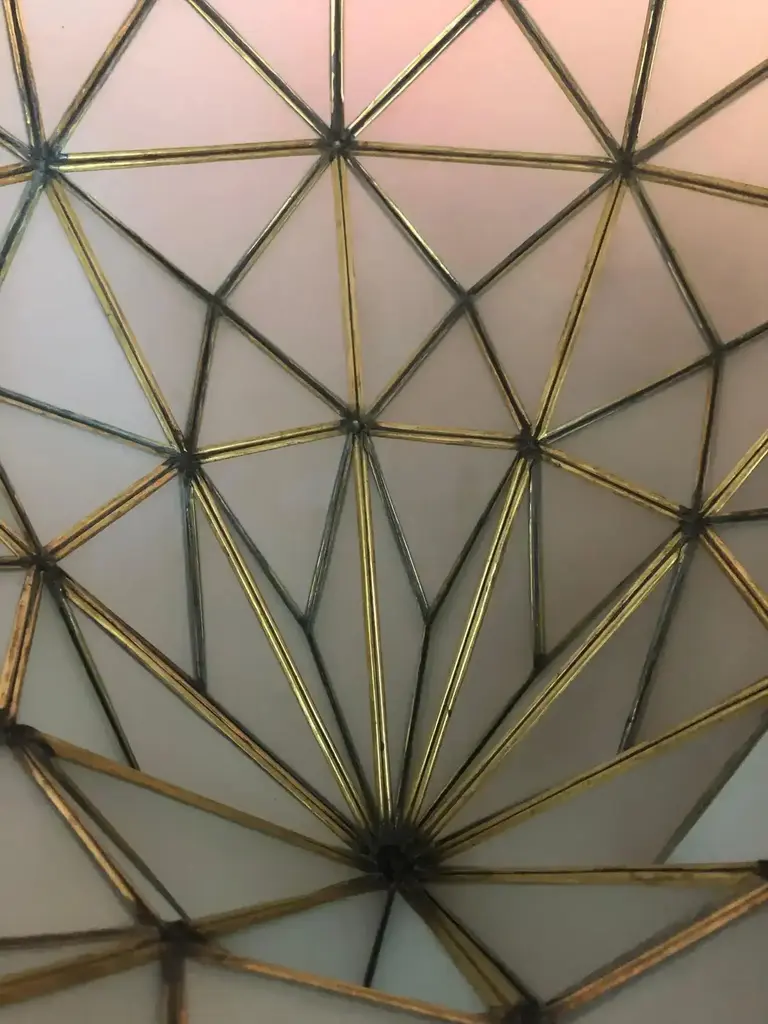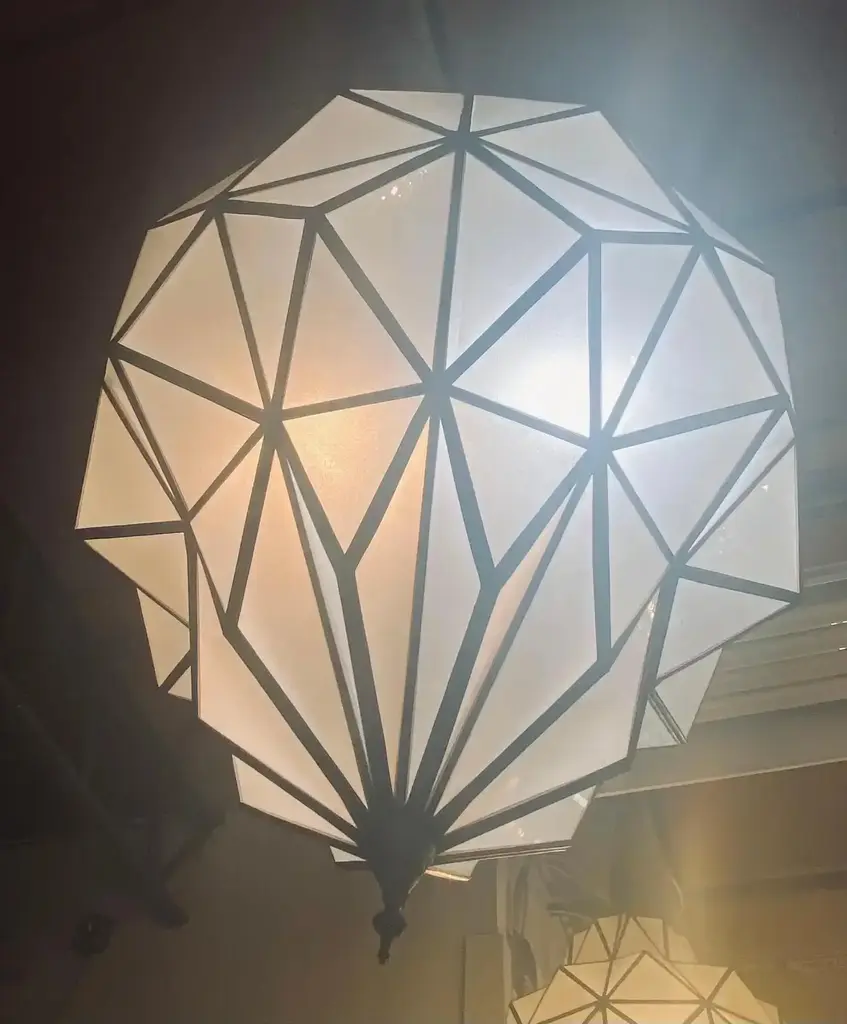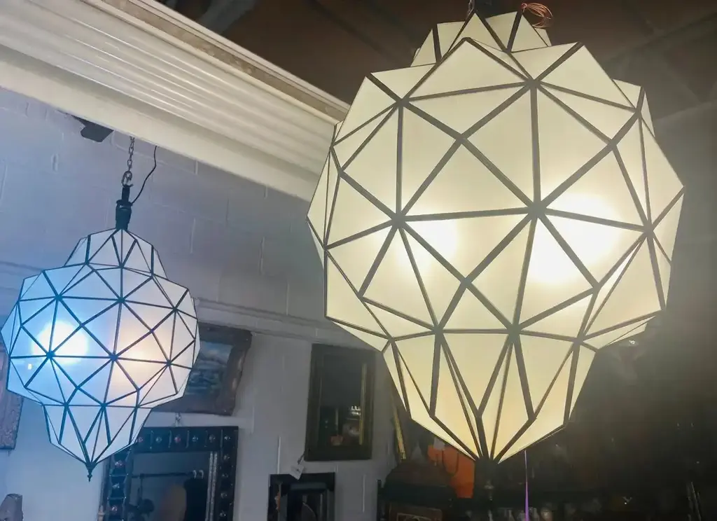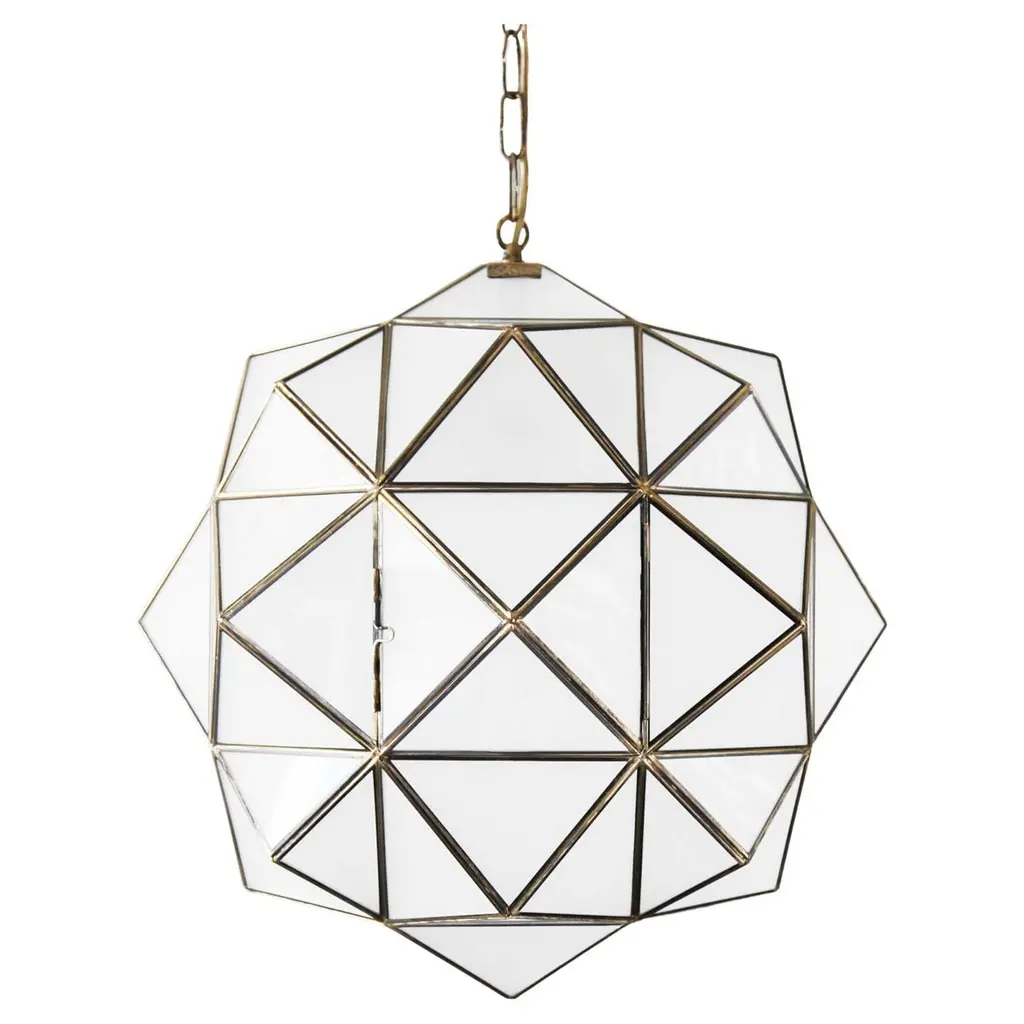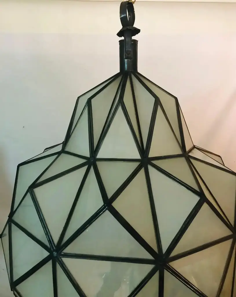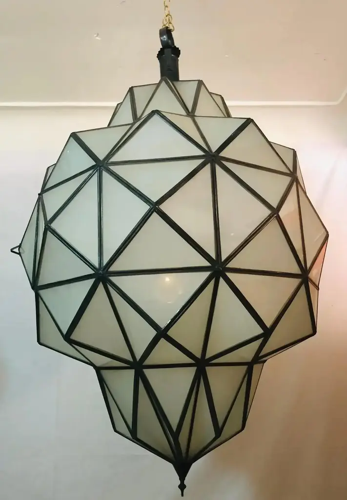 A stunning Art Deco style dome form milk glass white chandelier or lantern. Having individual hand cut panes and possessing an open door pane leading to a double recently wired setting housing two sixty watts bulbs. The handmade Art deco chandelier or lantern will add style and elegance to any space or design. Dimensions: 32" H x 22" D
