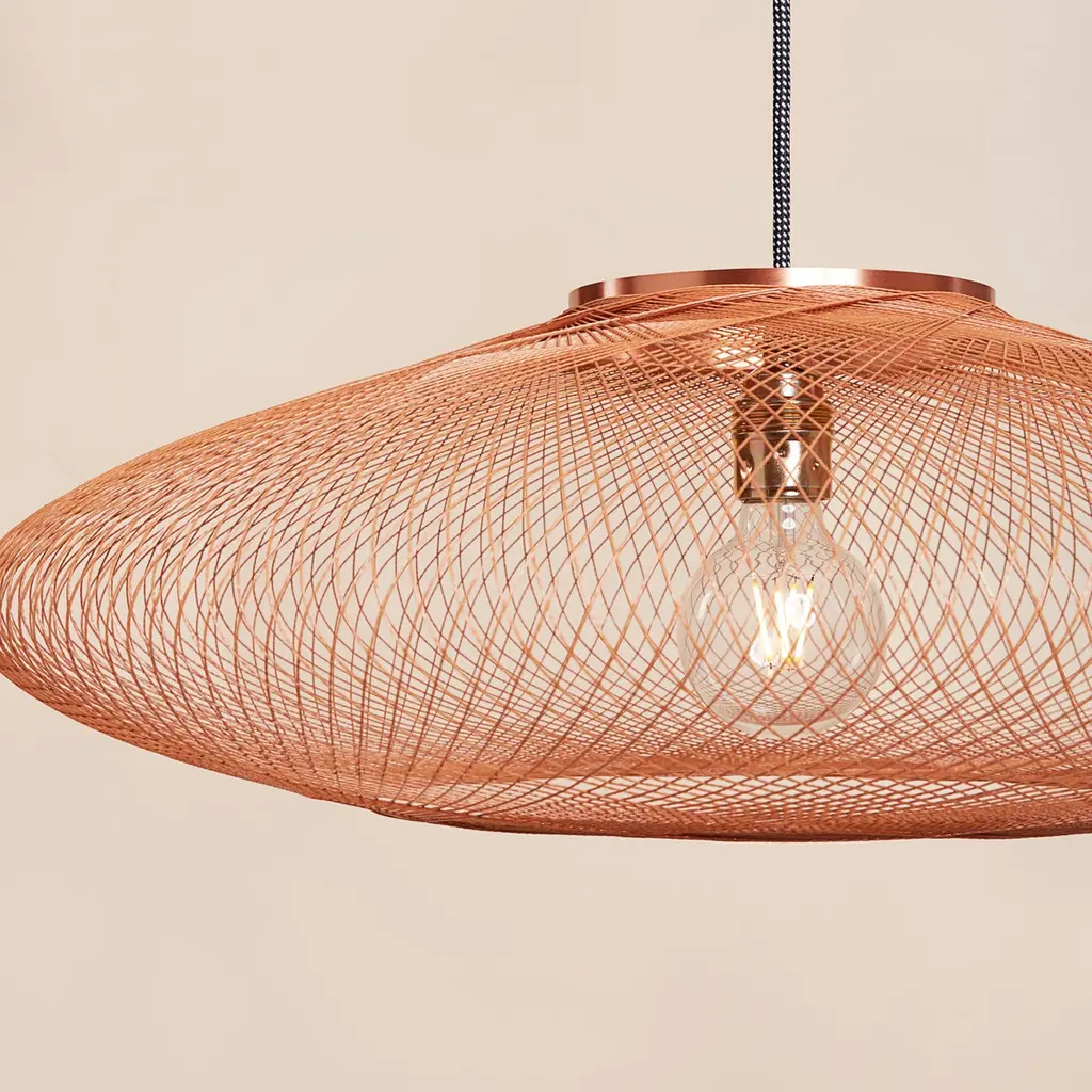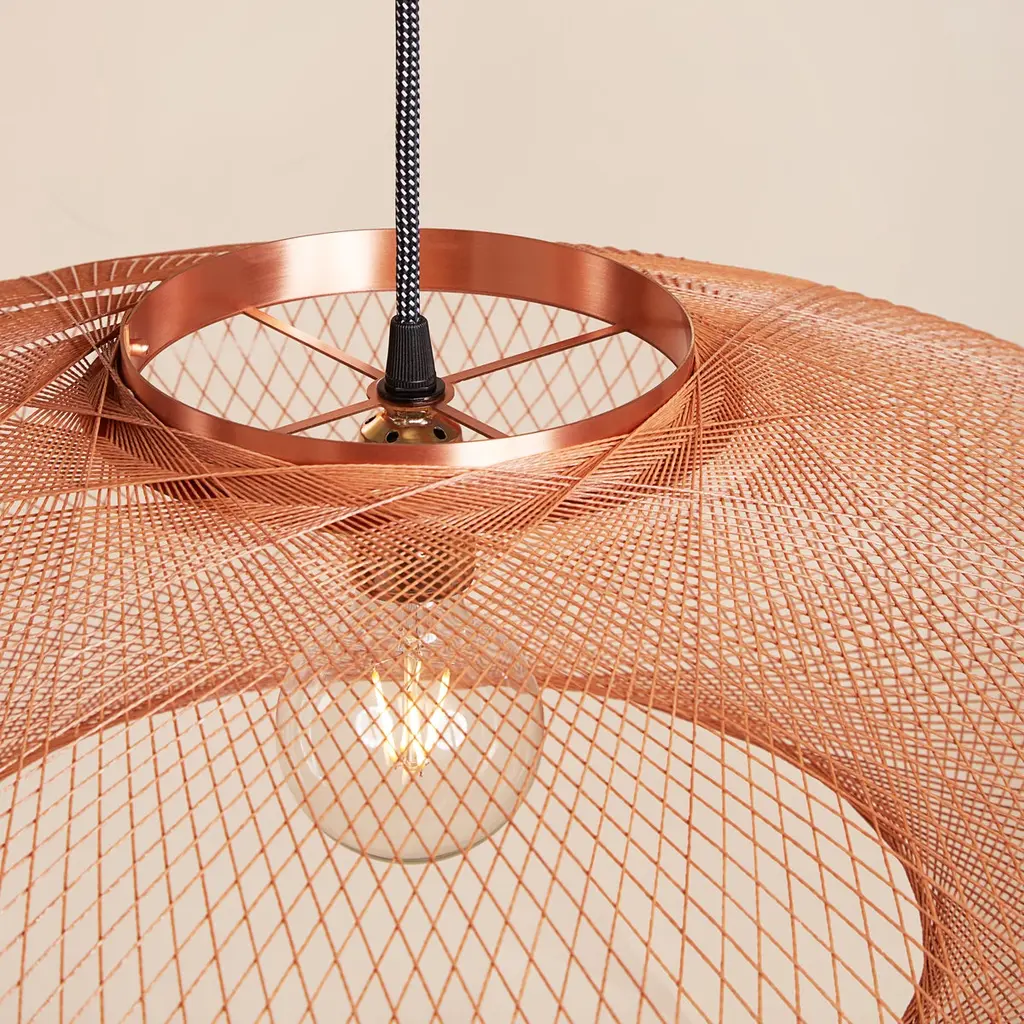 Large copper UFO pendant lamp by Atelier RobotiqDimensions: D 80 x H 24 cmMaterials: Resin-impregnated industrial fiber, brass.Available with holder in copper/ brass/ black coated stainless steel.Available in different colors, 3 sizes, and in Full pattern or Open pattern.All our lamps can be wired according to each country. If sold to the USA it will be wired for the USA for instance.For the Fiber Pattern Lamp series we experiment with robotic weaving techniques. The geometrical weave patterns are designed using mathematical models and manufactured with an industrial robot.The Fiber Pattern Lamp is made of resin-impregnated f ibers. The fibers are wound with a industrial robot around a mold in geometric patterns. The result is a mesmerizing lightweight and strong lamp.Atelier Robotiq is a Rotterdam based design company founded by Søren Blomaard andAnne-Lise Heydra.Their different backgrounds combining robotics, aerospace engineering, product design and fine arts leads to unexpected and exciting products.For their mesmerizing Fiber Pattern Lamp series they experiment using an Aerospace fiber winding technology and an industrial robot for weaving light and open fiber structures. Our Fiber Pattern Lamps are being manufactured in the mini-factory in the city center of Rotterdam.The team of Atelier Robotiq loves to experiment with new materials and truly get to know a production process, learning new things and taking time for ideas and designs to grow and mature.