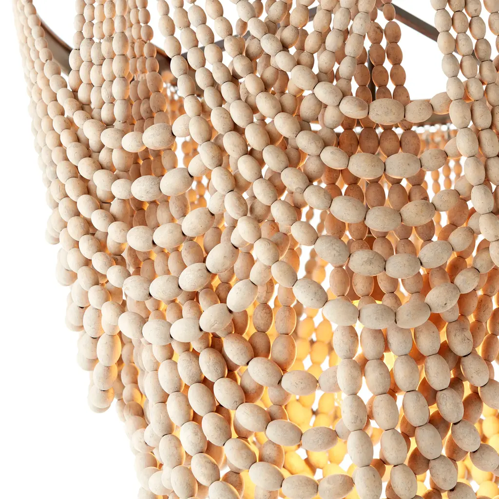 Offer an exotic upgrade to a living or dining space. Looped wood beads in a creamy finish add a fun touch and produce intriguing lighting effects. This large tinted raw iron and wood pendant stands out as an artful and interesting fixture.
