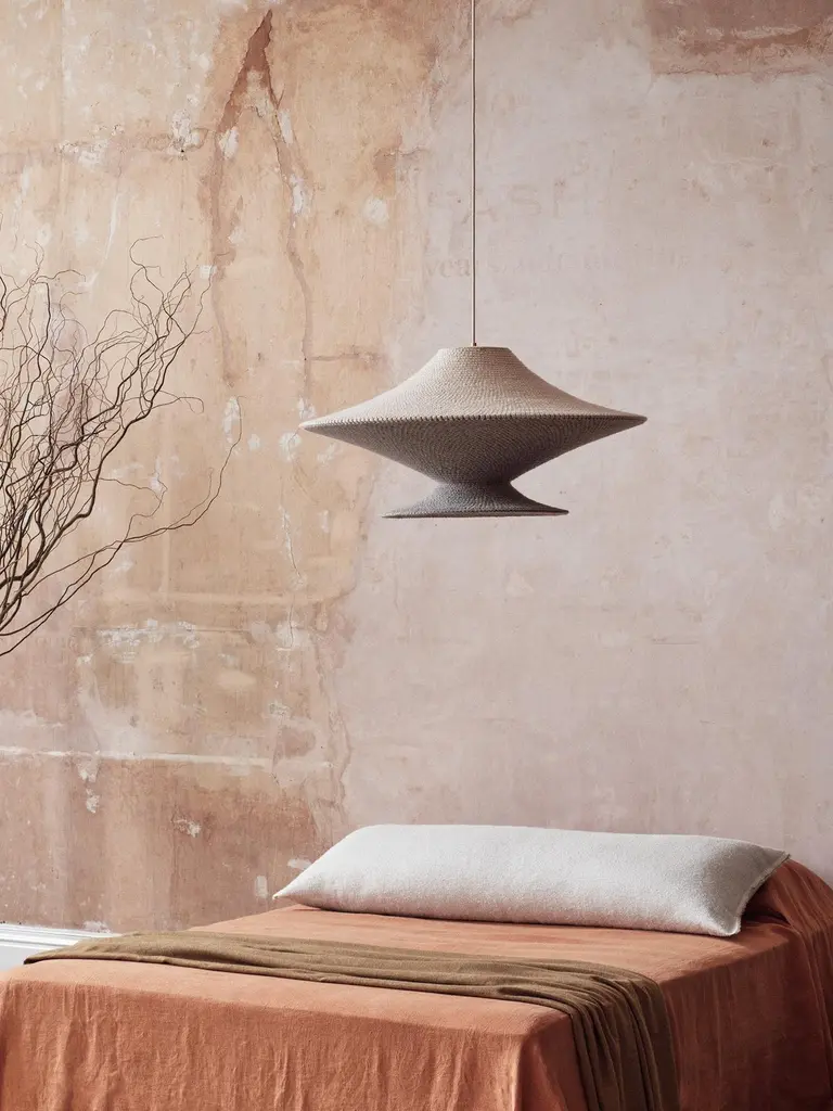Large Jupe solitaire pendant lamp by Naomi PaulDimensions: D 80 x H 44 cmMaterials: Metal frame, Egyptian cotton cord.Color: Ecru.Available in other colors and in 4 sizes: D50, D60, D80, D100 cm.Available in plain, two tone or bamboo color finishes.A diffused atmospheric light. JUPE SOLITAIRE is a statement pendant suited to bedroom and social spaces.Naomi Paul is a London design studio where hand crochet is elevated from craft to art.Naomi Paul’s lighting designs are unique. Iconic silhouettes combine with functional integrity. Together with her highly skilled team, the studio is dedicated to perfection.The crocheted lighting collections include simple and statement pendants. Luminescence and acoustics are enhanced by uniform stitching and quality of the fabric. Each piece glows with a warm ambience, a result of the time, care and attention to detail invested by hand-making.Collaborating with internationally renowned architects and interior designers, Naomi Paul’s designs transform spaces into exceptional places.All our lamps can be wired according to each country. If sold to the USA it will be wired for the USA for instance.