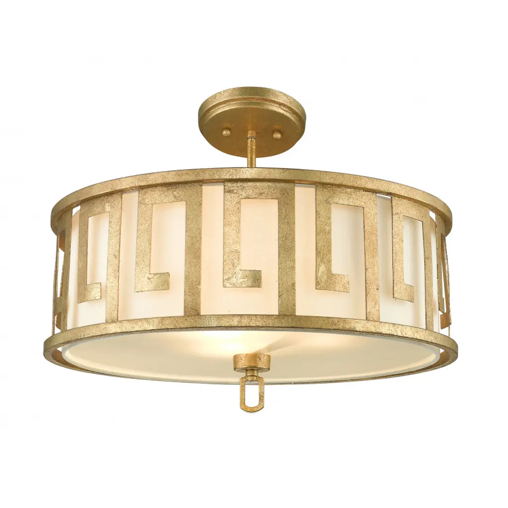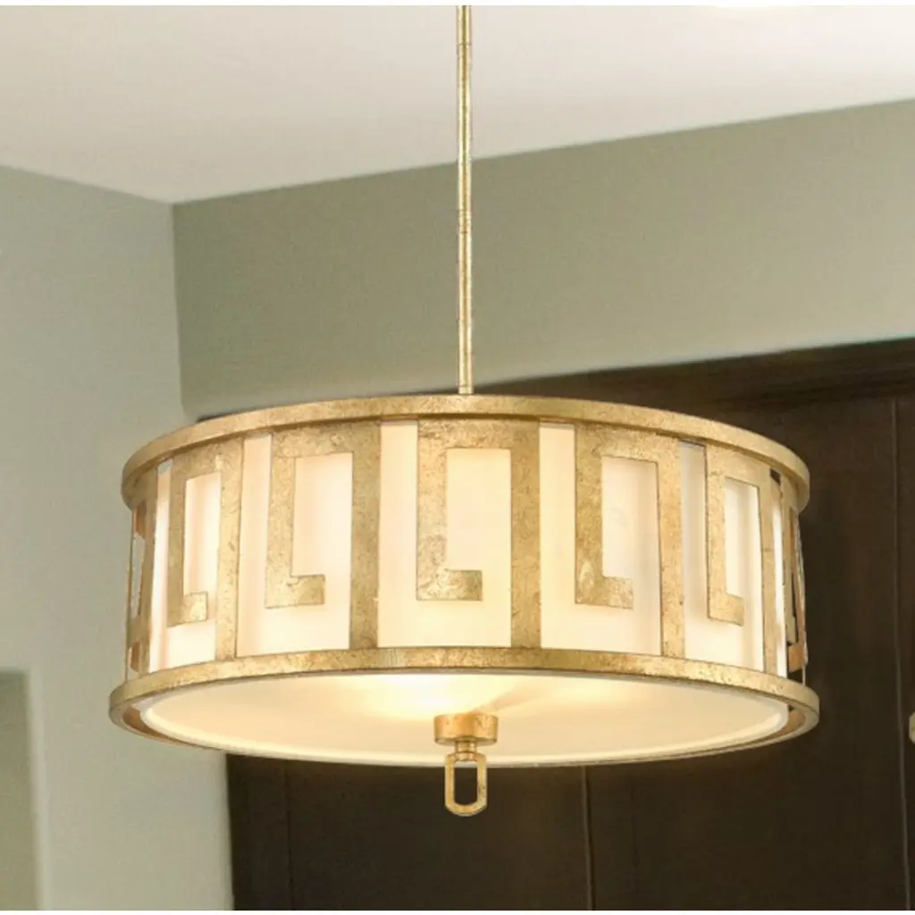 Our Flambeau inspired island pendant is designed with a classic trellis like metal outer drum with an ivory linen inner shade made into a hanging shaded adjustable pendant creating a striking focal point. In the latest neutral tones of gold and cream, it is the perfect addition to your bedroom, kitchen, or over your bar. We finished this pendant off with a white acrylic diffuser for soft light without the glare. Our Large Lemuria Pendant is shipped with extra stems for adjustable length, and can be installed as a semi-flush mount fixture for use in hallways and closets.