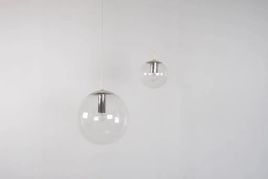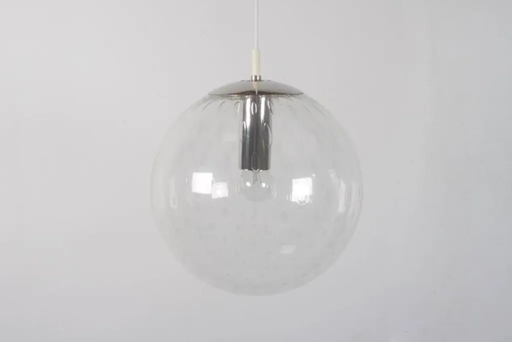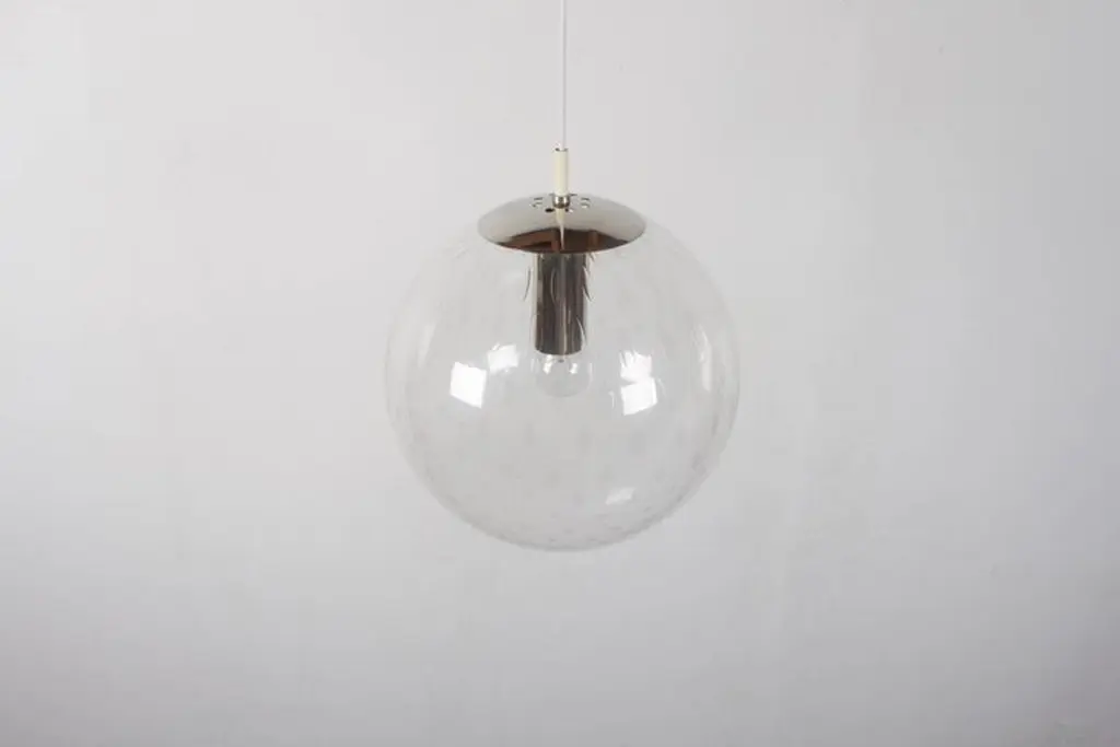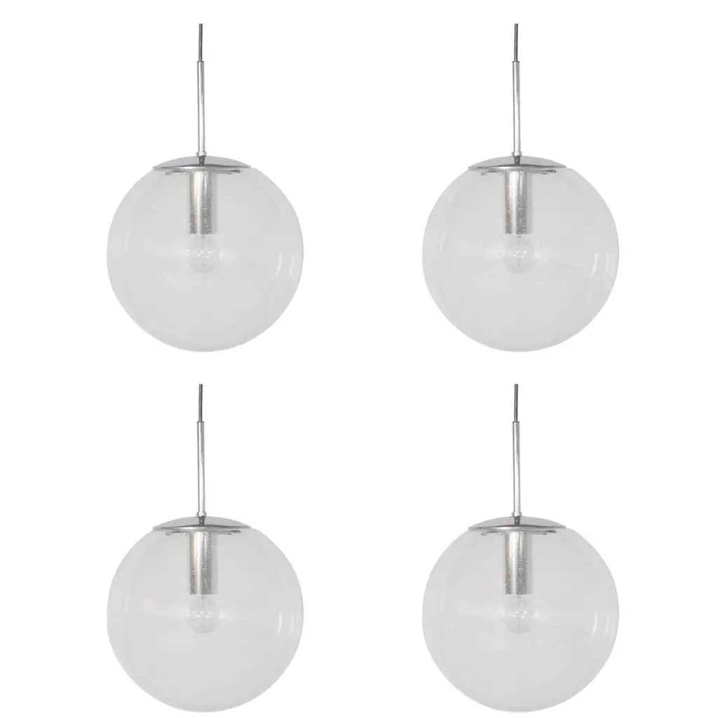 Large ‘Light-drops’ Pendant by RAAK Amsterdam in very good condition.Four lamps available.Handblown glass 35 cm. (13.78 Inch) globe with a teardrop pattern trapped inside the glass.The pattern in the globes creates a spectaculair effect when lit.Chromed hardware.White cable, suitable for US use.The Amsterdam RAAK lamp factory was founded in the mid-1950s by Carel Lock Horn. He was a former Philips employee.The RAAK Amsterdam company was one of the most famous lamps manufacturers of the Netherlands.From now on all large and fragile overseas transports from Cadmium will be handled by the Tramo Group.Tramo is the industry leader in the international distribution of high-end furniture, art and furnishing components.They have the perfect combination of means of transport, passion for beauty and a highly skilled and professional staff that guarantee a work of great quality, fully respecting customers and the high value of the goods handled.We offer a variety of insured shipping services, ask us for the possibilities and competitive pricing.If you have any questions about our shipping options or this item please feel free to contact us.In the style of Stilnovo, Sarfatti.