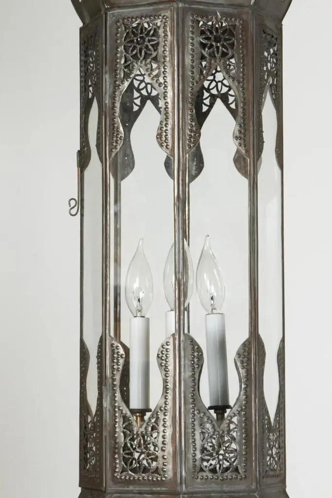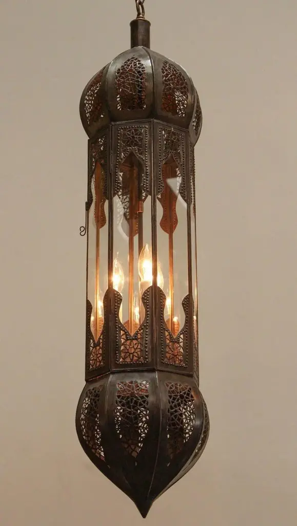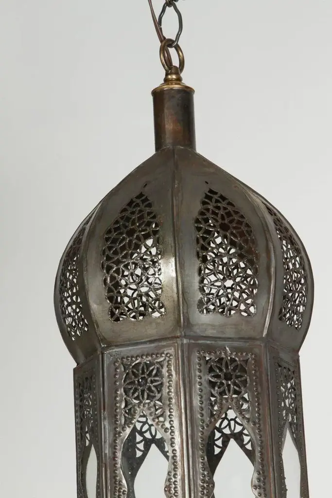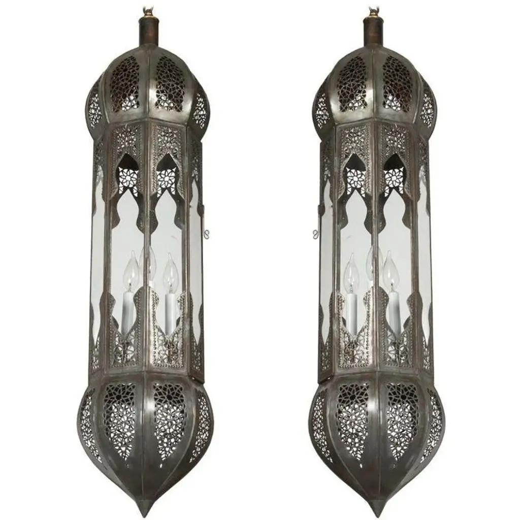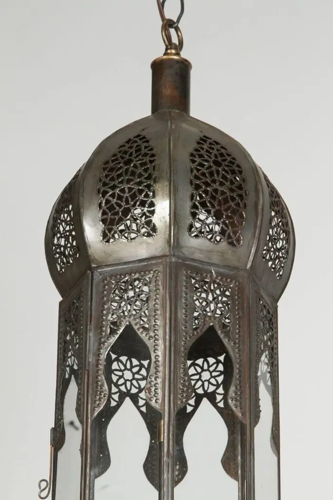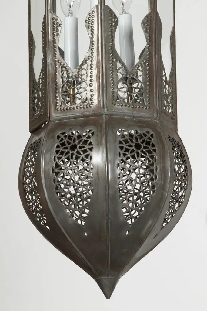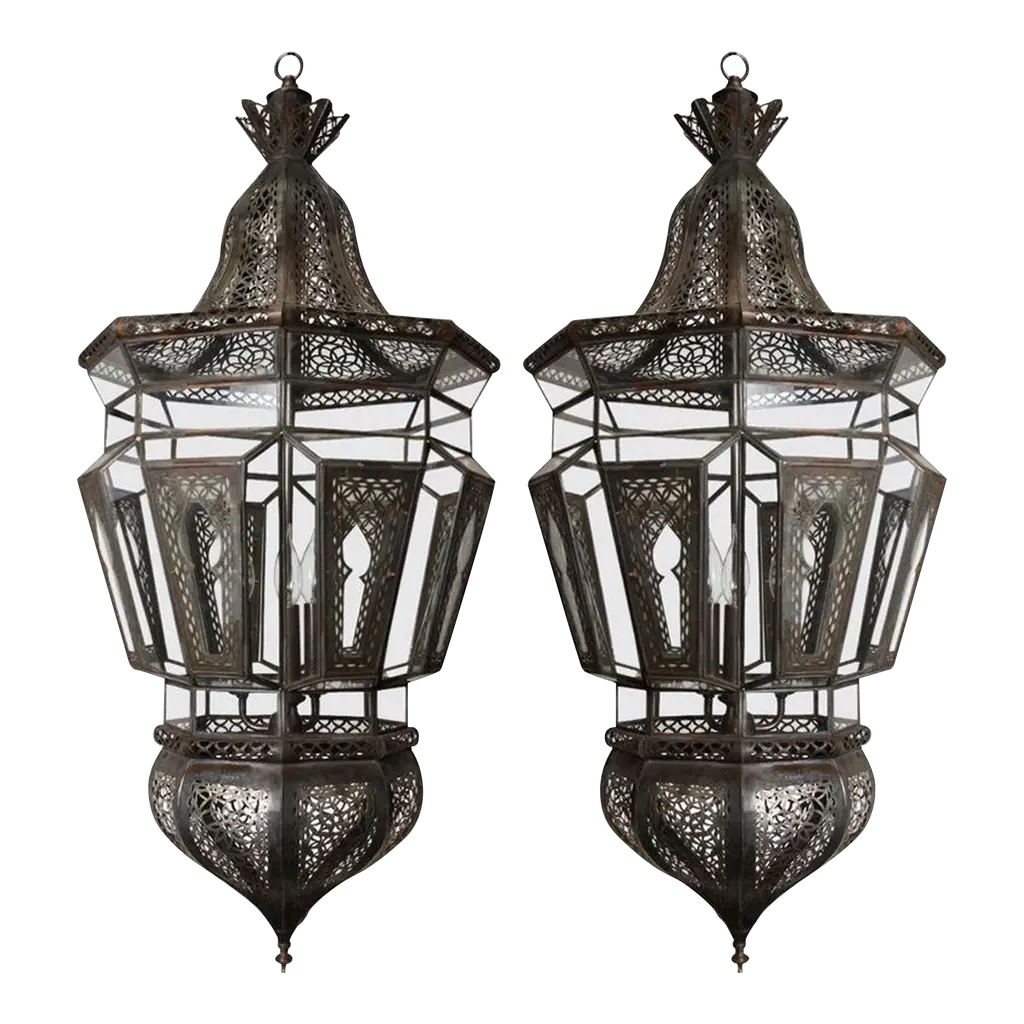 Large pair of Moroccan Moorish metal and clear glass pendant, handcrafted in Marrakesh, Morocco by talented artisans, hand-cut metal in filigree Moorish designs. Color of metal is patina bronze. Rewired for electricity with a cluster of three lights. Comes ready to install with chains and canopy. Great to use as wall sconces as well. Dimensions: 43 in. H x 10 in. D Multiple available. Price is per set of 2. 3 sets available. For indoor use or covered area only. About the Moroccan lanterns: The metal and glass hand-crafted lantern from Morocco is a captivating pieces of artistry that combines the rich cultural heritage and exquisite craftsmanship of the region. Its design reflects the traditional Moroccan style, which is renowned for its intricate detailing and vibrant aesthetic. This vintage Moroccan lantern is meticulously handcrafted using a combination of metal and glass, resulting in a stunning blend of materials that enhances its overall beauty. The framework of the Moorish lantern is skillfully constructed from metal which provides a sturdy foundation and intricate patterns. The metalwork adorning the Moroccan light fixture features intricate filigree patterns, geometric motifs, and delicate scrollwork, all meticulously hand-cut by skilled Moroccan artisans in Marrakech. These ornate Moorish designs create mesmerizing shadows when the Moroccan hanging lantern is illuminated, casting enchanting patterns that dance across the surroundings. The glass components of the Moroccan lantern add a touch of elegance and brilliance to its appearance. Clear and multicolor glass panels are carefully inserted into the metal framework. These panels may showcase traditional Moroccan geometric Islamic designs. When the Moroccan lantern is lit from within, the glow emanating through the colorful glass panels transforms the surrounding space into a warm and inviting atmosphere. The interplay of light and shadow created by the intricate metalwork and the translucent glass adds depth and allure to the lantern's overall charm. The craftsmanship of this Moroccan light fixture is a testament to the dedication and skill of the artisans who meticulously handcraft each piece. The attention to detail, the artistic flair, and the fusion of metal and glass make this Moroccan lantern a true work of art, capturing the essence of Moroccan culture and heritage. Whether displayed as a centerpiece or hung from a hook, this metal and glass handcrafted lantern from Morocco effortlessly evokes a sense of enchantment, transporting you to the vibrant streets and magical ambiance of Moroccan nights.