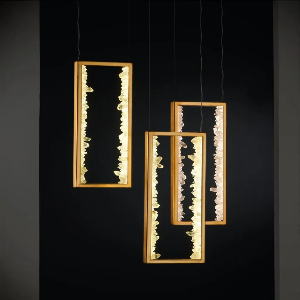 Large quartz pendant lamp by AverSigned by Waldir JuniorDimensions: D 5 x W 30 x H 94 cm Materials: Aluminum plated with gold leaf. Natural white quartz and smoky quartz.Lighting: 01 x LED 30W 2400 lumens.Finish: silver veneer, aged silver veneer, gold veneer, aged gold veneer, copper veneer, aged copper veneer, aged gold patina, antique patina.Also available in size Small (H 60 cm). All our lamps can be wired according to each country. If sold to the USA it will be wired for the USA for instance.A new collection of lamps was signed by Waldir Junior for Aver Metais. The Carbonite line is characterized by its geometric design with striking lighting through natural quartz druses. Price with canopy for plaster lining. Source not included, purchase separately.The history of Aver Metais as a lighting brand begins with Jefferson Aver manufacturing lamps in a completely handcrafted way and with very few resources in the family business. Over the years, the brand has grown and gained recognition. Today, our products are present in several projects by prestigious professionals, in addition to being resold in lighting boutiques in different regions of Brazil. Through its partners, Aver Metais has several participations in important design and architecture exhibitions. In 2015 the company started its internationalization process and today has clients and projects carried out in places like New York, Los Angeles, Chicago, Dallas, Miami, London, Cardiff, Hamburg, Manila, Santa Cruz de la Sierra, and Lima, attesting to the level quality and competitiveness of Aver Metais products.In our factory, each piece is meticulously produced using modern production processes combined with craftsmanship to detail. The result is original pieces that, more than illuminate, are jewels for your home. Over the years, the brand has been dedicated to creating and producing original and high-quality decorative lighting fixtures that can fit into the most varied and demanding interior architecture projects.