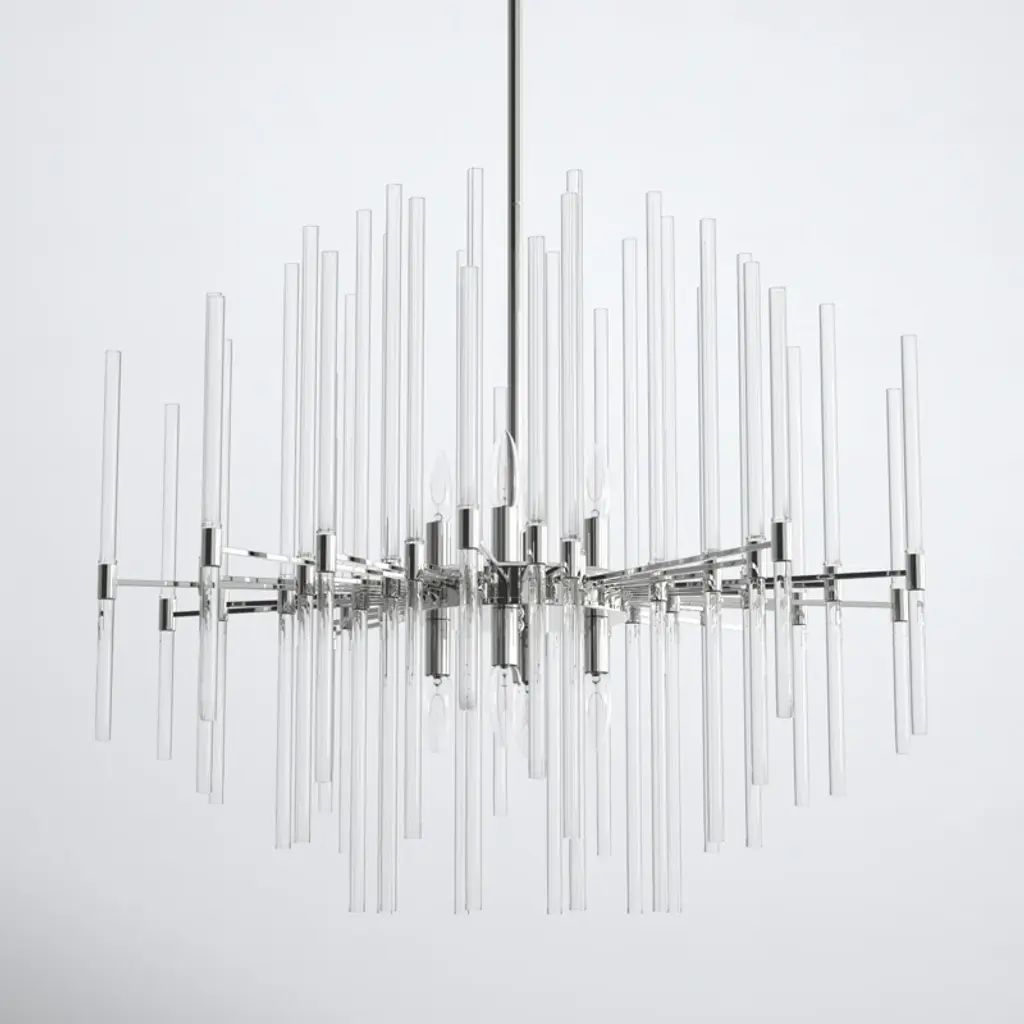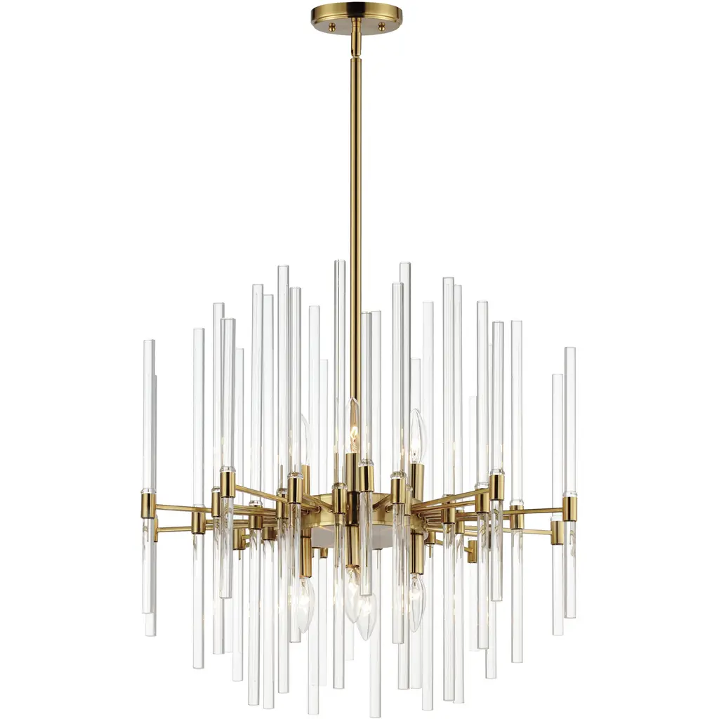 Timeless traditional appeal radiates in this gorgeous six-light large aged brass and glass pendant. Glass rods in gradient sizes form a stunning geometric profile, buoyed by warm aged brass as a complementary offset.