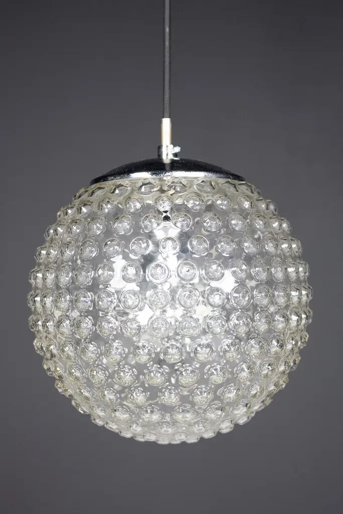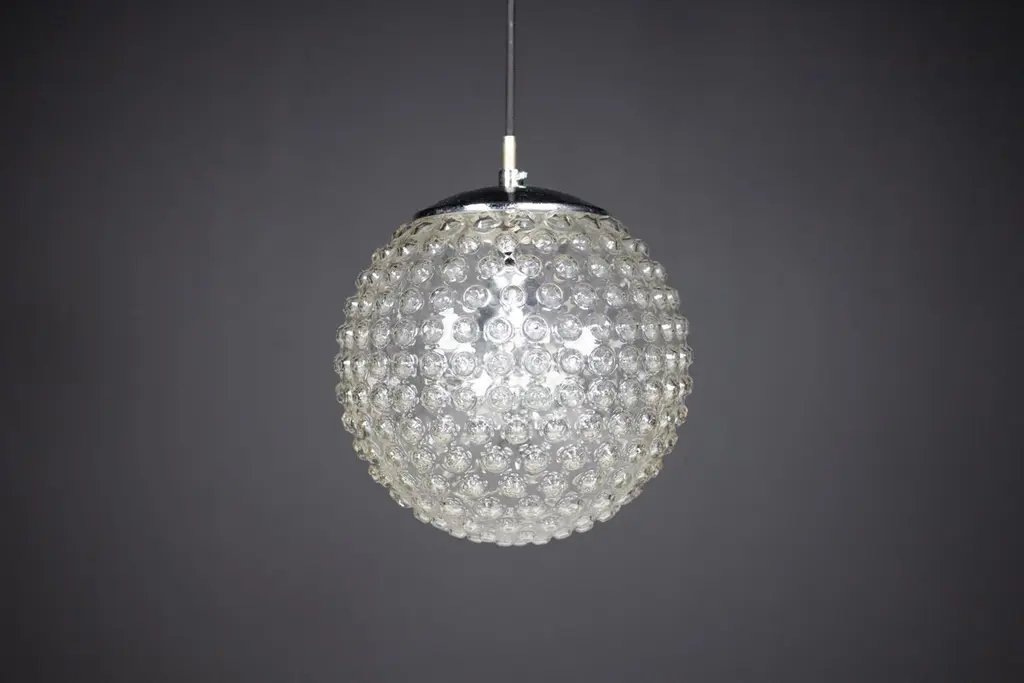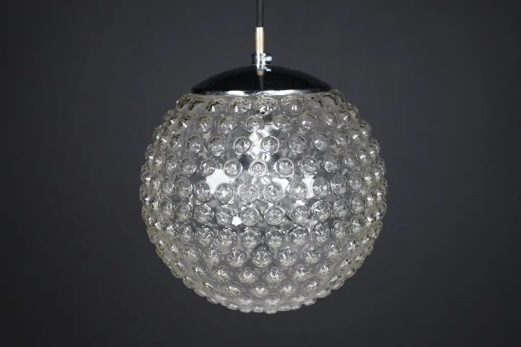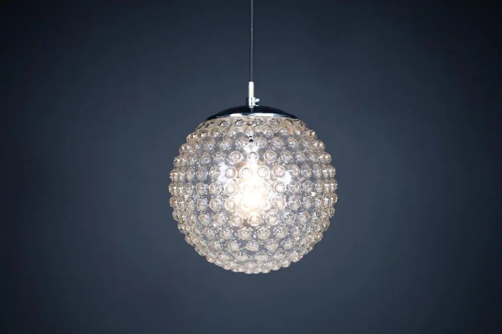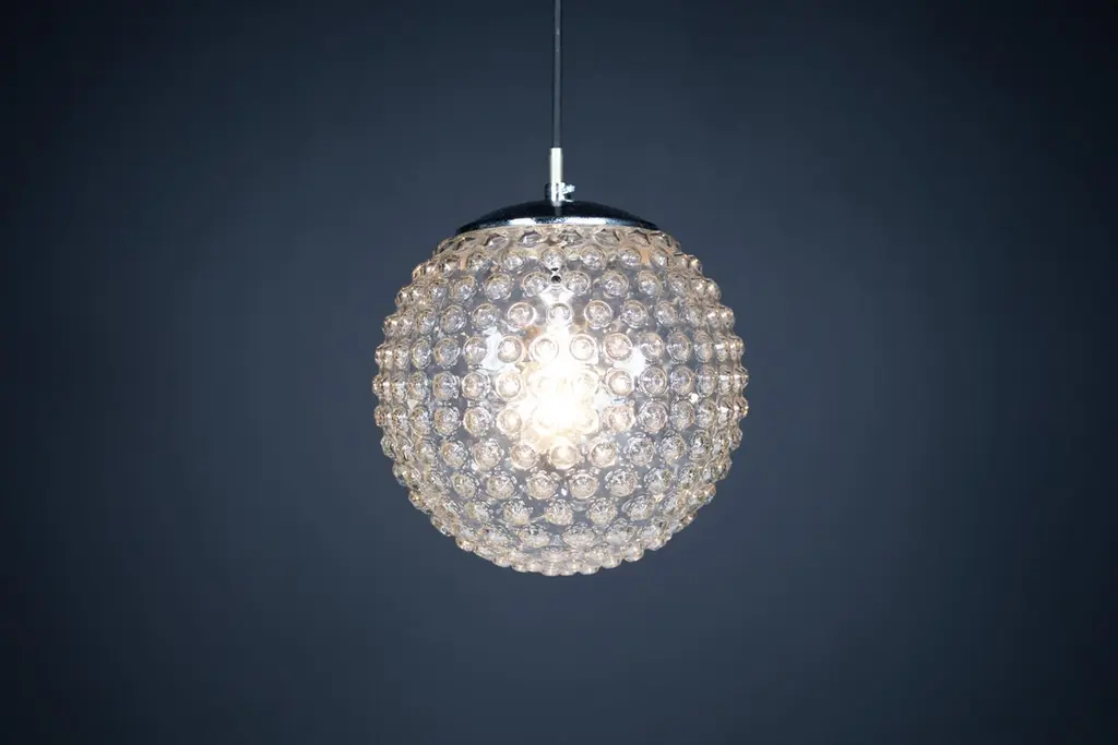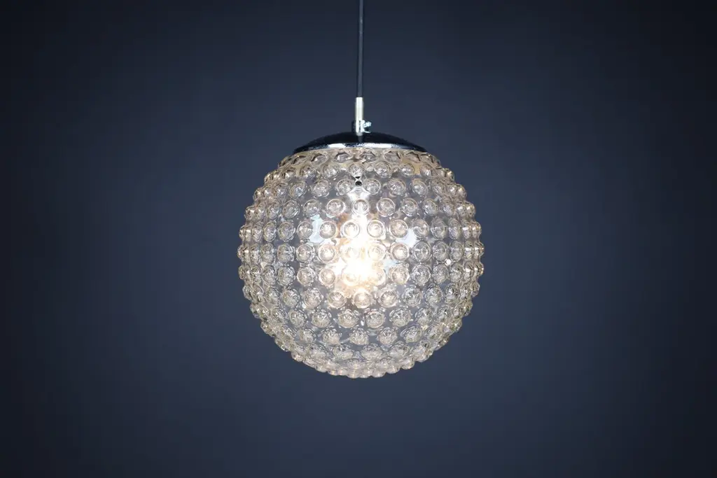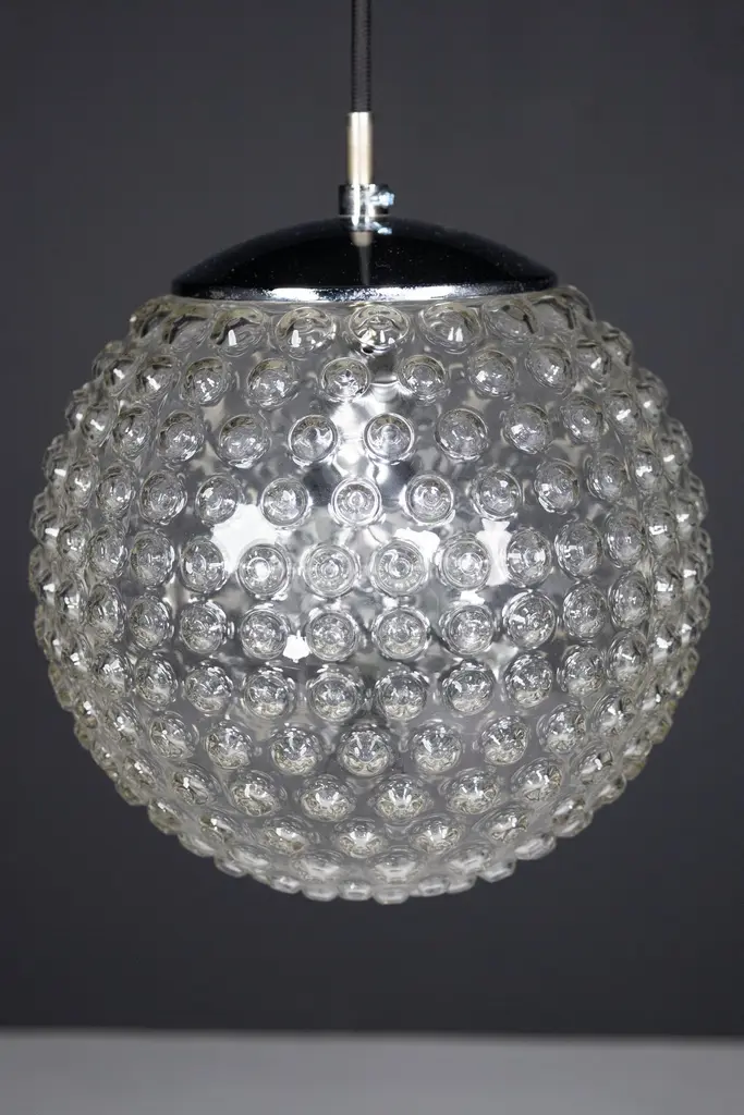 Rolf Krüger Bubble Glass Pendant for Staff, Germany 1970sRolf Krüger for Staff designed these beautiful bubble glass pendants in Germany during the 1970s. They come with chromed hardware and black cord wire, and the glass boasts a subtle bubble effect. The pendants are in excellent condition and have been newly rewired to take up to 100W max (e27 bulbs). The length of the cord wire/canopy can be customized according to the client's requirements. The large size and combination of materials make these pendants perfect for various environments ranging from mid-century to space age. They create a stunning light partition that produces a dazzling effect. The lamp is fitted with an E27 socket that is LED-compatible and compatible with US, UK, and Asia standards. We have 12+ pendants available, and the price is per light. Each pendant has a diameter of 20 cm, and the chrome is in good condition with some minor patina. The pendant can be disassembled for easy transportation. Rolf Krüger, born in Hamburg in 1939, was a renowned contributor to developing German mid-century modern furniture design during the 60s and 70s. He created metal, glass, and concrete products for several German lighting and furniture design companies from 1964 to 1982. Krüger designed bubble glass pendants, tube decorative wall lamps, and the iconic Cross Oyster flush mount ceiling light for Staff Leuchten, displayed at the 1970 Geneva International Motor Show. He also collaborated with Heinz Neuhaus Leuchten to create several popular lighting pieces. Krüger has received more than 30 awards, including several iF Design awards and his lighting pieces are in the collections of several museums.