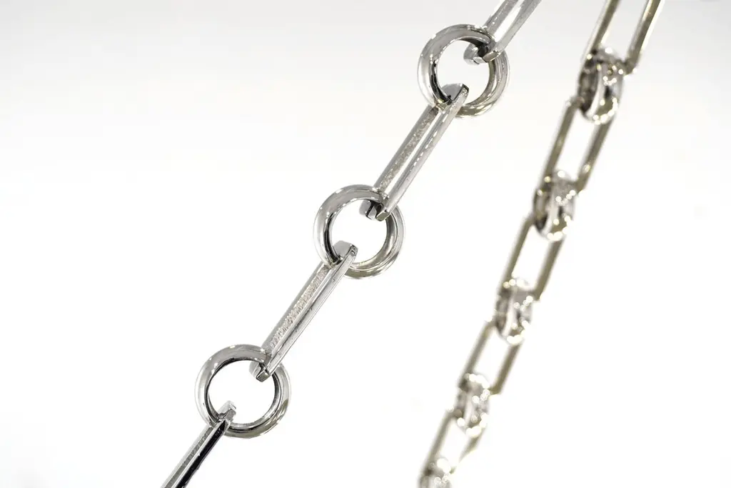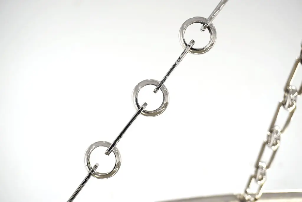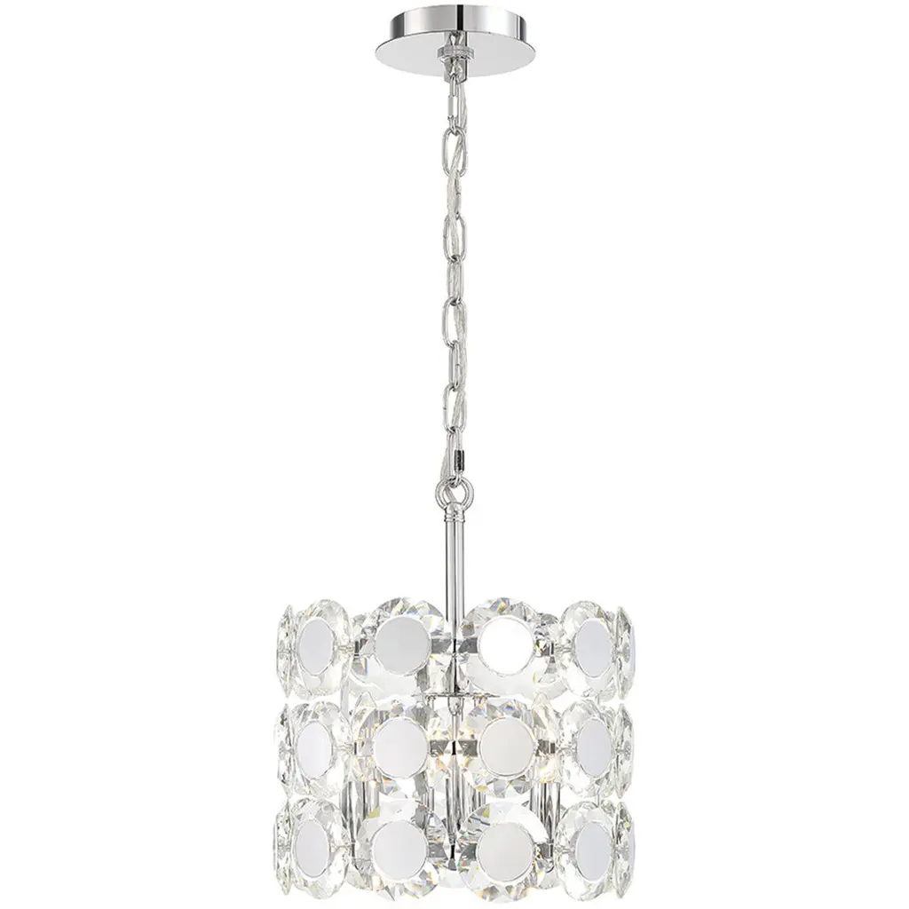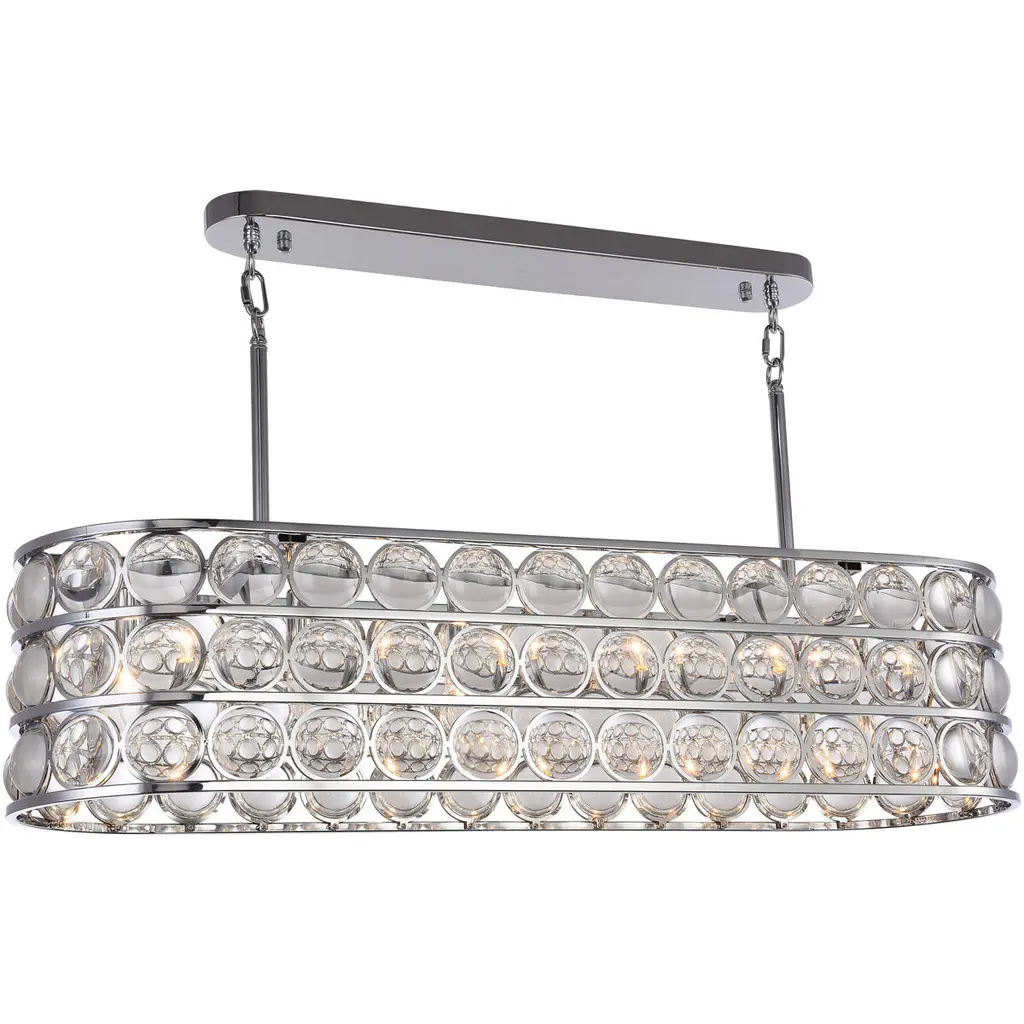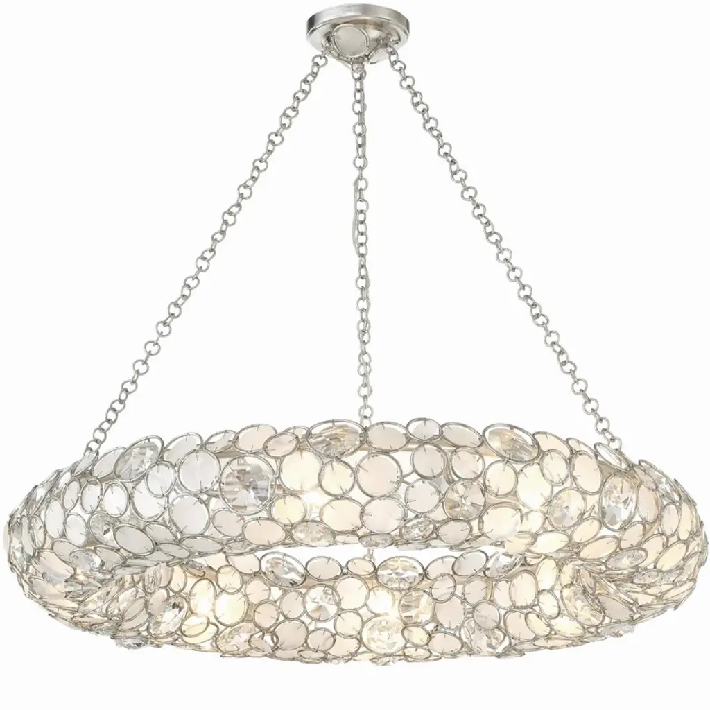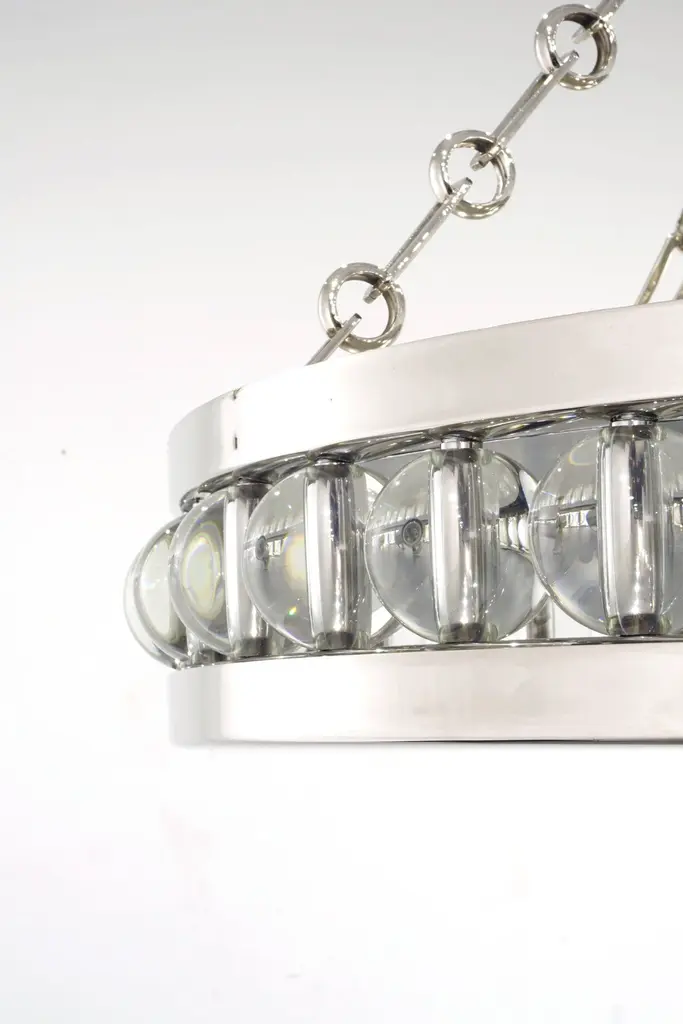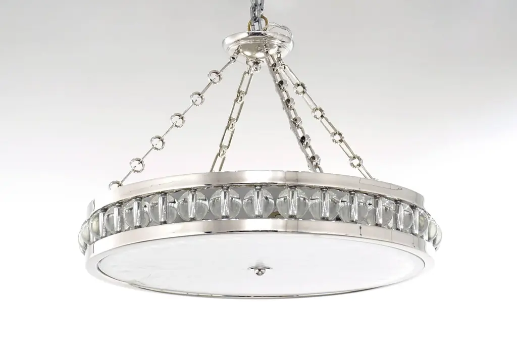 A large, polished nickel pendant light fixture suspended from chain and canopy. The Tambour Pendant Light features a 30" metal frame securing a flat piece of white swirl glass with finial in center on underside, the sides with over-scaled Murano glass beads. Drop is adjustable and this fixture is also available with rods. Minimum drop is 14". Interior of fixture fitted with six Edison sockets. Maximum wattage 100 (Recommended wattage 60). Pricing includes standard non-UL wiring. Made to order with 6-8 week lead time