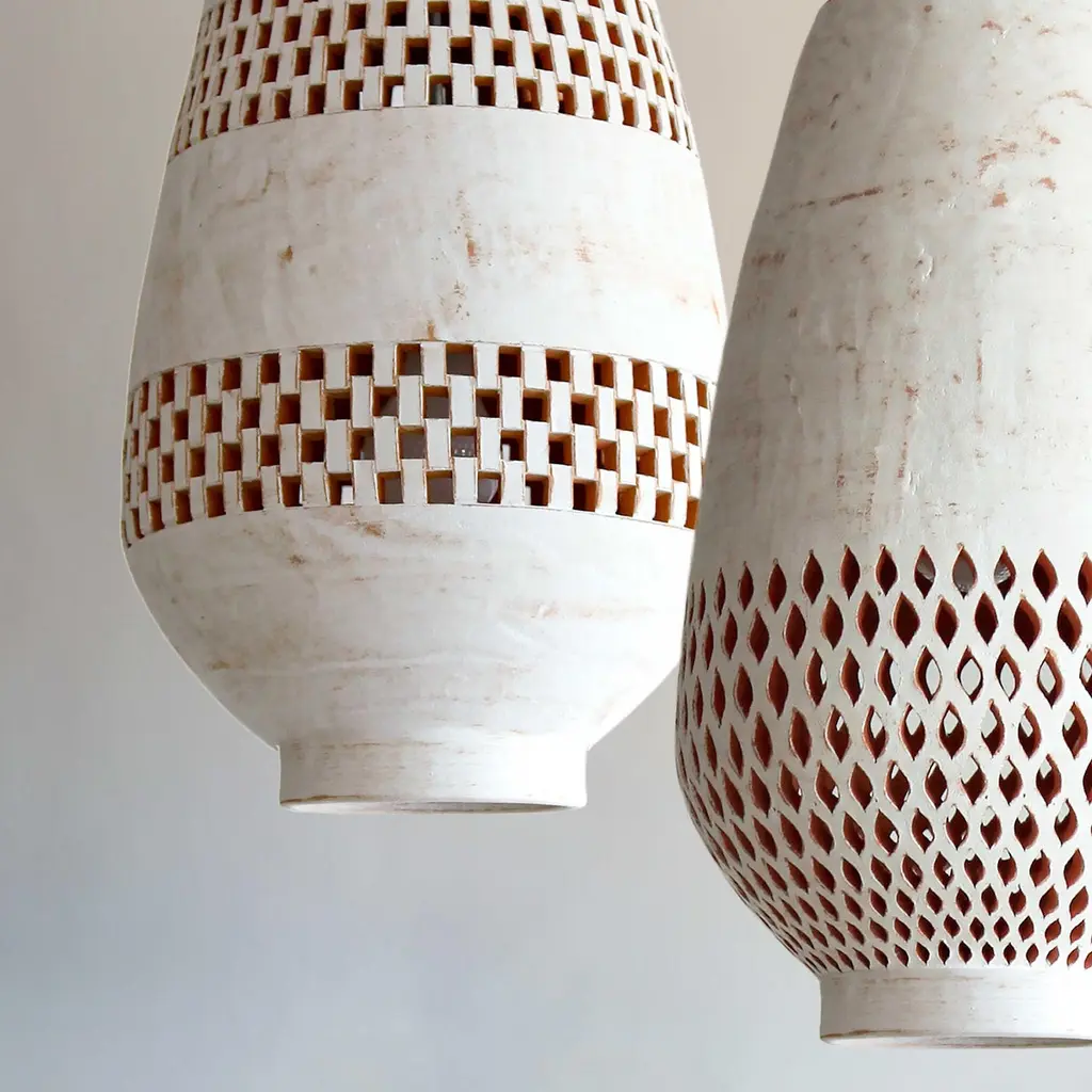 Our Atzompa Collection is created in the Oaxacan town of Santa María Atzompa, where the pottery-making tradition has roots tracing back to ancient Zapotec culture.Building on this tradition, we formed a partnership with master artisan Eligio Zarate, whose family has for generations worked to bring innovation to this centuries-old craft.Using a red clay that comes from local mountains, the pieces in this collection are first given form within custom gesso molds. Emerging from the molds, the repeating openwork designs—which play on motifs that are carved in to the stone at Mitla, the neighboring archeological ruins—are meticulously cut out one by one. Each piece is then brushed with a white wash before being fired in a wood-burning pit.DIMENSIONS12.5” Ø x 21” h31.5 cm Ø x 53 cm hLAMPINGTriple SocketBulbrite, G25, E26 LED (bulbs included)8.5W 60W Equivalent800 Lumens3000K CRI 90+Fully compatible dimmingCERTIFICATIONSUL, cUL listed (120V) 240V available upon requestMOUNTINGUniversal ceiling mount; hardwiredSUSPENSION6 ft link chain (standard)METAL FINISHBrushed Brass