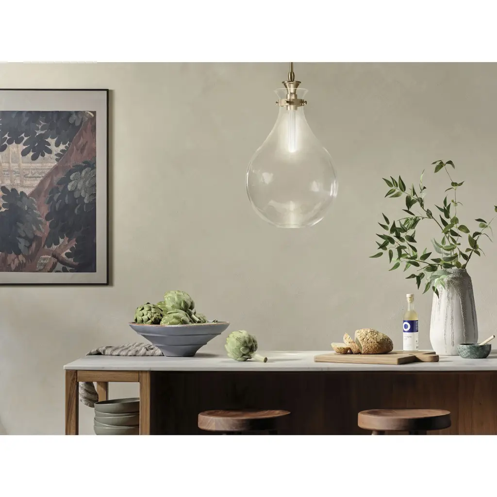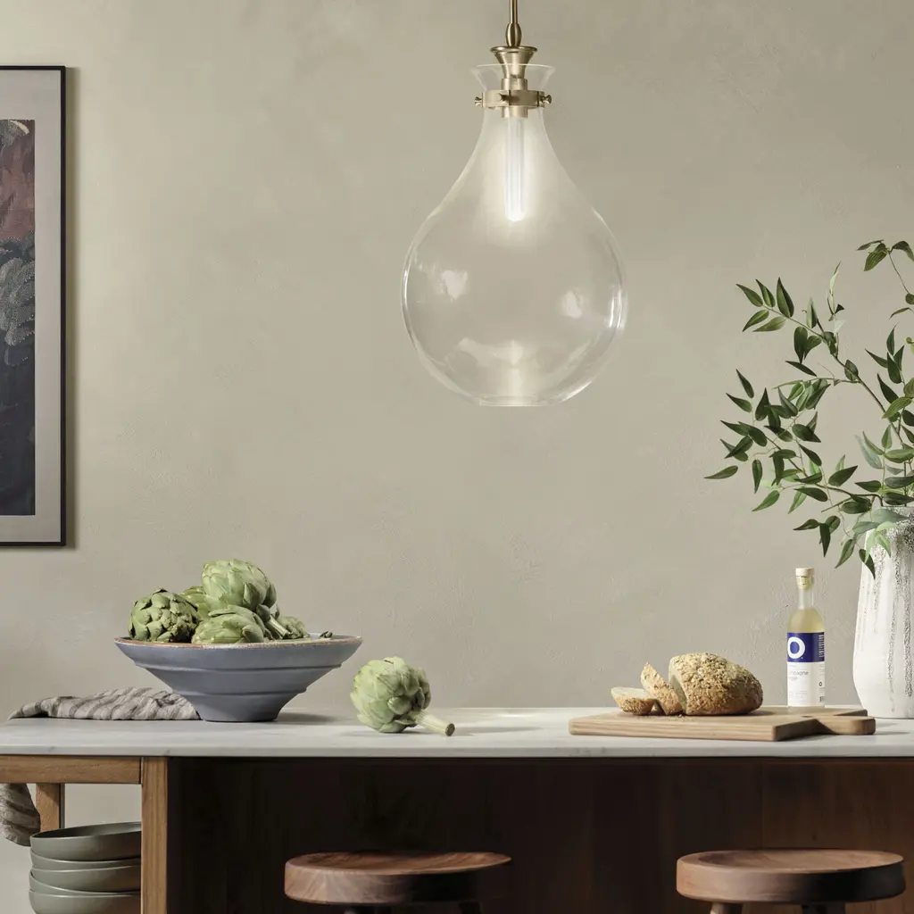 The Laria pendant is equally gorgeous and versatile. Inspired by Korean sachet bags, its classic teardrop shape nods to the traditional while the subtle detail on the fittings refreshes and enhances its look. This is craftsmanship at its best. The canopy features a soft, subtle curvature for added detail. Clear glass allows the bulb to show through for a truly refined look.