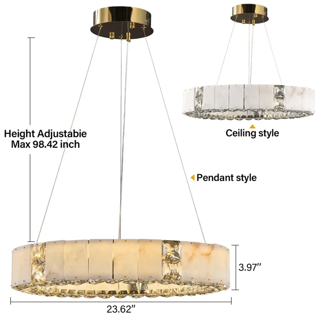 This unique pendant light features an exquisite alabaster ring design that adds a touch of luxury to any space. The Round Alabaster Pendant Light is not only visually appealing but also functional. It provides ample illumination while maintaining its aesthetic appeal. The translucent quality of the alabaster material allows for soft, diffused light that creates a warm and inviting atmosphere in any room. Crafted with precision and attention to detail, this pendant light is made from high-quality materials that ensure durability and longevity. Its sleek and modern design makes it suitable for various interior styles, whether you prefer a contemporary or traditional look.