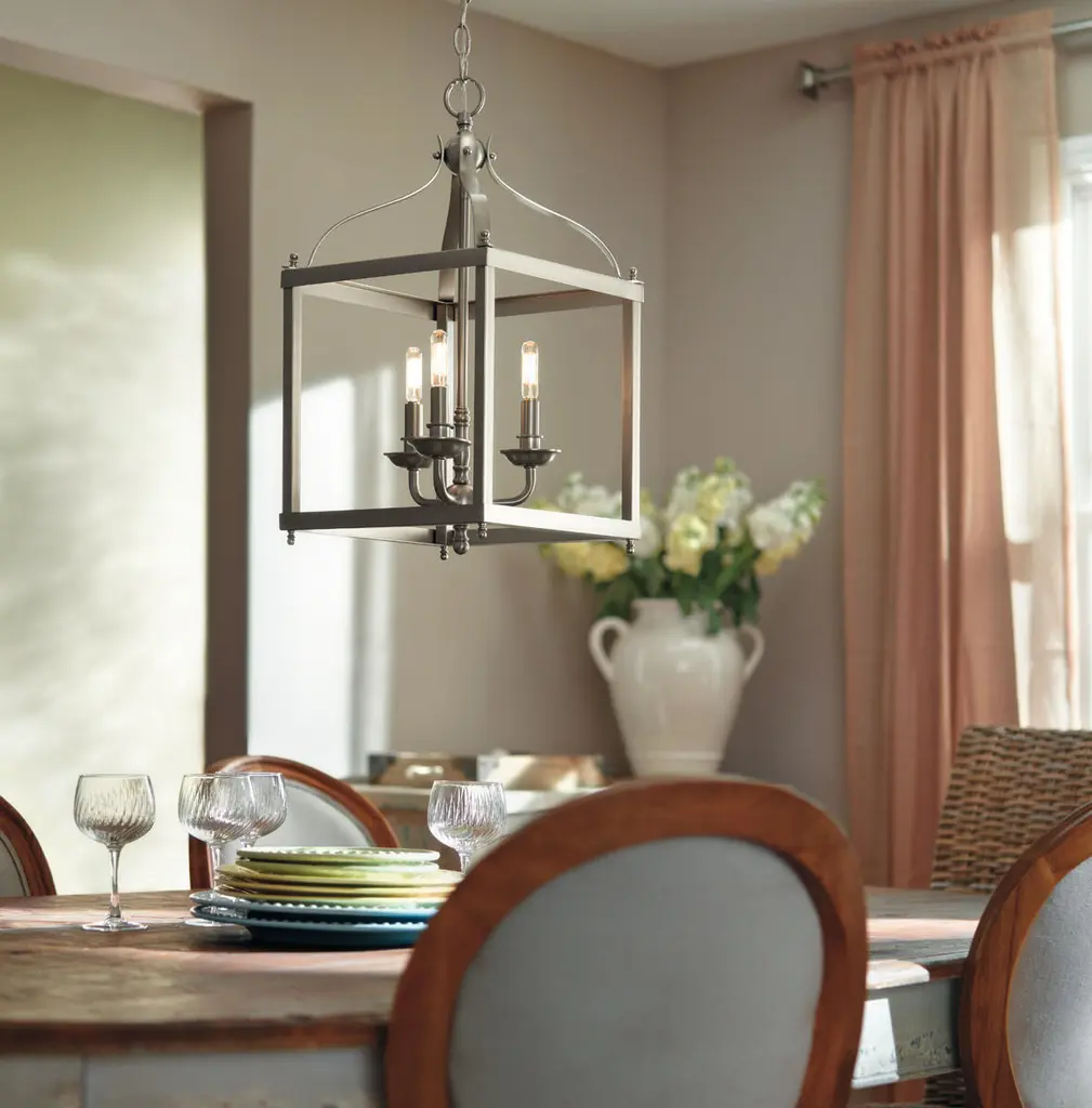 This 3 light foyer pendant cage from the Larkin? collection creates a strong, linear silhouette. The Brushed Nickel? finish and steel form of this design will effortlessly accent your home.