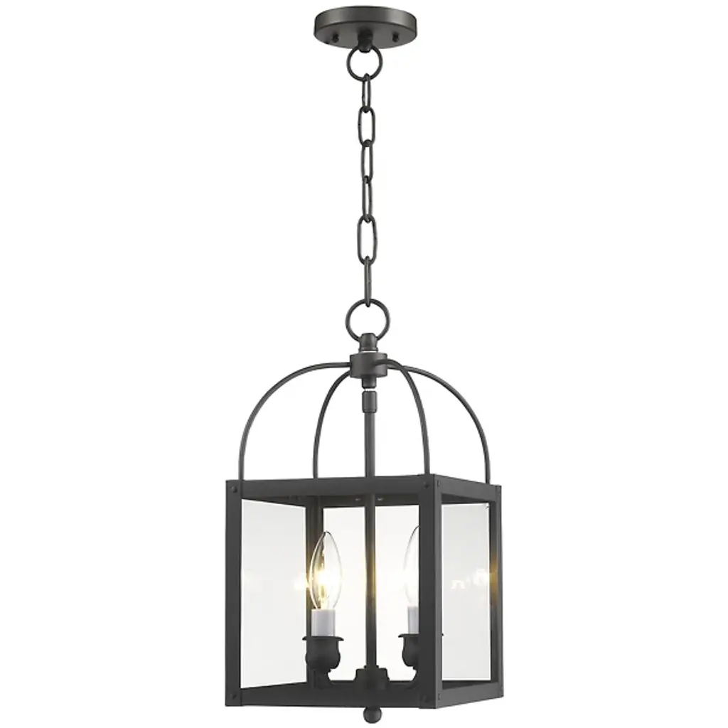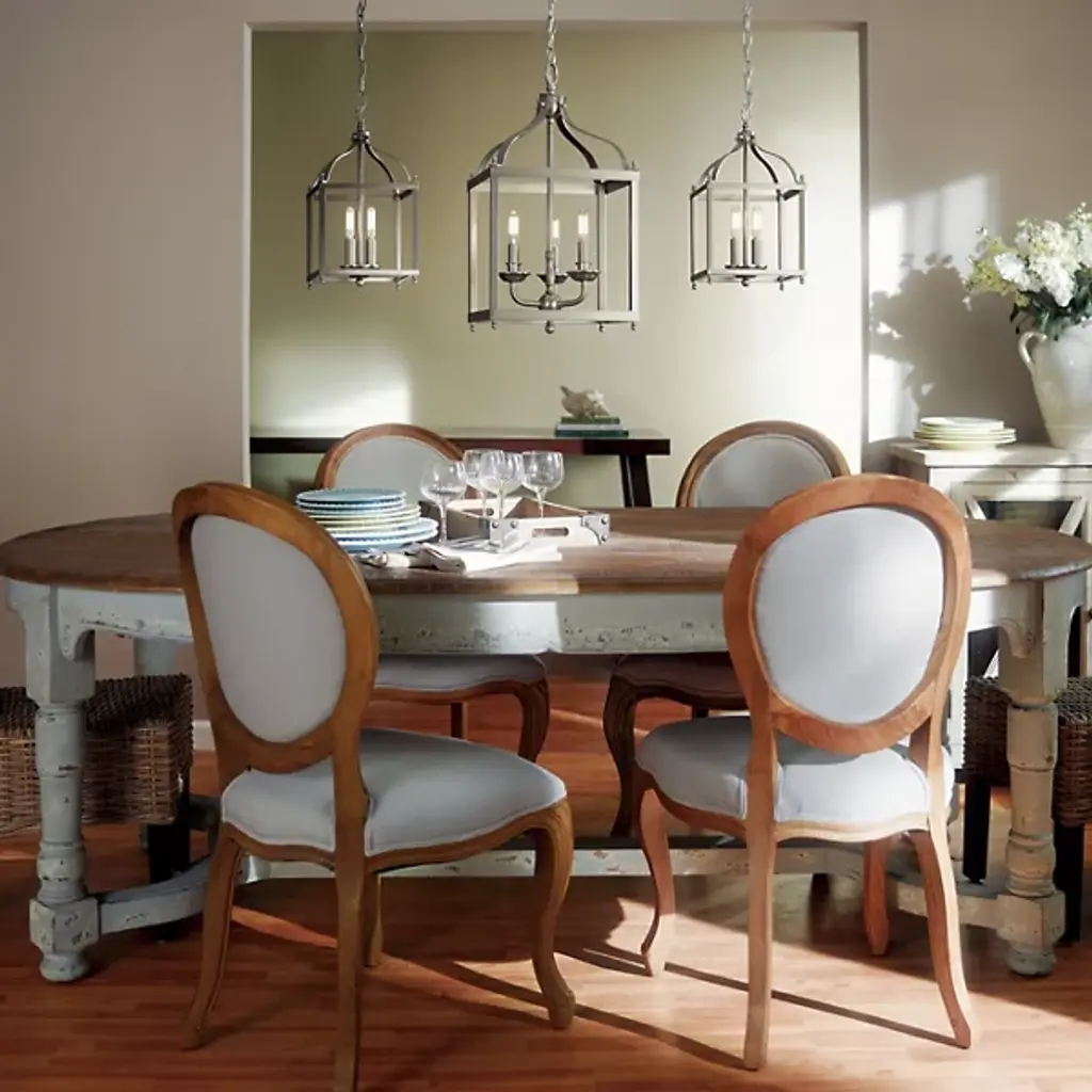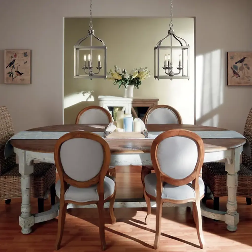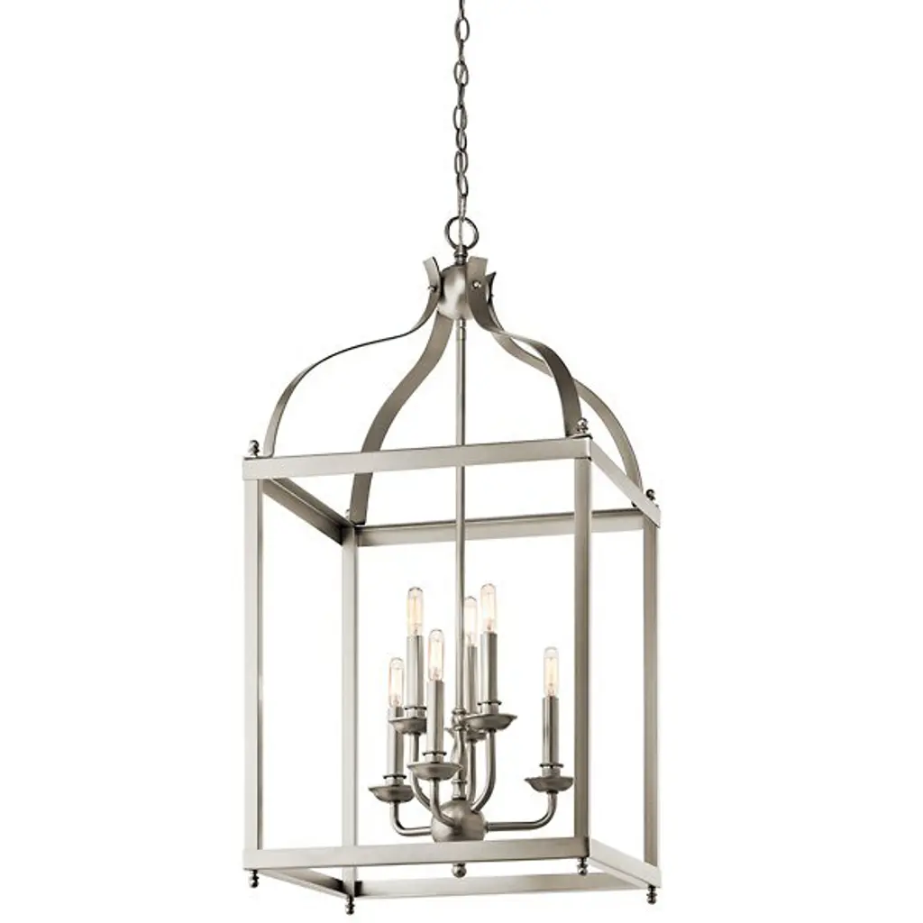 An antique aesthetic and updated transitional design are evident in the Larkin Pendant by Kichler. The steel frame creates a cube-like open cage shade, housing the candelabra that sits at its center. Gentle curves are decorated with ball accents for a rustic touch, while a steel ring suspends the pendant from an adjustable chain and rounded canopy. Each bulb emits a warm, incandescent light that creates an inviting ambiance, making this pendant ideal for entryways, foyers, and dining areas.