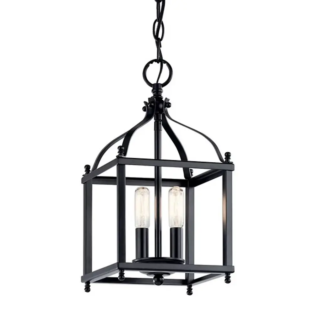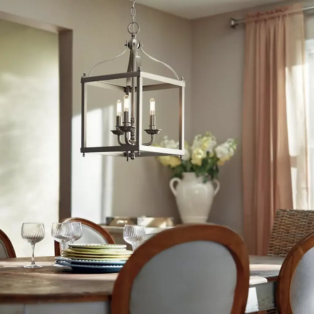 An antique aesthetic and updated transitional design are evident in the Larkin Pendant by Kichler. The steel frame creates a cube-like open cage shade, housing the candelabra that sits at its center. Gentle curves are decorated with ball accents for a rustic touch, while a steel ring suspends the pendant from an adjustable chain and rounded canopy. Each bulb emits a warm, incandescent light that creates an inviting ambiance, making this pendant ideal for entryways, foyers, and dining areas.