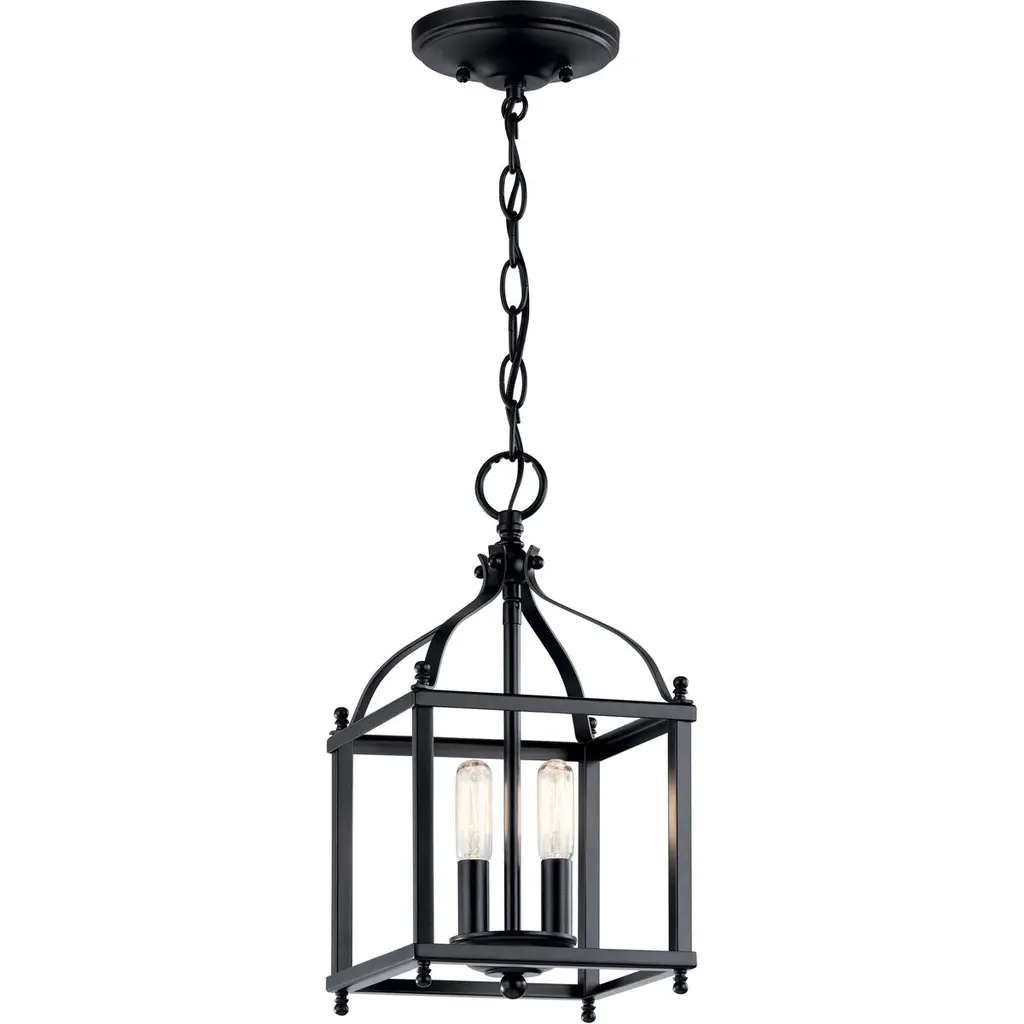 An antique aesthetic and updated transitional design are evident in the Larkin Pendant by Kichler. The steel frame creates a cube-like open cage shade, housing the candelabra that sits at its center. Gentle curves are decorated with ball accents for a rustic touch, while a steel ring suspends the pendant from an adjustable chain and rounded canopy. Each bulb emits a warm, incandescent light that creates an inviting ambiance, making this pendant ideal for entryways, foyers, and dining areas.