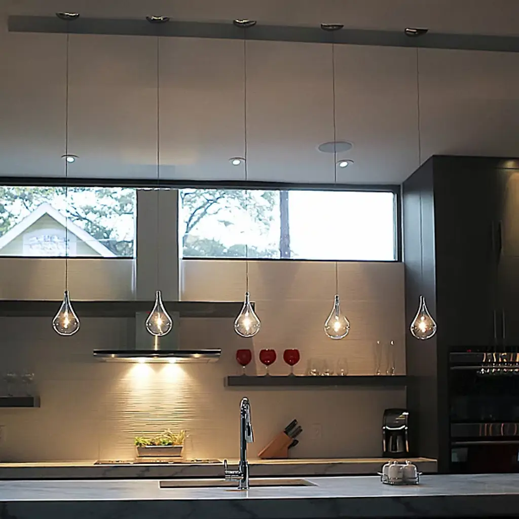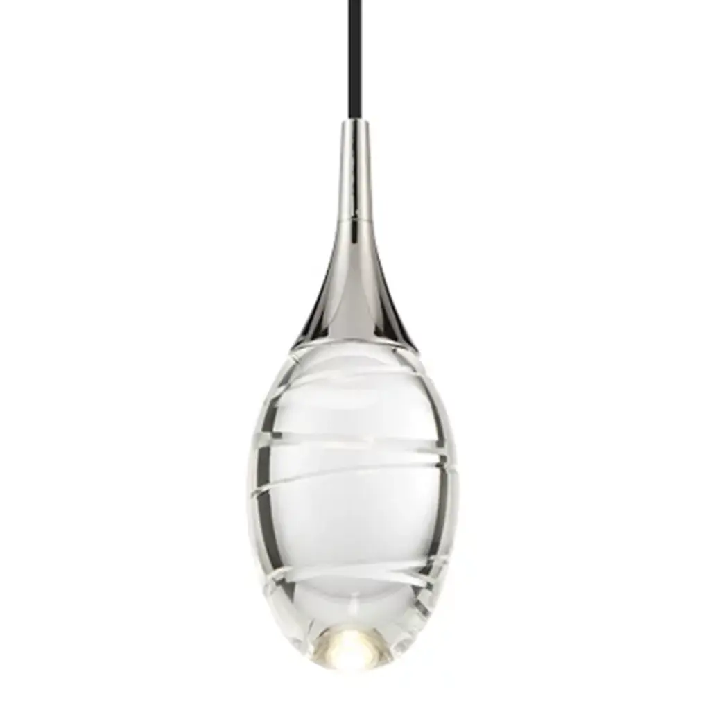 A starkly beautiful addition to modern lighting schemes. The ET2 Larmes Mini Pendant features a Clear glass shade providing an oversized teardrop-shaped outline around a warm xenon bulb. The contemporary look is completed by a chromed lamp holder and round canopy (complete with an integral low voltage transformer for quick and easy installation).