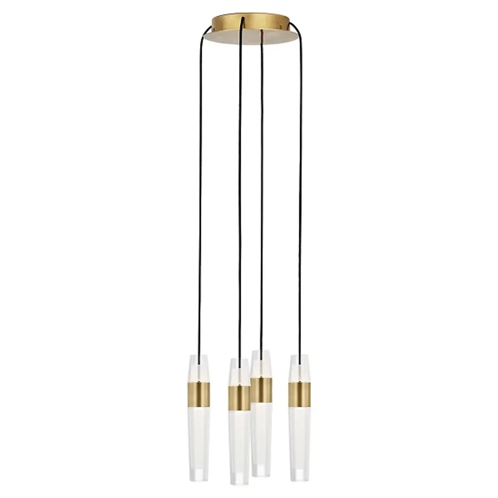 The Lassell 4 Light LED Multi Light Pendant from Visual Comfort Modern blends delicate design with mountain luxe style, making it a striking focal point for modern and contemporary interiors. Designed by Sean Lavin, it embodies minimalist elegance with its oversized blown glass, natural brass arms, and sleek metal hardware. Laser-etched crystal tubes extend from a central hub, creating a refined visual impact. Ideal for dining areas, kitchen islands, and conference tables, it comes with field-cuttable cables and optional accessories for custom configurations.