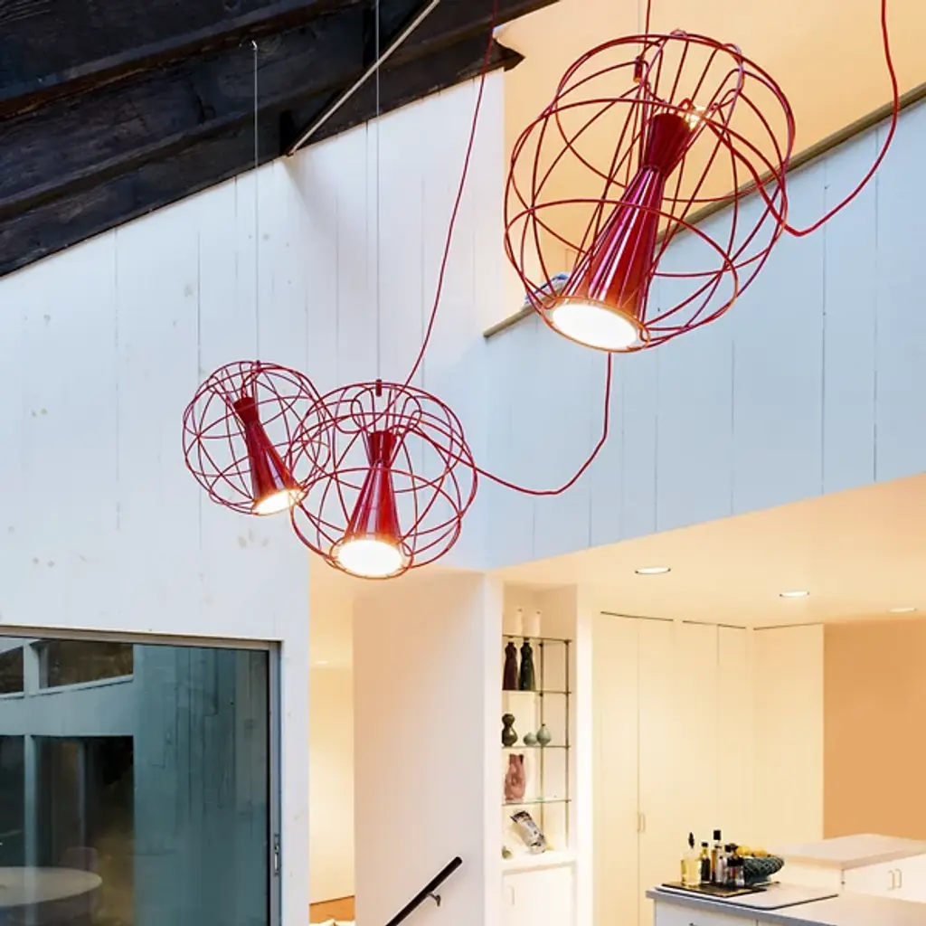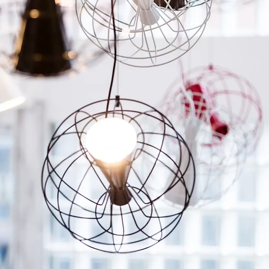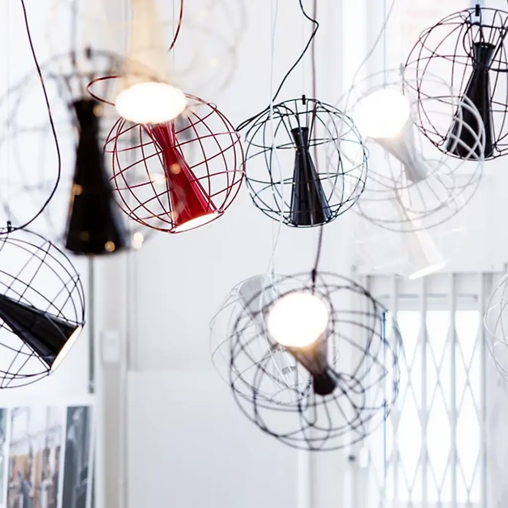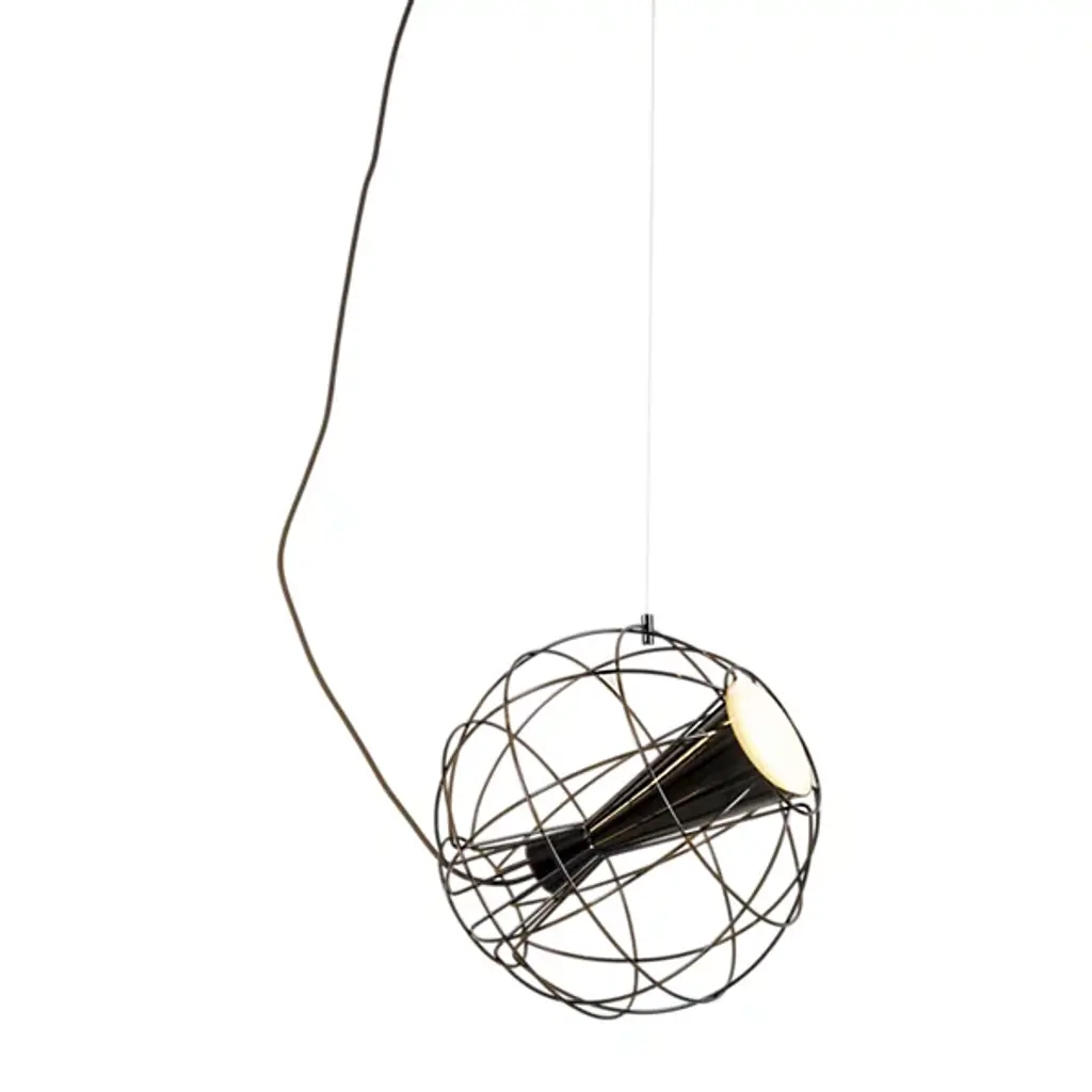 The Latitude Pendant from Innermost descends from above, suspending a stylish spotlight with an inspired retro spirit. A Flynn Talbot design descending from a low-profile canopy via a slim, strong wire and power cable, it places a potent integrated LED lamp inside an offset hourglass housing embedded within a wireframe sphere. The wire can suspend the globe structure at any angle. This enables the projection of focused task light at any angle ranging from direct downlight to an ample wall wash and working well alone or as part of a series of pendants dispersed over a larger area for a compound ambiance.