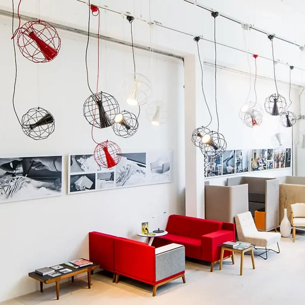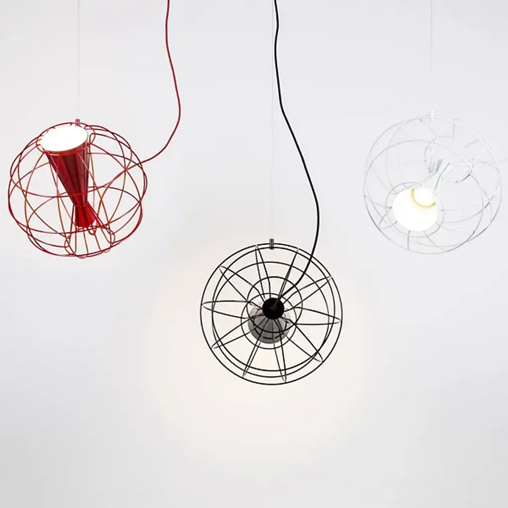 The Latitude Pendant from Innermost descends from above, suspending a stylish spotlight with an inspired retro spirit. A Flynn Talbot design descending from a low-profile canopy via a slim, strong wire and power cable, it places a potent integrated LED lamp inside an offset hourglass housing embedded within a wireframe sphere. The wire can suspend the globe structure at any angle. This enables the projection of focused task light at any angle ranging from direct downlight to an ample wall wash and working well alone or as part of a series of pendants dispersed over a larger area for a compound ambiance.