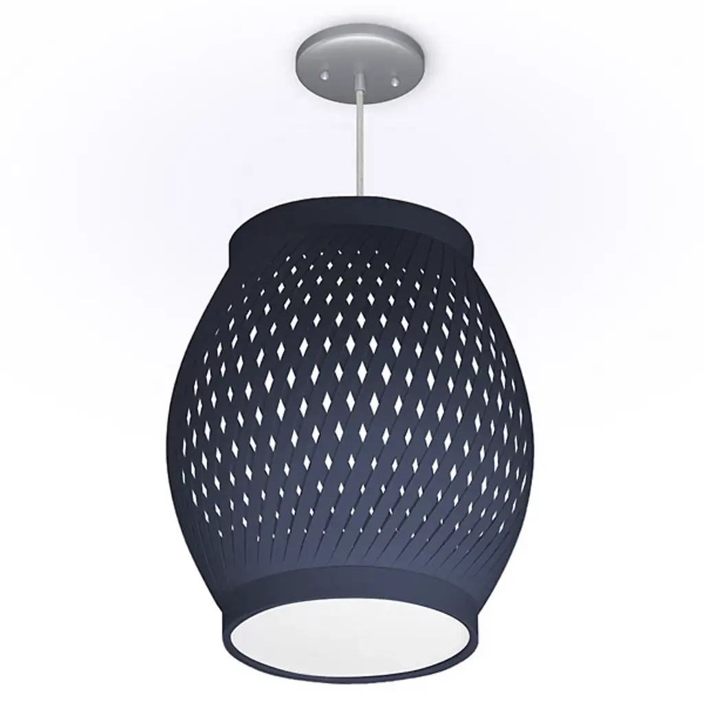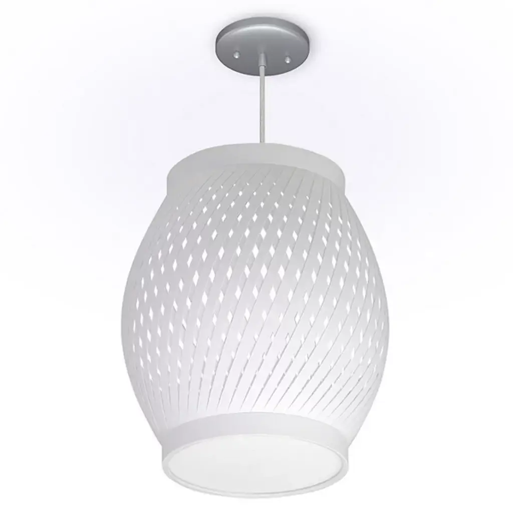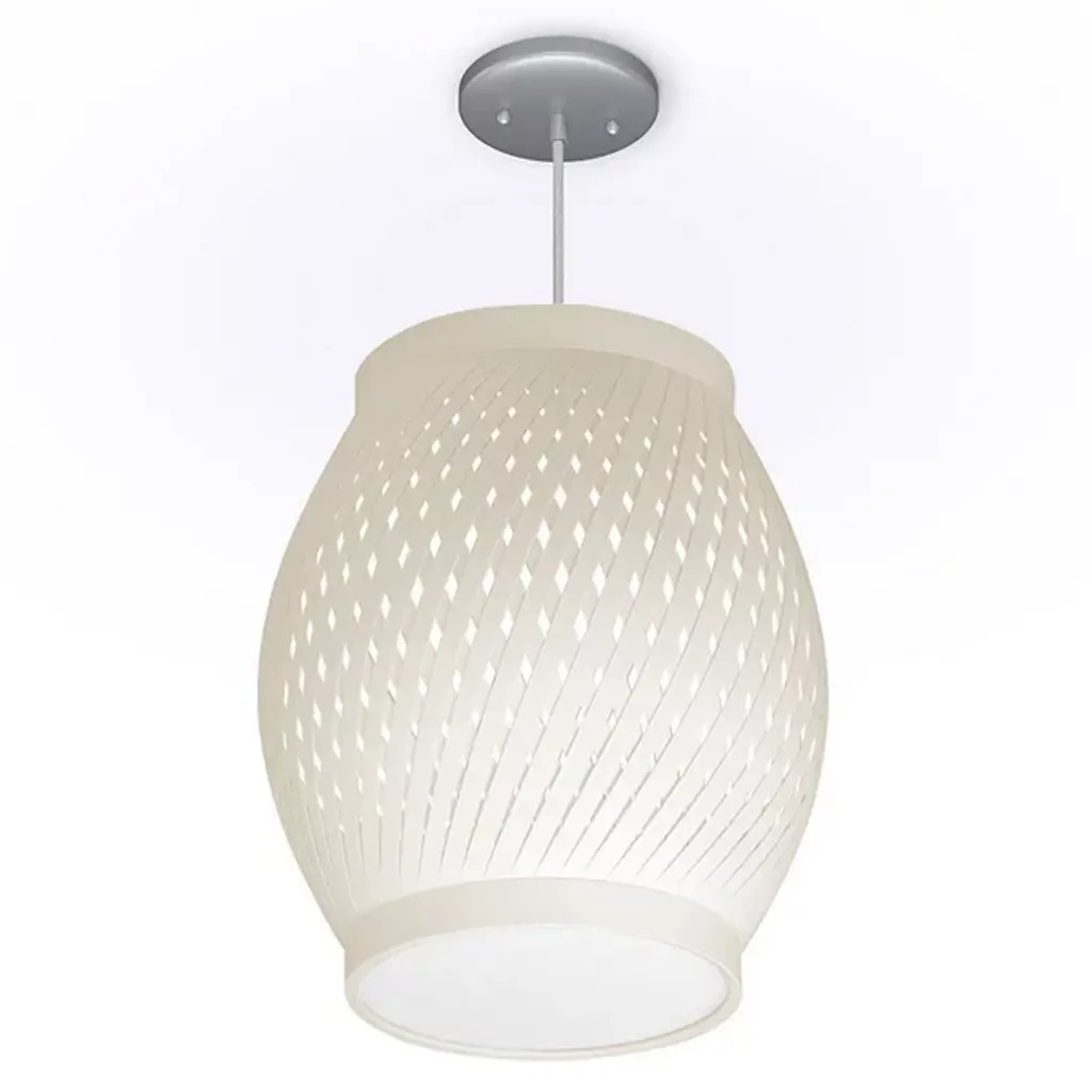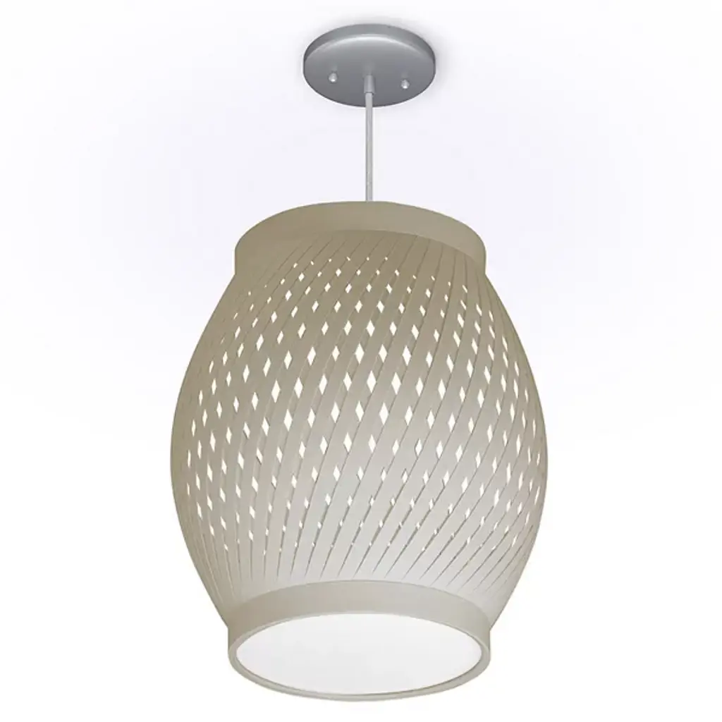 The Lattice Pendant from Seascape Lamps showcases a refined pattern and form through its barrel-style profile, featuring slim, swirling patterns along the sides. Each pendant is handmade in California, and suspends from a circular canopy and woven cord, supporting an outer shade of ribboned linen strips arranged in rhythmic curves. Inside, a diffuser softens efficient LED light, projecting a warm glow outward. As light filters through the layered fabric, it creates a lattice of light and shadow across surrounding surfaces, presenting a balanced study in contrasts.
