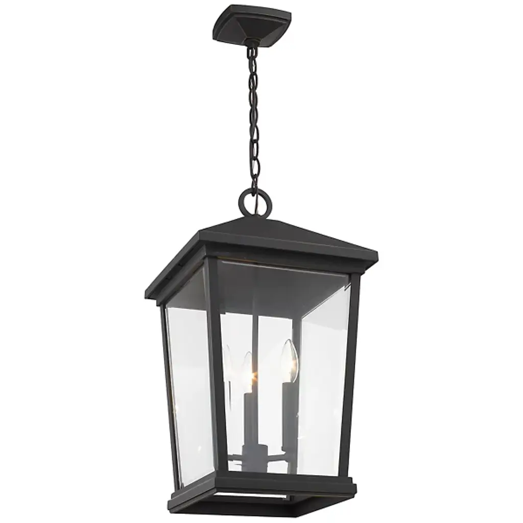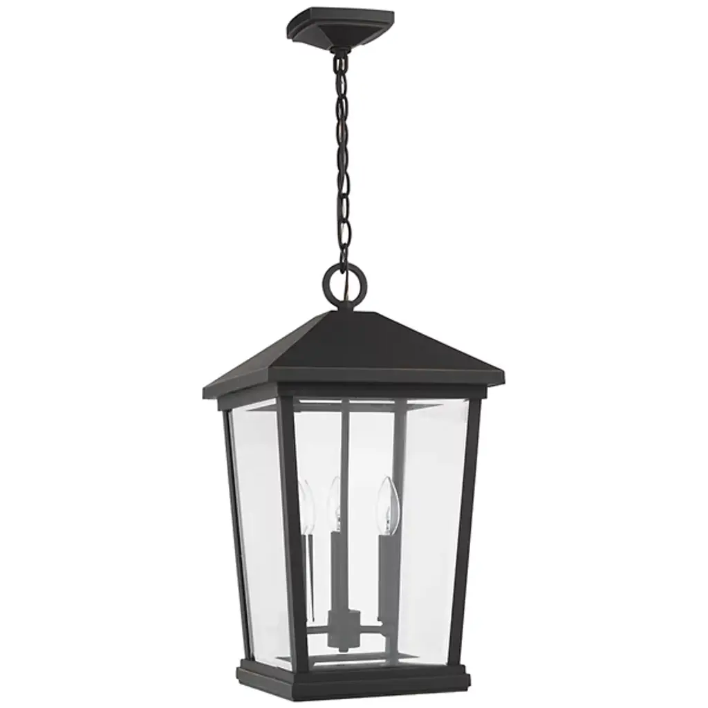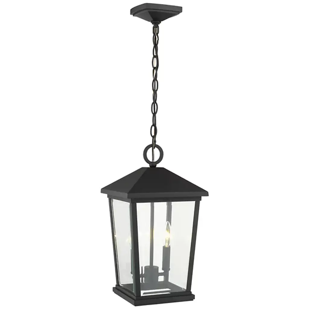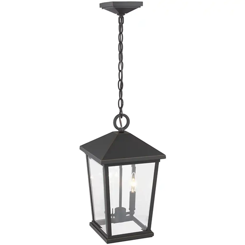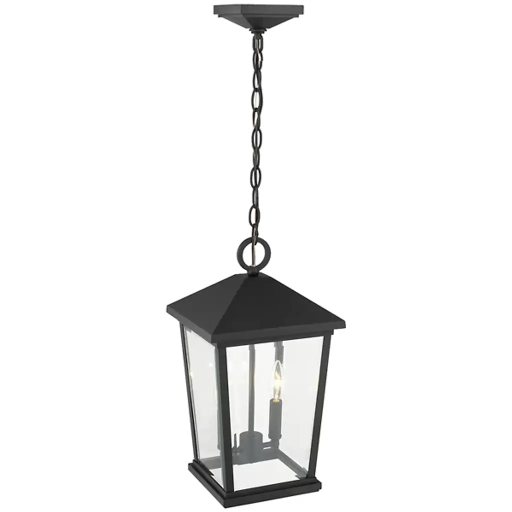 The Laughton Outdoor Pendant from Alder & Ore transforms your outdoor spaces with a quaint, village-inspired design. Crafted with a tapered rectangular aluminum frame, it evokes a nautical-like housing silhouette. The candelabra-style bulb mounts and chain match this design, while clear beveled glass panels provide a see-through view. Elevate the ambiance of your decks, patios, gazebos, and porches with this ornate light, adding a soft, romantic style to your outdoor haven.