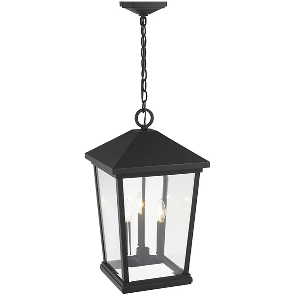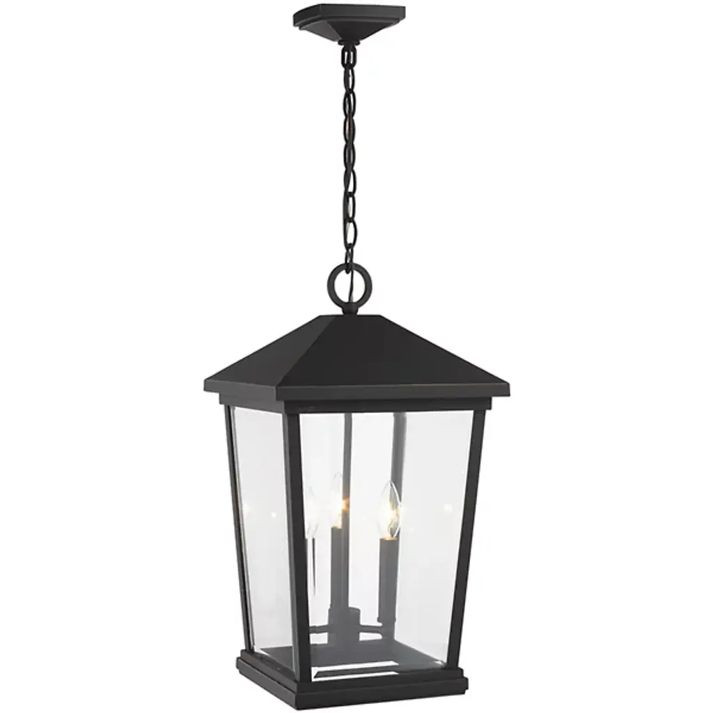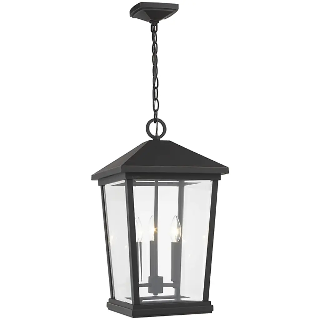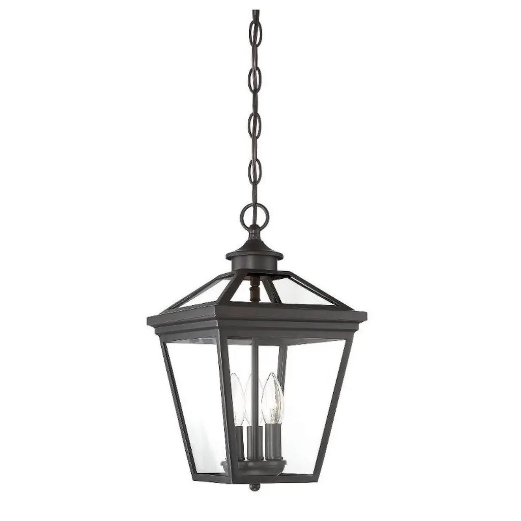The Laughton Outdoor Pendant from Alder & Ore transforms your outdoor spaces with a quaint, village-inspired design. Crafted with a tapered rectangular aluminum frame, it evokes a nautical-like housing silhouette. The candelabra-style bulb mounts and chain match this design, while clear beveled glass panels provide a see-through view. Elevate the ambiance of your decks, patios, gazebos, and porches with this ornate light, adding a soft, romantic style to your outdoor haven.