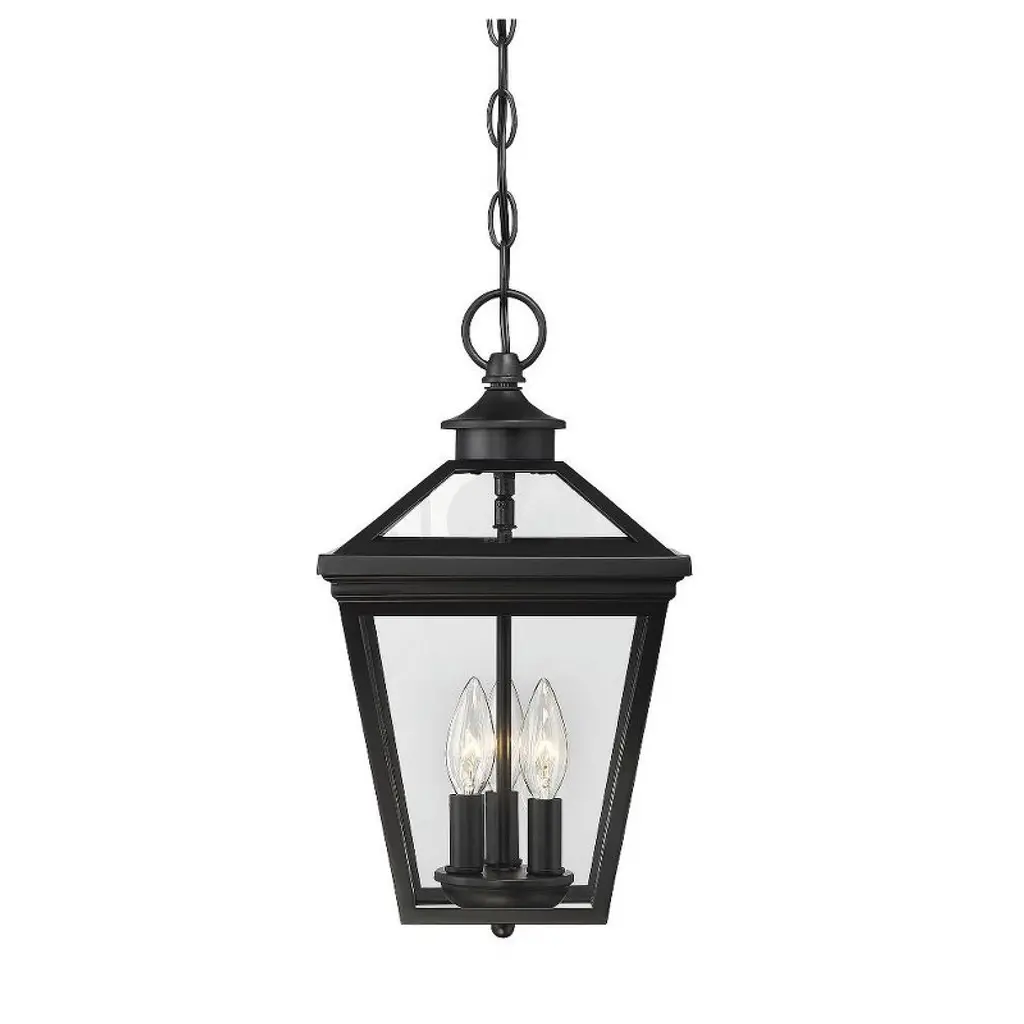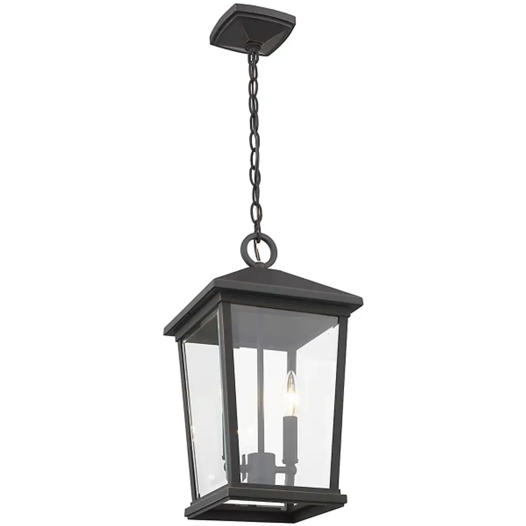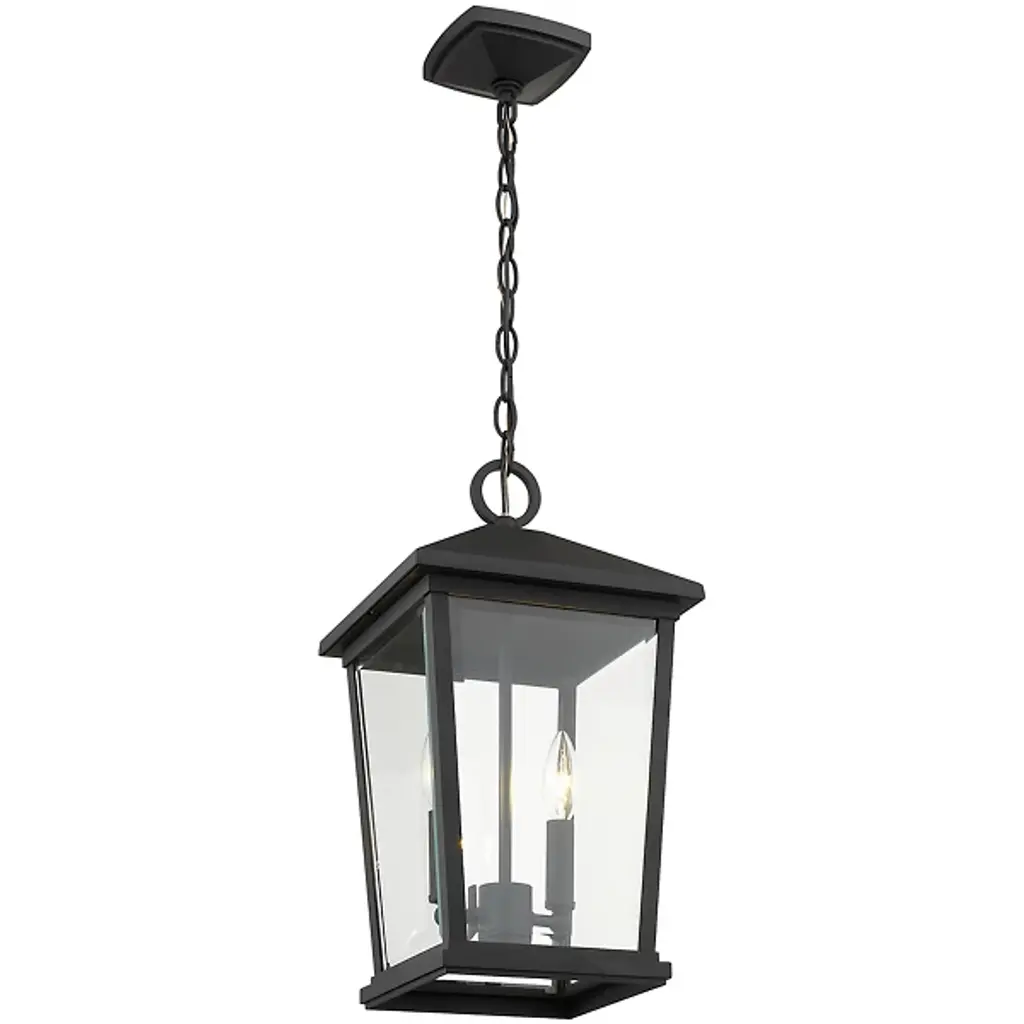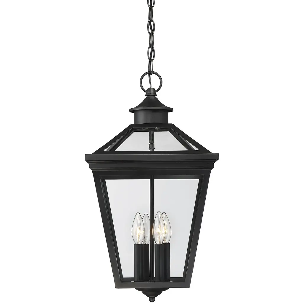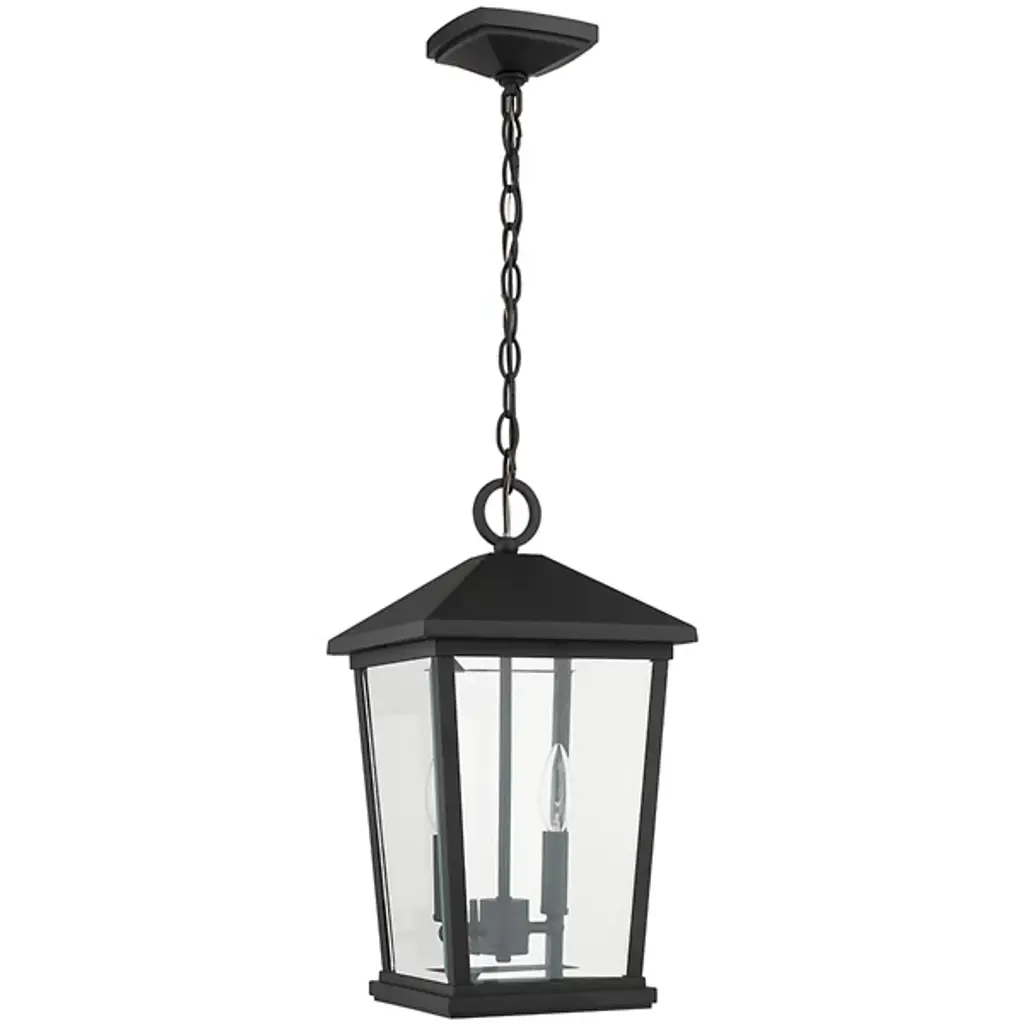The Laughton Outdoor Pendant from Alder & Ore transforms your outdoor spaces with a quaint, village-inspired design. Crafted with a tapered rectangular aluminum frame, it evokes a nautical-like housing silhouette. The candelabra-style bulb mounts and chain match this design, while clear beveled glass panels provide a see-through view. Elevate the ambiance of your decks, patios, gazebos, and porches with this ornate light, adding a soft, romantic style to your outdoor haven.