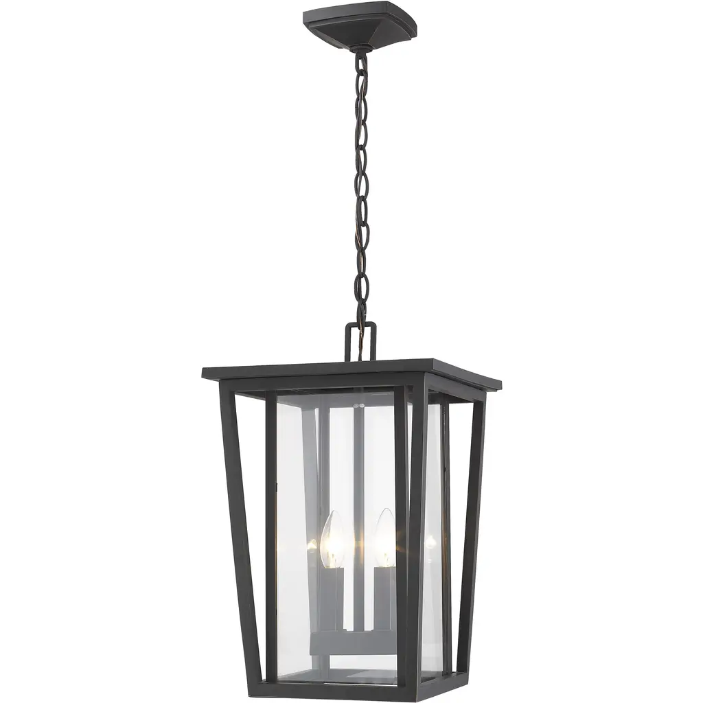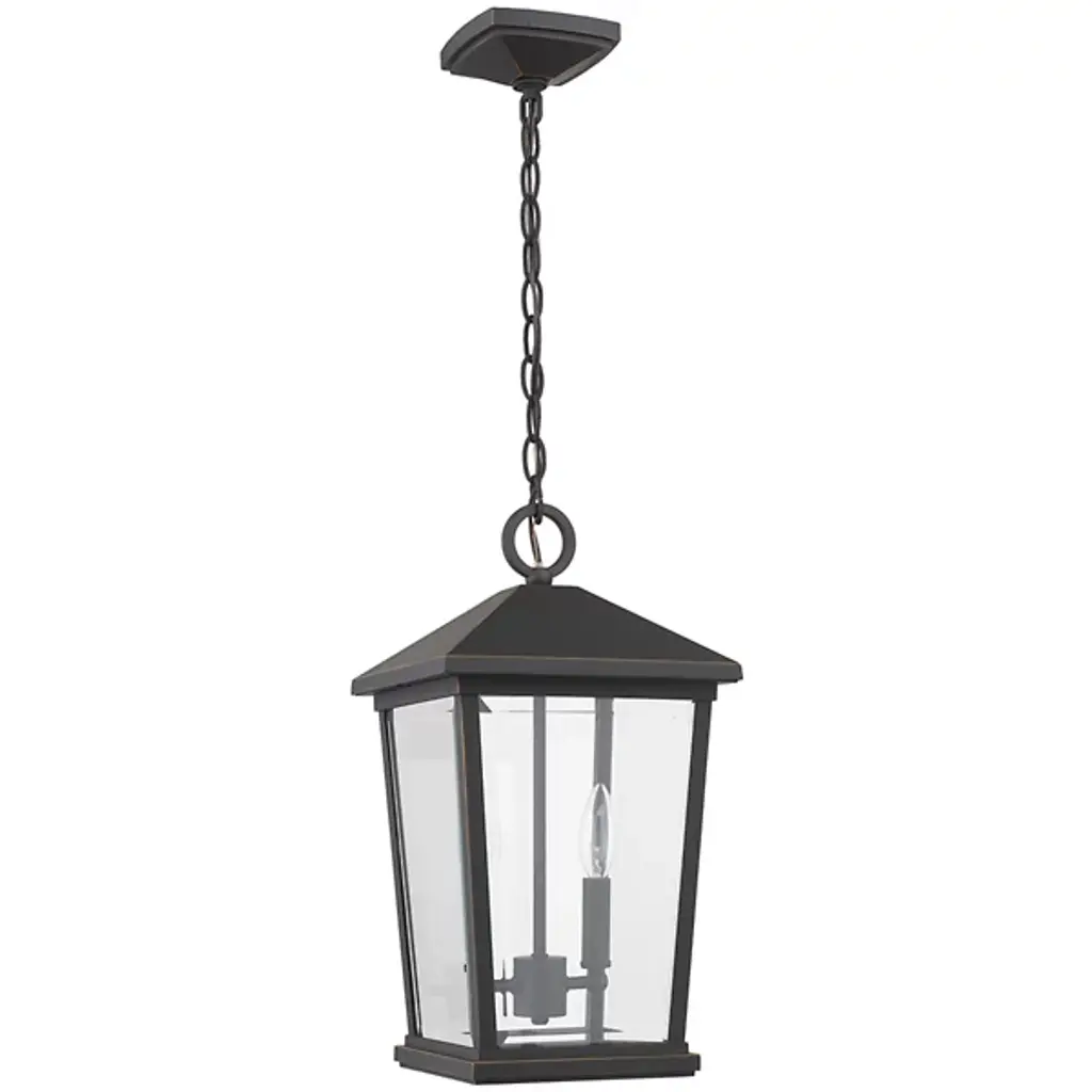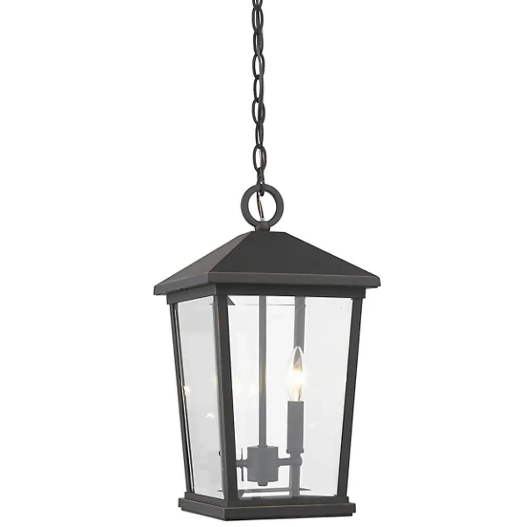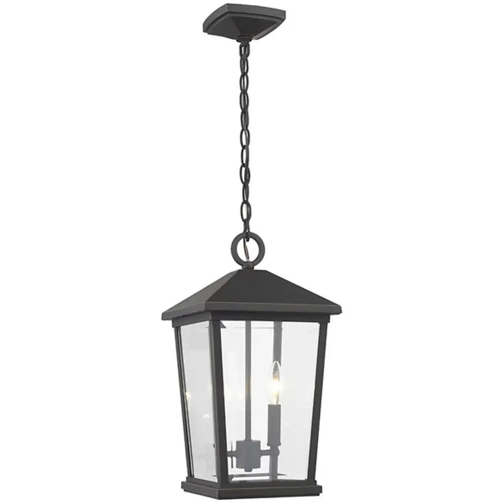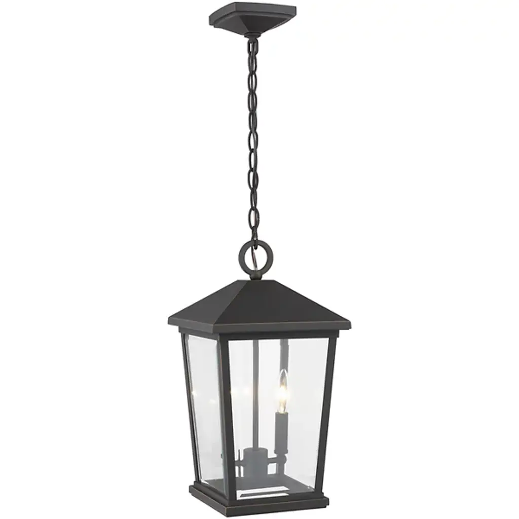The Laughton Outdoor Pendant from Alder & Ore transforms your outdoor spaces with a quaint, village-inspired design. Crafted with a tapered rectangular aluminum frame, it evokes a nautical-like housing silhouette. The candelabra-style bulb mounts and chain match this design, while clear beveled glass panels provide a see-through view. Elevate the ambiance of your decks, patios, gazebos, and porches with this ornate light, adding a soft, romantic style to your outdoor haven.