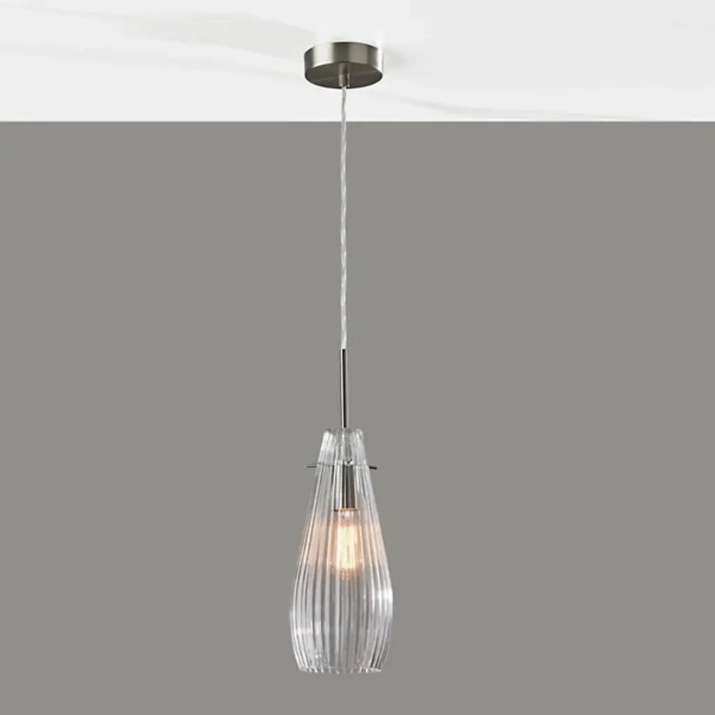 The Layla Mini Pendant by Adesso brings a blend of mid-century modern and vintage style to the spaces it brightens. With a slim silhouette, a ribbed glass shade is suspended with a clear cord from a round canopy and has a sleek, teardrop shape that adds a dynamic touch to the layer of light it filters throughout its form. The slightly visible bulb within gives this piece a captivating touch, and the metal elements adding structure to this pendant are completed with a lovely finish that adds a tailored touch to this elegant addition to spaces.