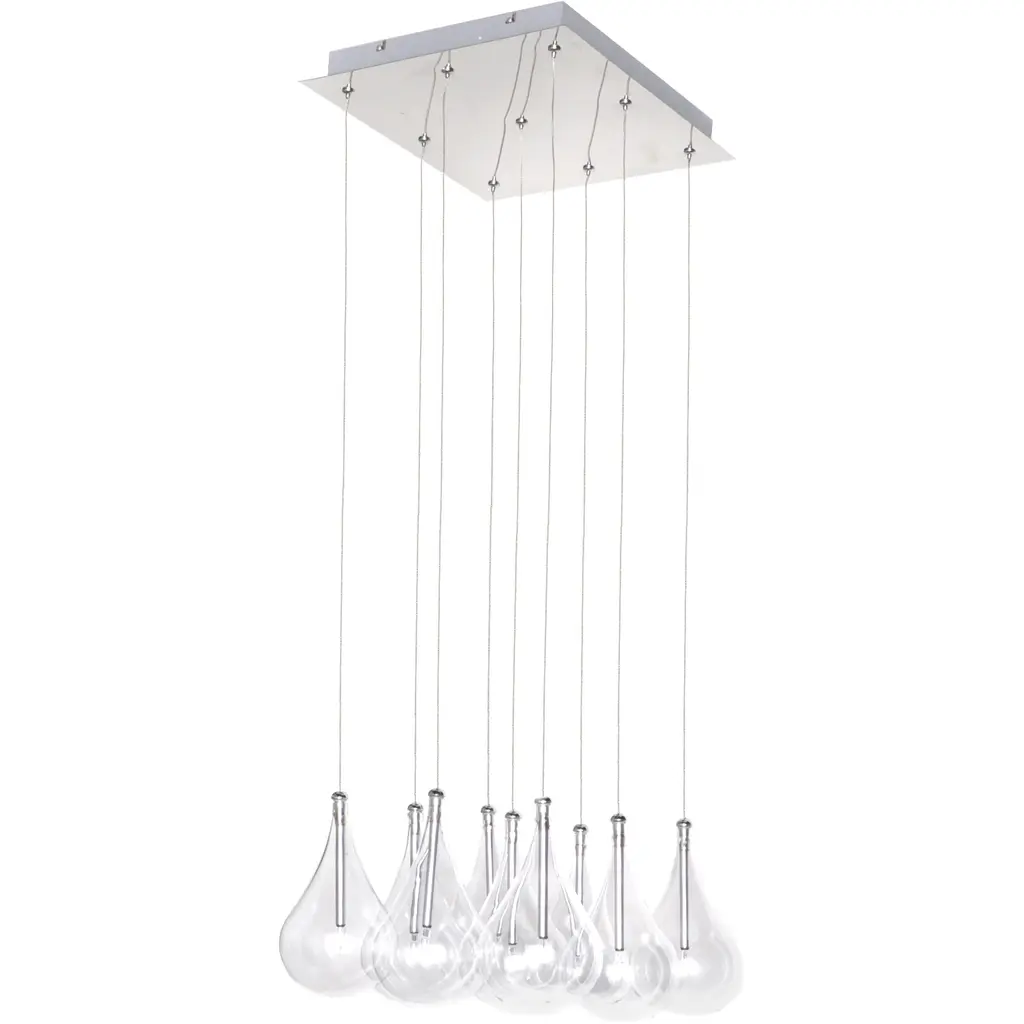 A soft shimmer plays surprisingly well with a sharp-lined shape in ET2s Lazio 9 Light Pendant. Lazios gleaming metal finish doesnt go overboard in providing a shine to your space and nicely complements the nine teardrop-shaped glimmering glass shades. Bulbs included, Lazio incorporates well into both domestic and professional modern-style settings due to its easygoing yet elegant design and ample amount of bright yet gentle light.12"w x 8"h Canopy: 7"w x 10.25"d x 1.25"h Wire Length: 70"