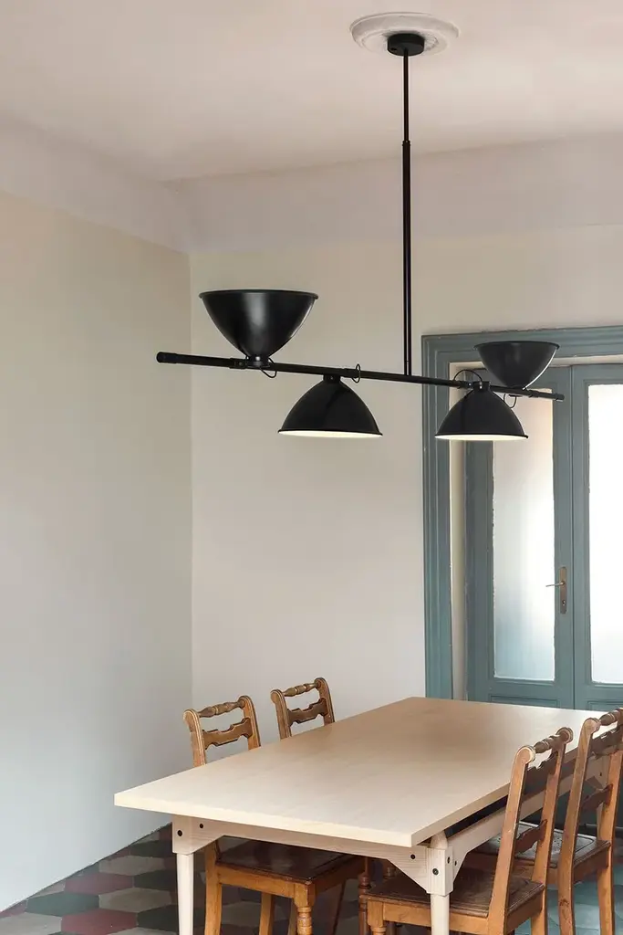 LBB01 is an aluminum pendant lamp. For the Casa de Vidro, a symbolic project of Brazilian modernist architecture, Lina Bo Bardi designed in 1950 LBB01, a paradigm in the world of lighting. An essential and geometric design in which lines and volumes touch and intersect, in total continuity with the design style of the house in São Paulo. The telescopic stem and 360° adjustable diffusers in black painted aluminium allow direct and indirect lighting, while the interior finish is matt white.Source: 4x E27Total power: 4x60WEmission: diffusedIP class: 20Orientable diffuser 340°