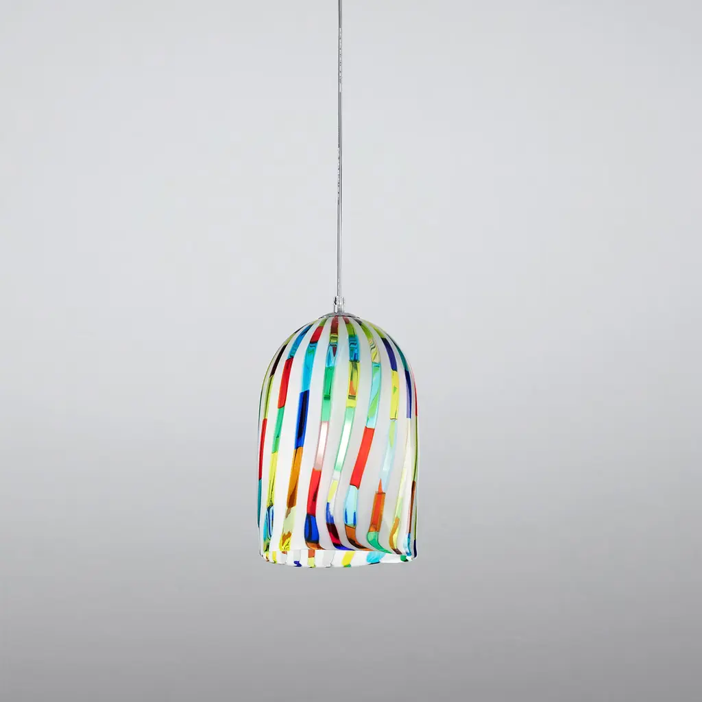 The perfect lighting solution to brighten up monochromatic settings with its vibrant, polychrome design, this pendant lamp stands out for its excellent quality and unreplicable aesthetic. Its bell-shaped diffuser is obtained by the fusion of multicolor glass sticks, painstakingly assembled and finished by hand to create a playful pattern delivering a joyful feel wherever it is placed.
