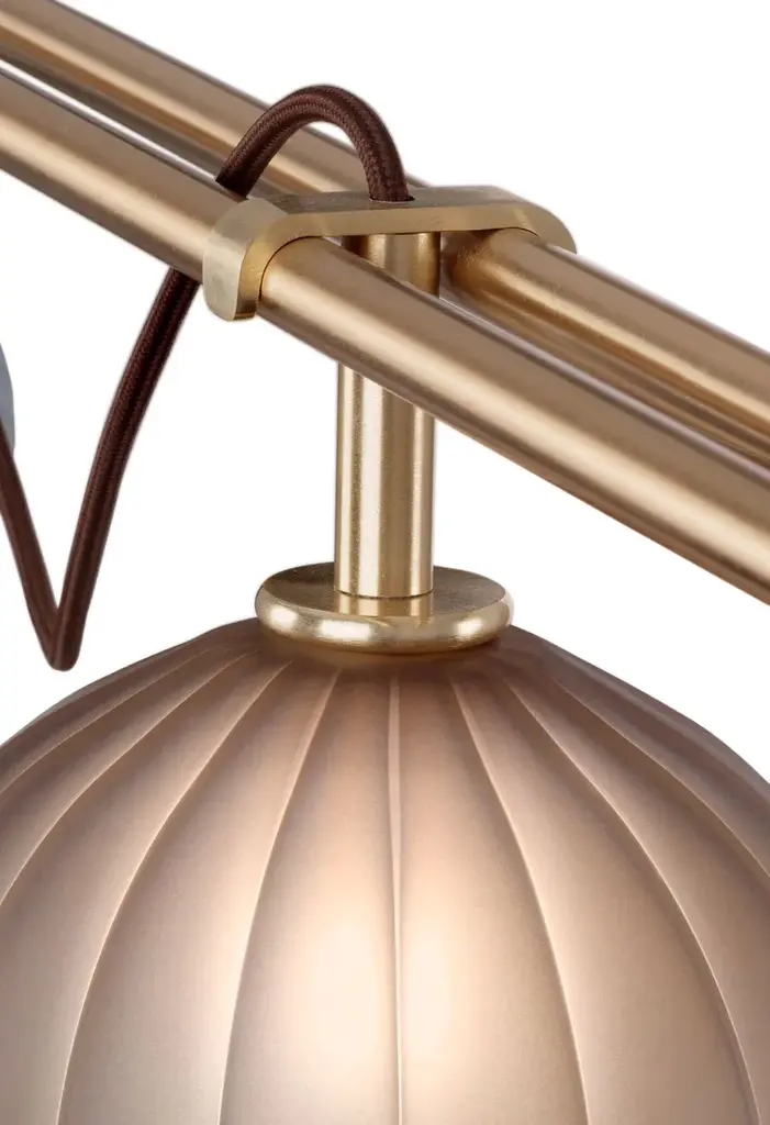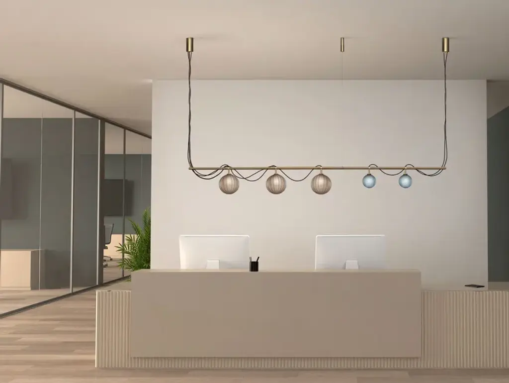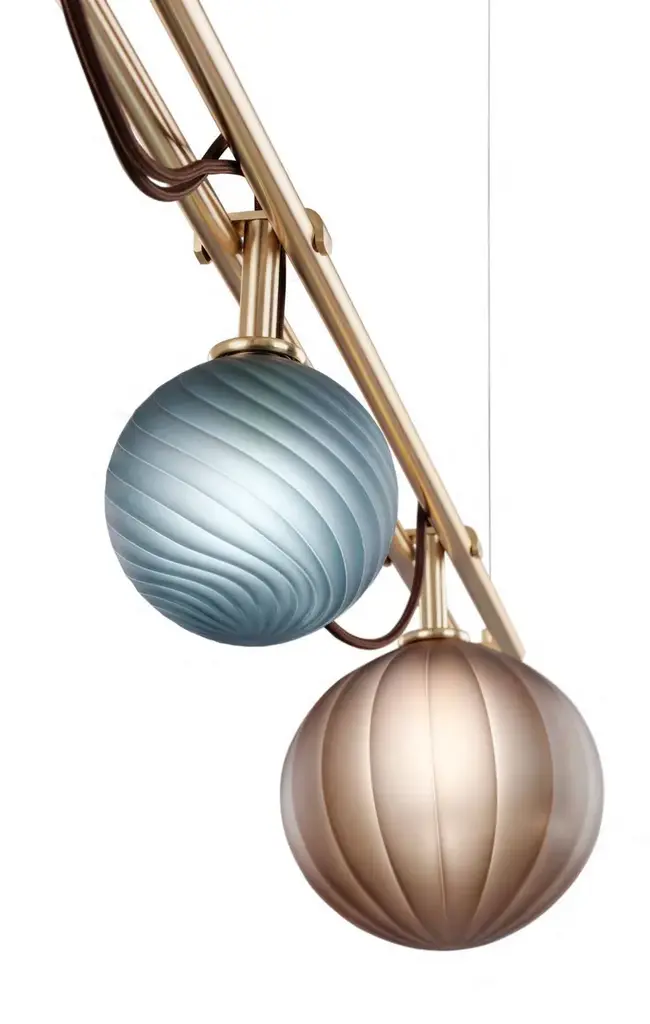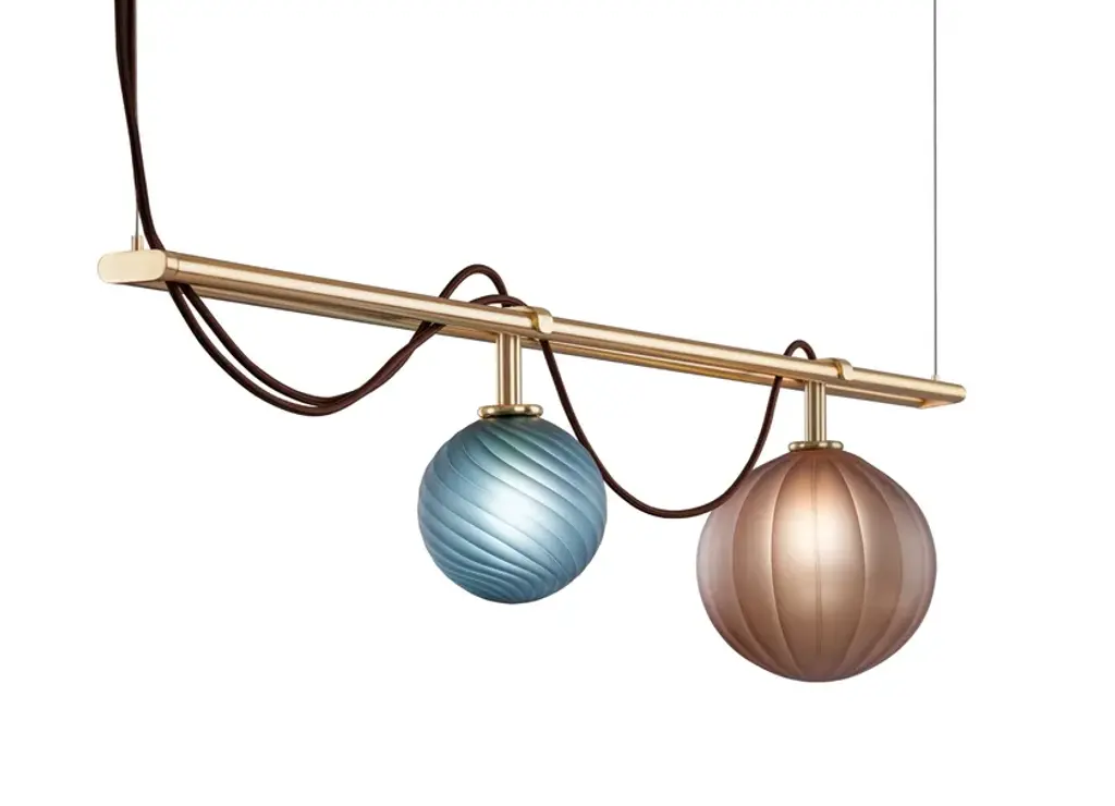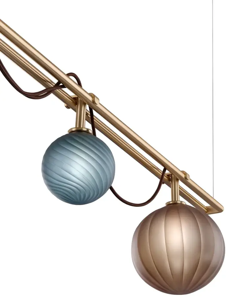 Le Perle is a modular system that allows larger configurations. Request ad hoc project that best suits your spaces. Borosilicate spheres with different possible textures: smooth, straight ribbed, twisted ribbed. A complex but simple-looking apparatus.Just like a sequence of pearls worn in a precious necklace.Finish: Satin gold, Ral matt black. Other finishes on request. Color: Borosilicate glass spheres in satin fumè, satin tobacco, satin teal blue, satin aquamarine, satin viridian colors. Other colors on request.Le perle big: 2 bulb G9 x max 7W - 220 Vdc - 4,5 Kg - 0,108 V3Le perle medium: 2 bulb G9 x max 7W - 220 Vdc - 2,7 Kg - 0,108 V3Le perle small: 1 bulb G9 x max 7W - 220 Vdc - 1,8 Kg - 0,105 V3Le perle big+small: 3 bulb G9 x max 7W - 220 Vdc - 6 Kg - 0,300 V3