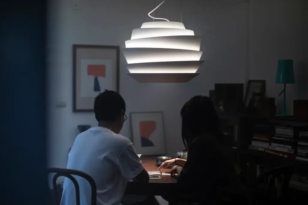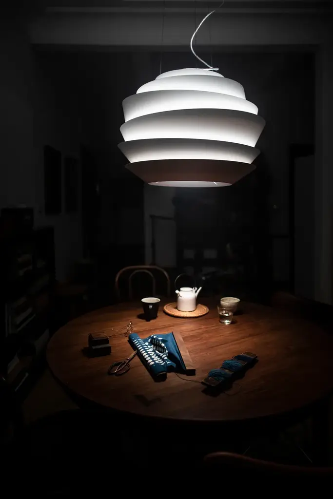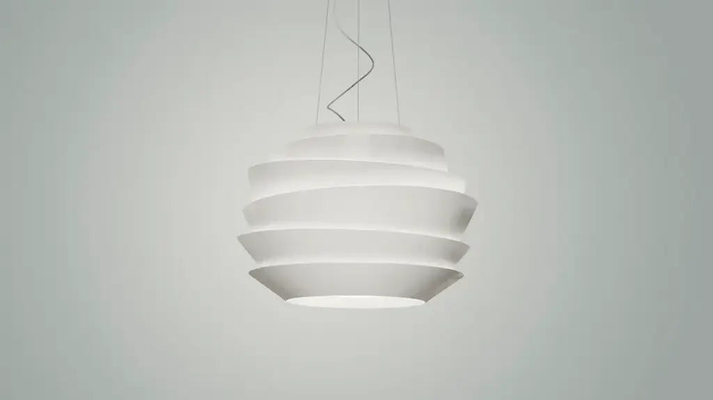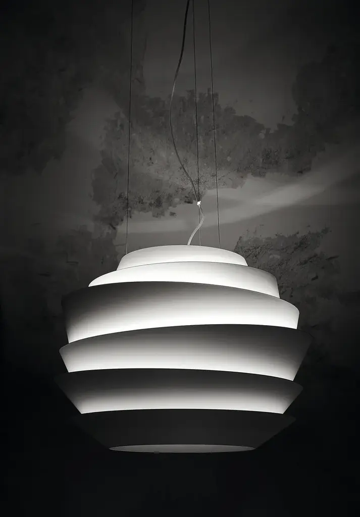 Le Soleil is a pendant lamp made of vernished injection moulded polycarbonate and vernished metal.LIGHT SOURCELe Soleil220 / 240 VLED retrofit, Fluo 25WE27No dimmableIP 20Bulb not includedLe Soleil LED220 / 240 VLED included 46W2700 K 4460 lm CRI>90Dimmable On-Off/Push/DALIIP 20A suspended work of architecture, suggesting the profile of the Guggenheim Museum in New York. The irregular bands add dynamism to the volume and make its image differ depending on the vantage point, in a unique game of reflected and diffused light. A true focal point.