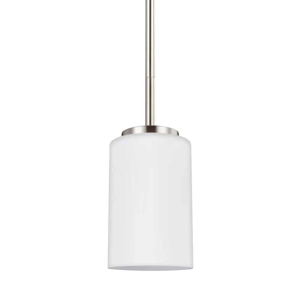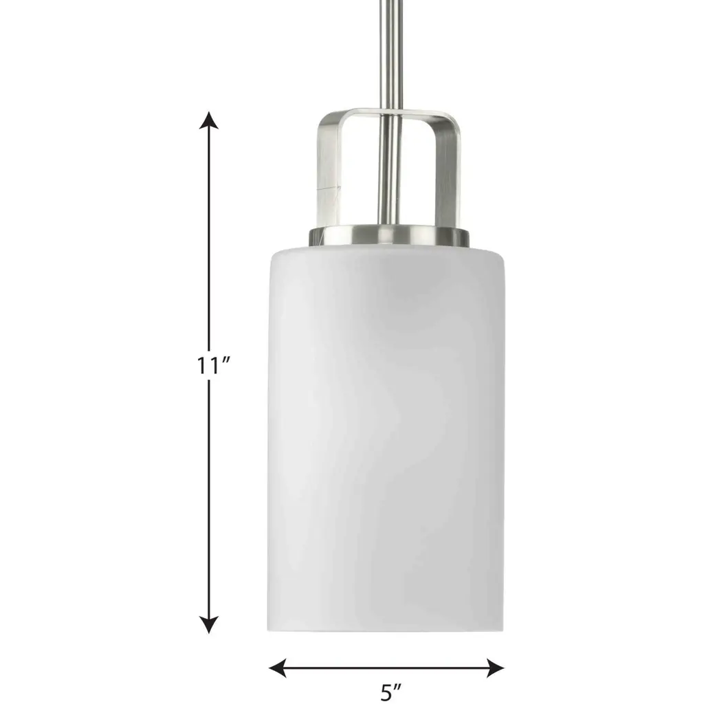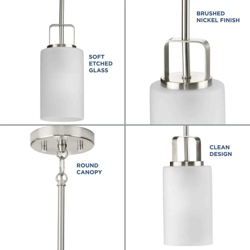 Distinguish your home with clean modern design with the League Collection One-Light Brushed Nickel and Etched Glass Modern Farmhouse Mini-Pendant Hanging Light ideal for any kitchen island, dining room table, foyer, entryway, breakfast nook, or home bar. The sleek stem and metal details are coated in a beautiful brushed nickel finish to create a modern aesthetic. Classic etched glass shades emphasize the contrast between soft and clean.