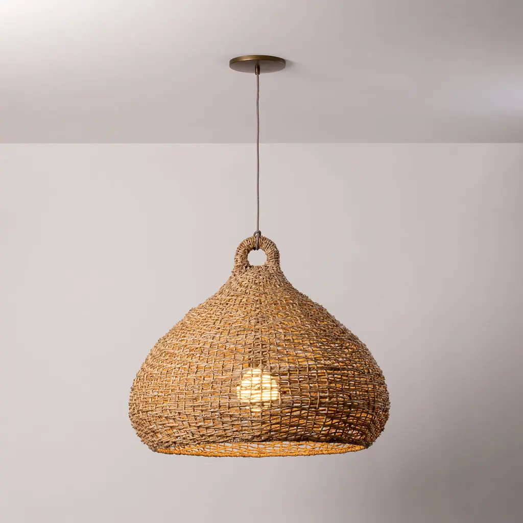 Lechlan takes the silhouette of an acorn cap and gives it a twist. Handwoven from Natural Kalas Abaca in a dense crosshatch pattern, the shade features a decorative loop at the top. A fabric-covered cord wraps through the loop, complementing the laid-back energy of the design. Available in two sizes, this pendant light provides a warm welcome home.*Due to the one-of-a-kind nature of the medium, exact colors and patterns may vary slightly from the image shown.