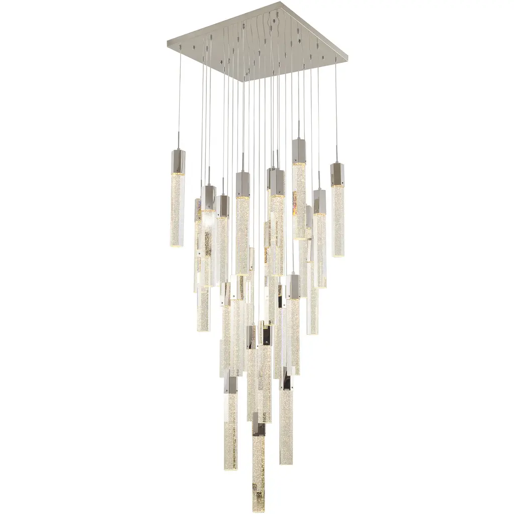 Elongated metal tubes in a variety of finishes from Rose Gold to Polished Chrome suspend from pans to create impressive sculptural statements. Each tube encase a replaceable integrated LED module while many of the ceiling pans house additional LED spots to highlight the beautiful high gloss finishes as well as additional down light.