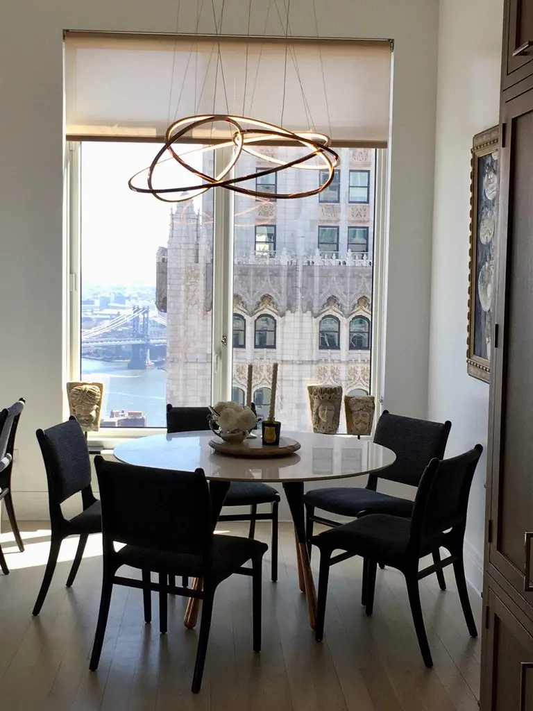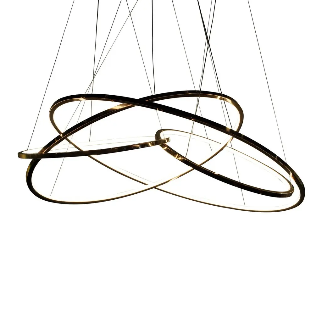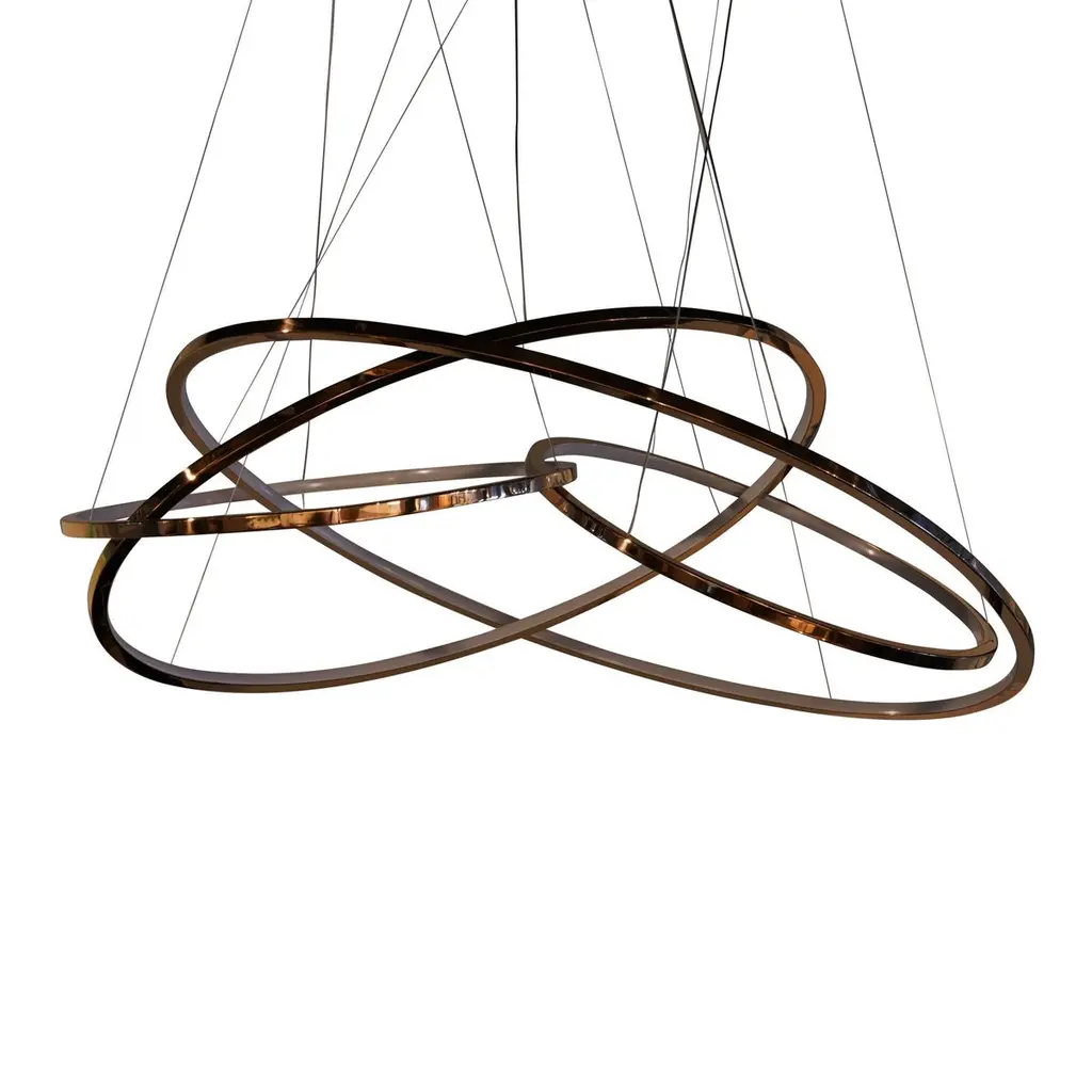 Individual oval rings with integrated LED stripes grouped together.We offer four standard sizes with 3, 4, 5 or 7 rings. Height and tilt of rings can be adjusted.Can be customized to your specifications. Finishes: Rose copper, polishedGold, polished or brushedBronze, polished or brushedChrome, polished or brushedBlack nickel, polished or brushedStandard size: 4 rings: 47"L x 29"W x adjustable height.