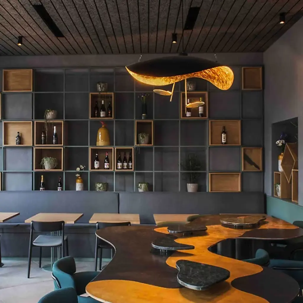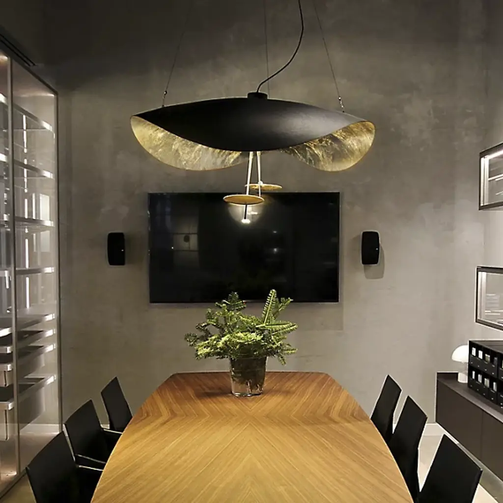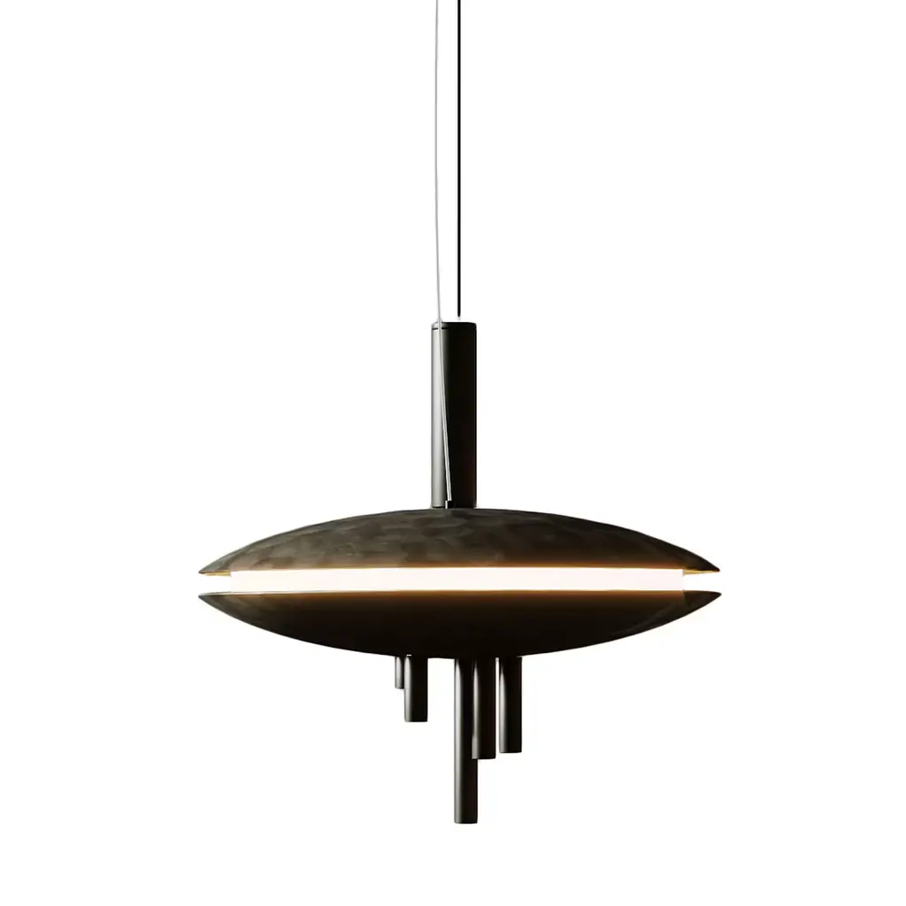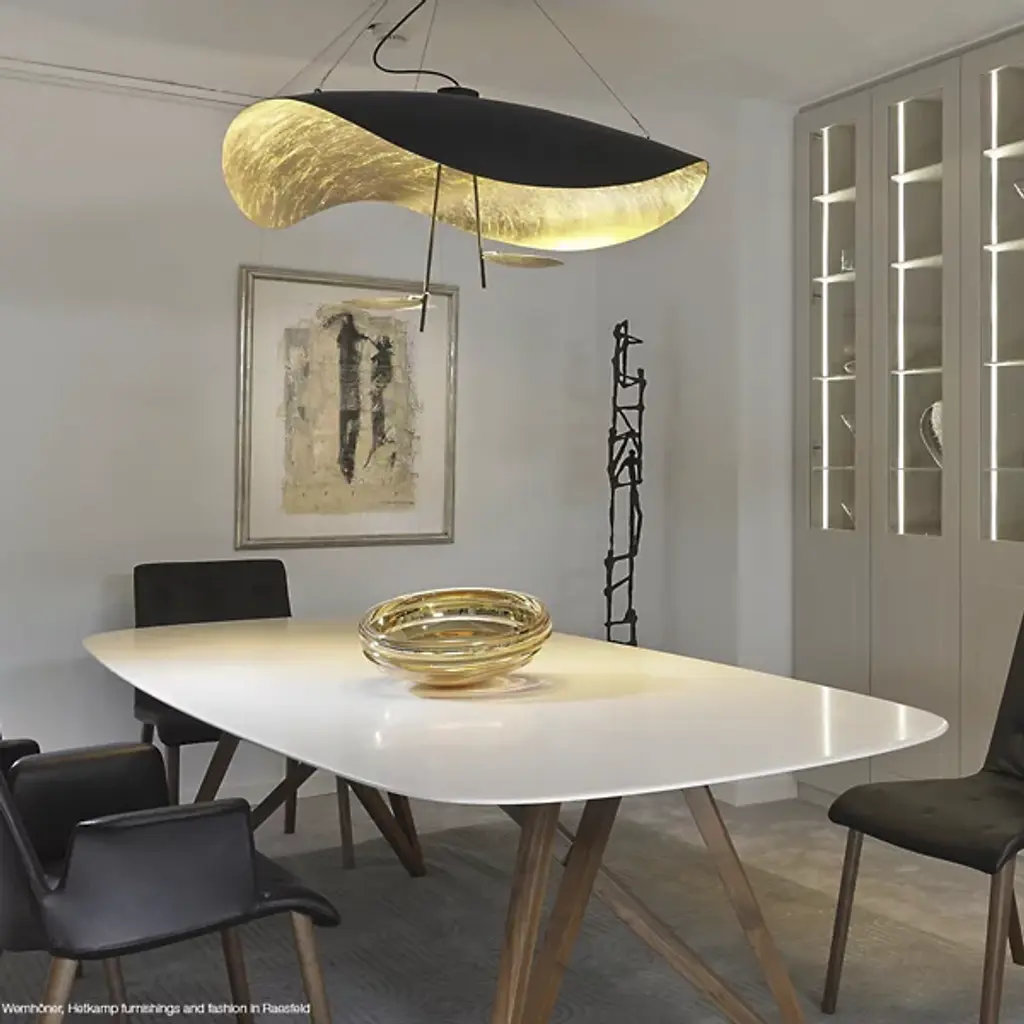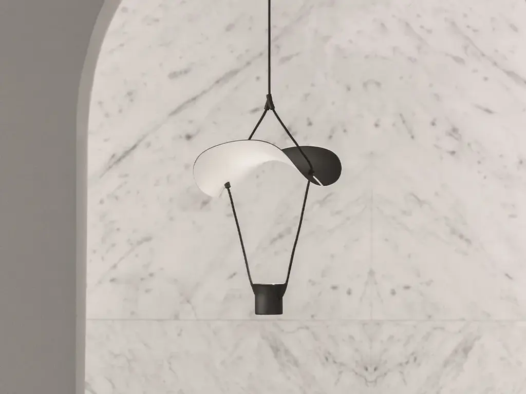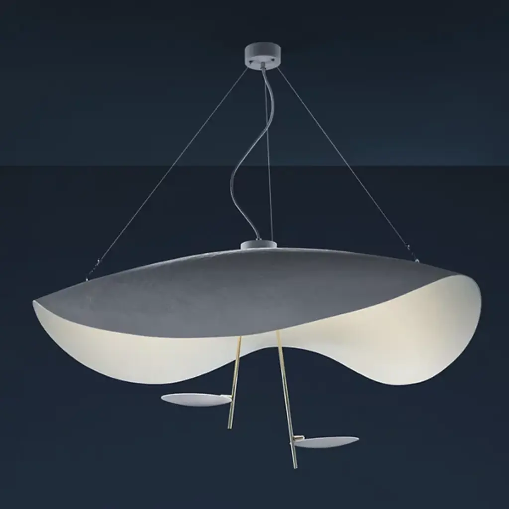 The Lederam S2 Manta LED Pendant from Catellani & Smith offers an unforgettable and artistic appeal to its surroundings. A design piece ideal for high-ceilinged spaces, its subtle shape represents the linear accuracy of the motion that is needed to draw a line, supported by a central round canopy and bracing guylines. The suspension appears to float in midair, supporting a curving fiberglass shade that surrounds LED lamping, while slender metal rods with aluminum discs emerge below, reflecting downlight back up and creating a layered illumination around the airy fixture design.