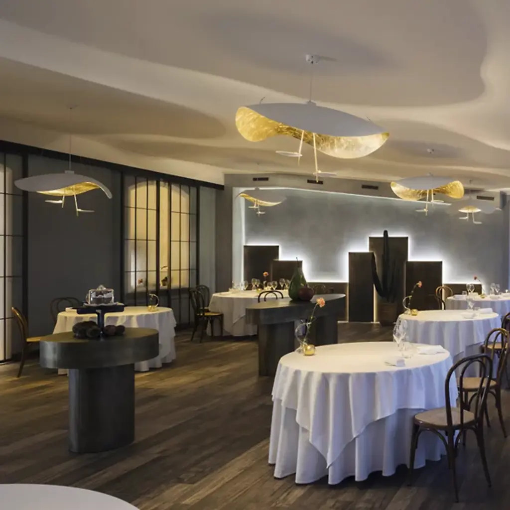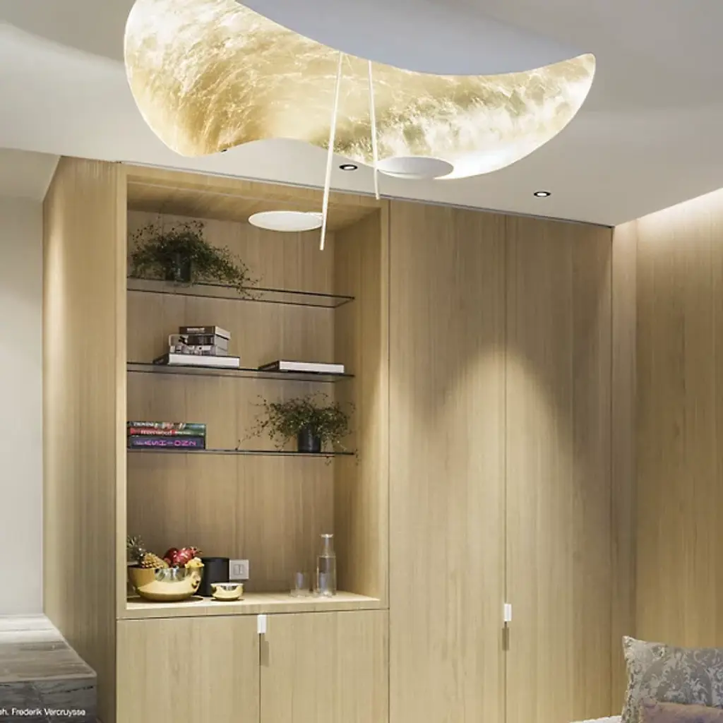 The Lederam S2 Manta LED Pendant from Catellani & Smith offers an unforgettable and artistic appeal to its surroundings. A design piece ideal for high-ceilinged spaces, its subtle shape represents the linear accuracy of the motion that is needed to draw a line, supported by a central round canopy and bracing guylines. The suspension appears to float in midair, supporting a curving fiberglass shade that surrounds LED lamping, while slender metal rods with aluminum discs emerge below, reflecting downlight back up and creating a layered illumination around the airy fixture design.