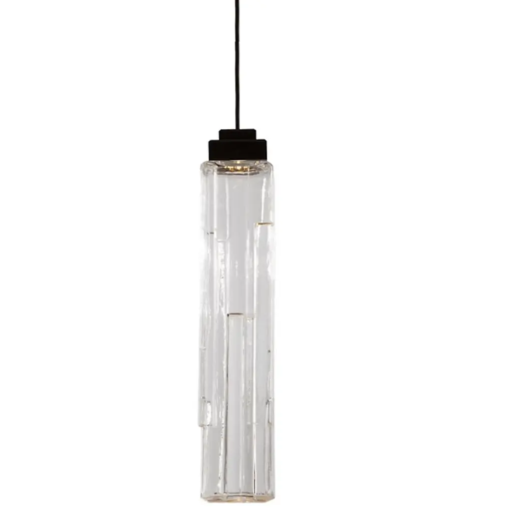 Take a piece of a stunning crystal cave formation and add it to your contemporary space with the Ledgestone LED Mini Pendant from Hammerton Studio. An unassuming ceiling mount slightly flares out and extends a simple matching downrod that leads to a tiered metal cap. The body of the piece is a sculpted, hand-blown glass cylinder that resembles a natural rock display. An integrated LED rests within the shade and diffuses warmly through the clear material.