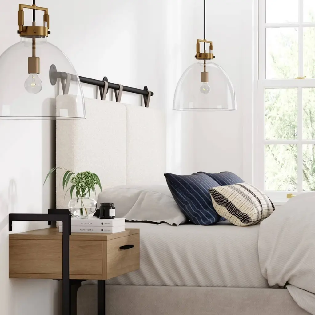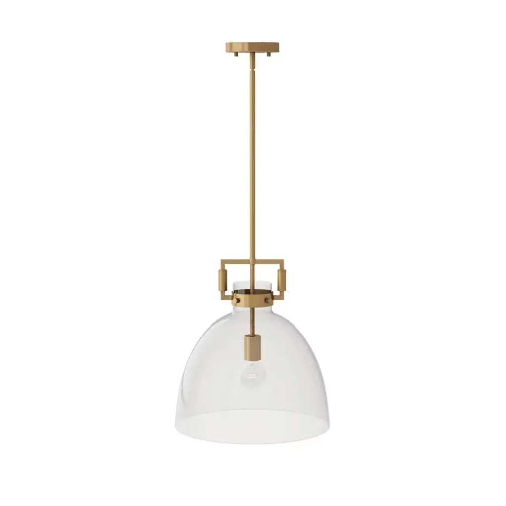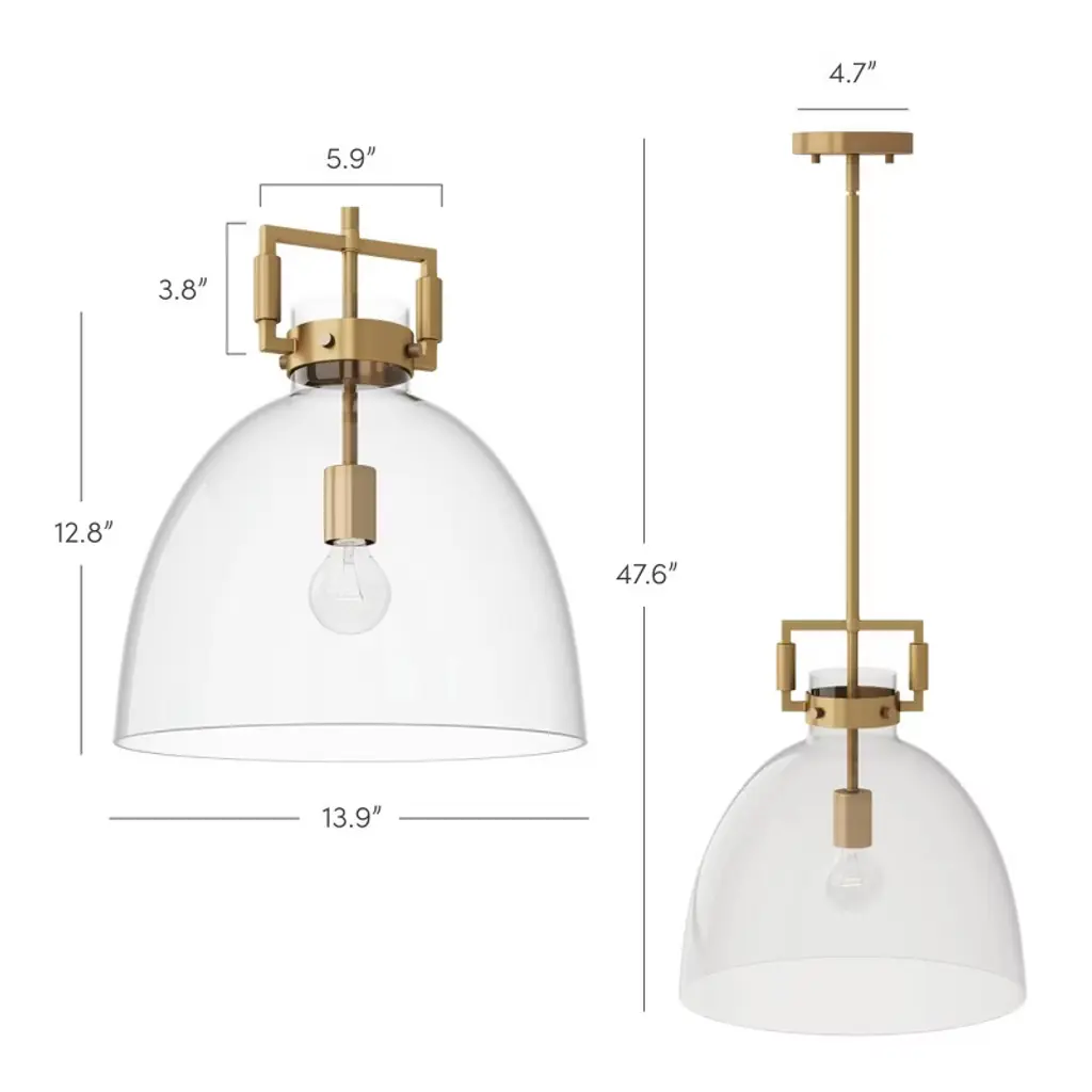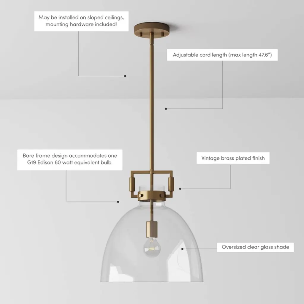 Crafted of a simple silhouette of vintaged brass, the Leigh pendant light is as elegant as it is industrial. It's oversized clear glass shade adds a striking dramatic effect to the room, while also providing plenty of warmth. The vintaged brass and glass mixed materials are meant to elevate your home and adds a timeless touch to any aesthetic. This single pendant light has an adjustable height, making it perfect for pairing in the kitchen, in an entryway, or above your bedside tables.