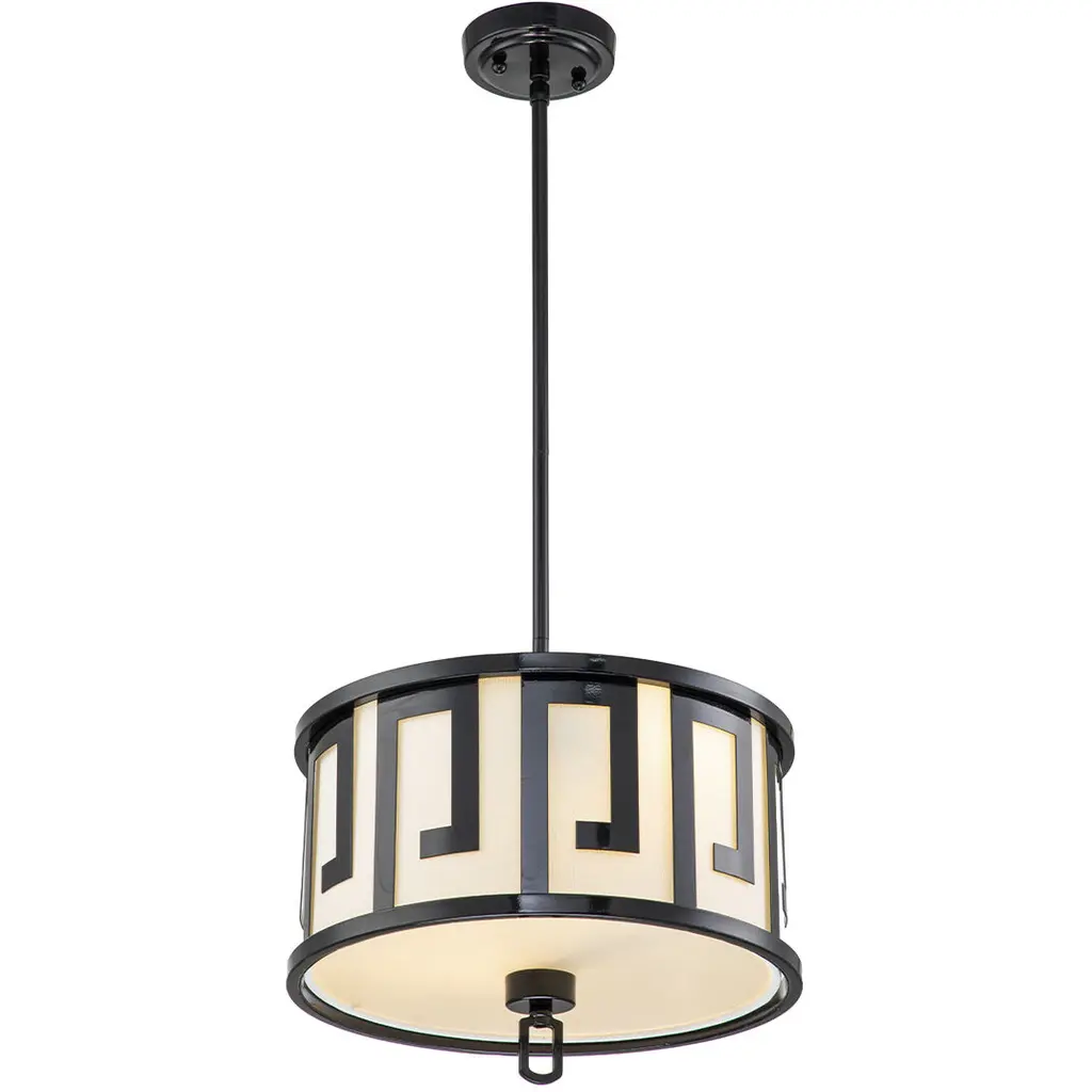 Our Flambeau inspired kitchen pendant is designed with a classic Greek key like metal outer drum with an ivory linen inner shade made into a hanging adjustable pendant creating a striking focal point. In the black finish, it is the perfect addition to your bedroom, kitchen, or over your bar. We finished this pendant with a white acrylic diffuser for soft light without the glare. Our Large Lemuria Pendant is shipped with extra stems for adjustable length, and can be installed as a semi-flush mount fixture for use in hallways and closets.