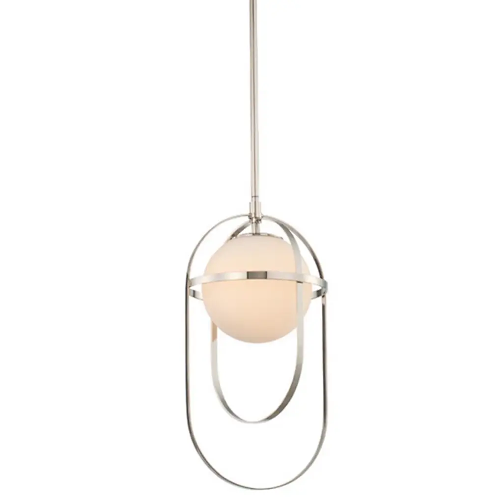 Enhance your interiors with the arcing sculptural lines of the Lennox Mini Pendant by Kalco Lighting. A modern fixture at heart, it starts by extending a single long stem down from a sleek disc canopy, blooming a single socket lamp from its base. Excess glare is adroitly blunted by a spherical glass shade that sends out a wide-reaching ambiance, while an equatorial metal band braces swooping oval accents that add a sense of motion to the fixture, even as it stands still.