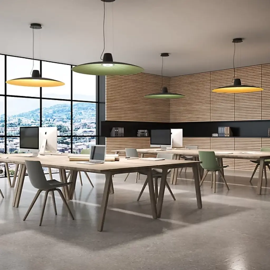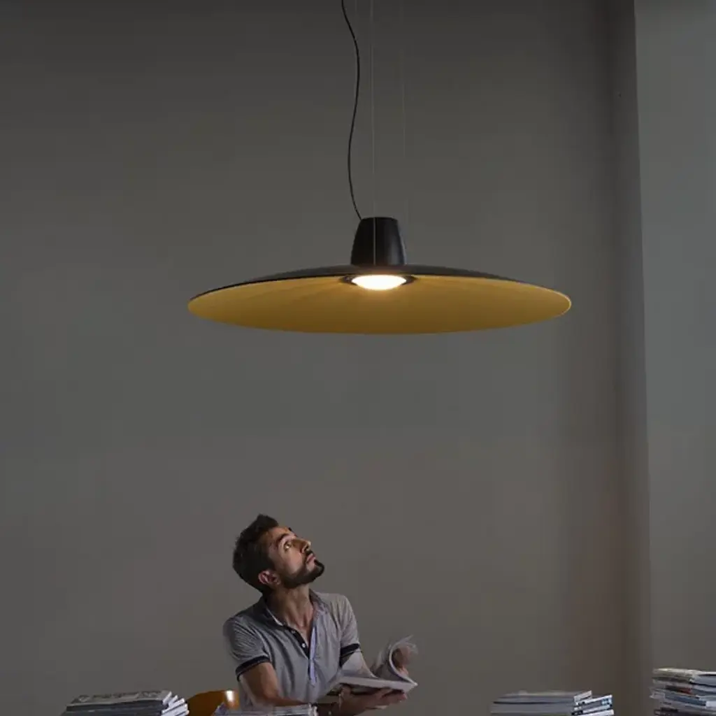 Elevate interiors with the stately suspension of the Lent LED Pendant from Martinelli Luce. Made in Italy and designed by Yonoh Studio, its expansive construction contains multitudes, fusing both form and function in an award-winning expressiveness. Descending from a stepped, circular canopy along a series of slender cables, it places strong LED lamping inside a conical housing, while a Methacrylate diffuser moderates bright glare into a gentle glow. A large disc shade of sound-absorbing fabric extends around the central lamping, providing sound baffling, creating still air for clear conversations, and reflecting warm light below.